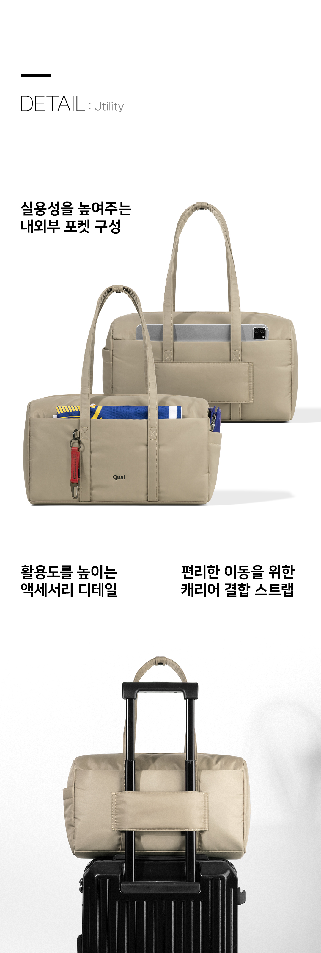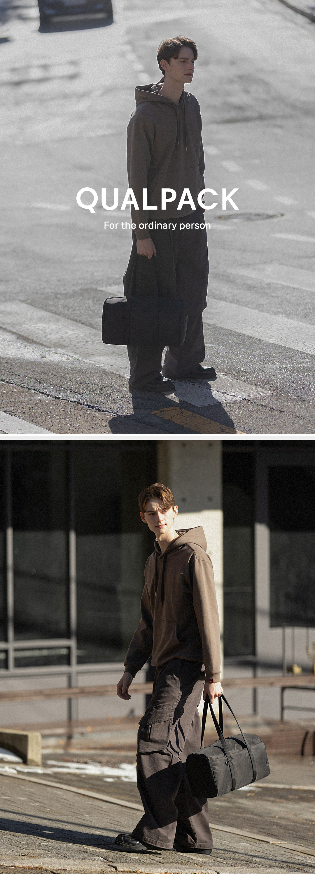 퀄팩(QUALPACK)은 특별한 순간보다 평범하고 익숙한 하루에 더 가까이 다가서며, 익숙함 속의 편안함과 실용성을 담아내는 데일리 백 브랜드입니다.