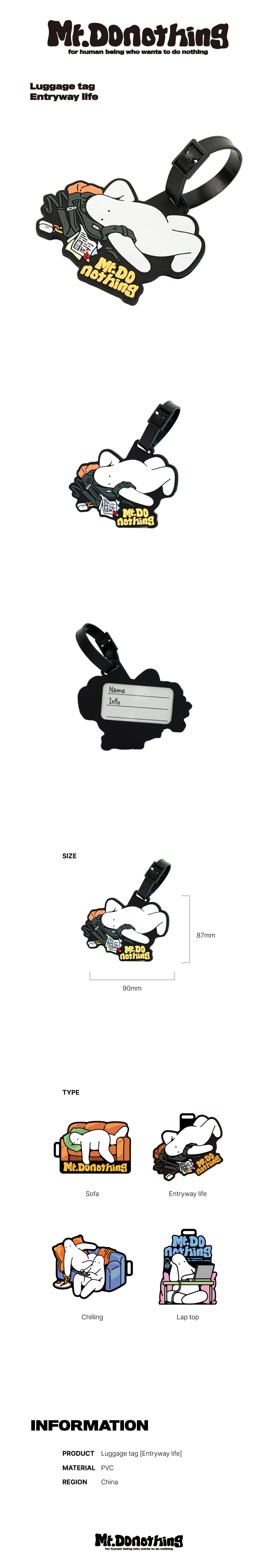 미스터두낫띵(MR.DONOTHING)은 이 시대에 살고 있는 사람들의 아무것도 하기 싫어하는 무기력한 일면을 모티브로 만든 '공감' 캐릭터입니다.