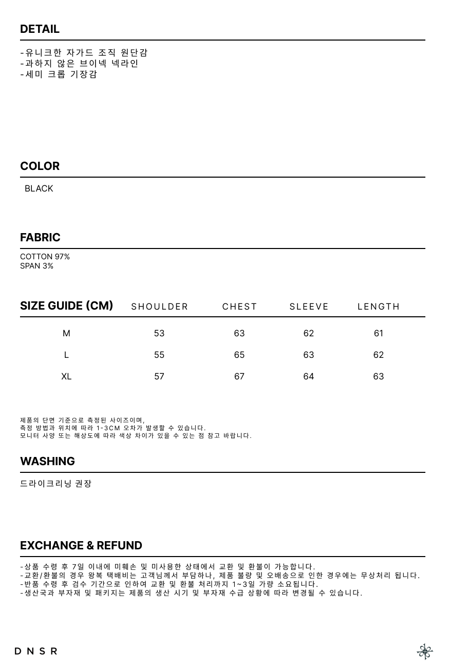 디앤에스알(DNSR)는 'Do New things, Something to realize'라는 슬로건을 바탕으로, 동시대에 흐름에 발 맞춰 항상 독창적이고 새로운 시도를 하고 있습니다. 디앤에스알의 DNA는 현대 복식을 기반으로 하는 오리지널리티의 견고한 테일러링을 고수하며 시대의 흐름을 읽고 변화하는 무드와 스타일링을 제안하는 스트릿 캐주얼 웨어입니다.