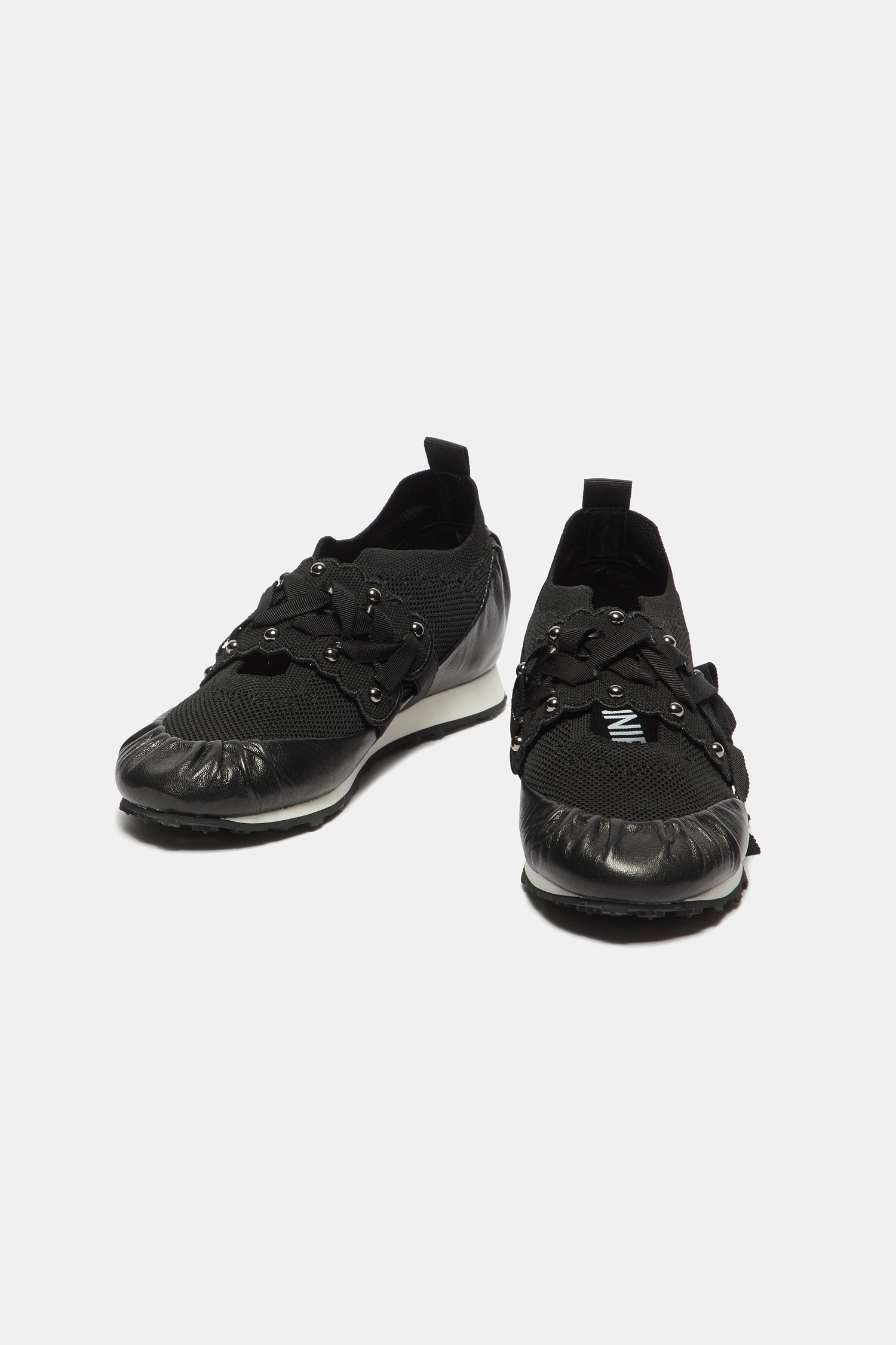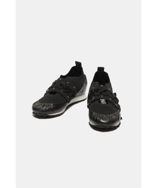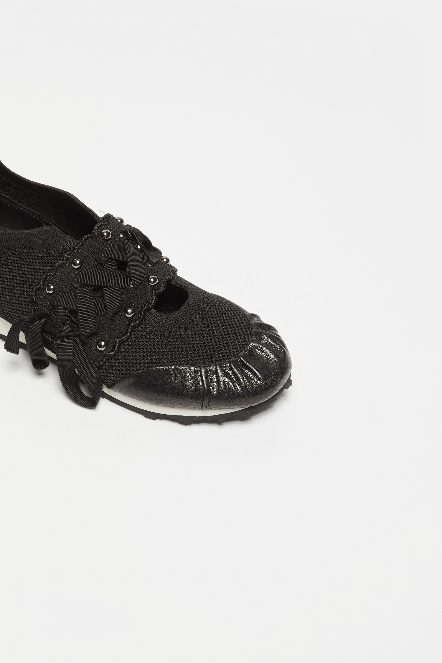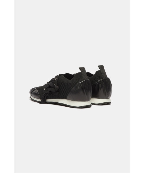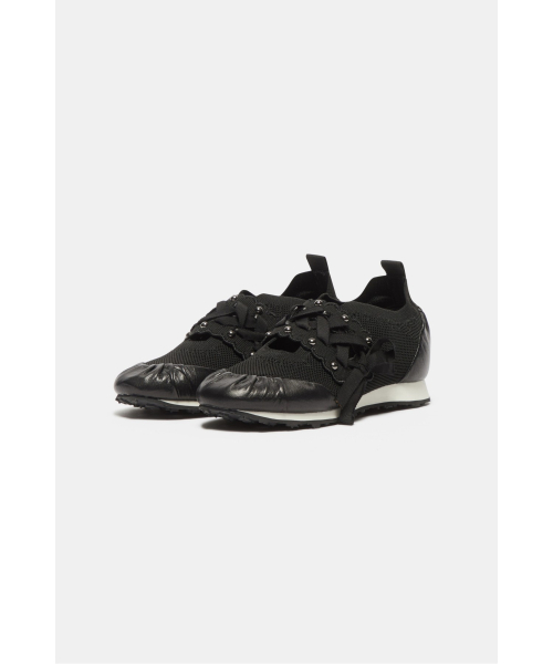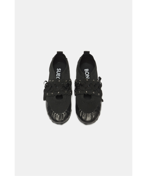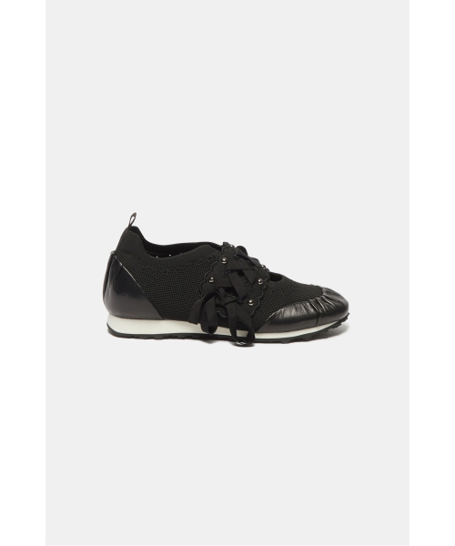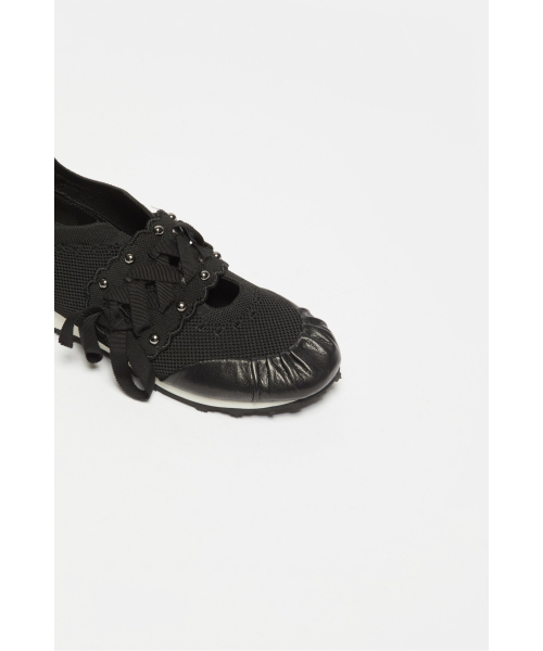 - 리본 레잉스업 디테일이 돋보이는 슬림 실루엣의 니트 스니커즈 디자인.