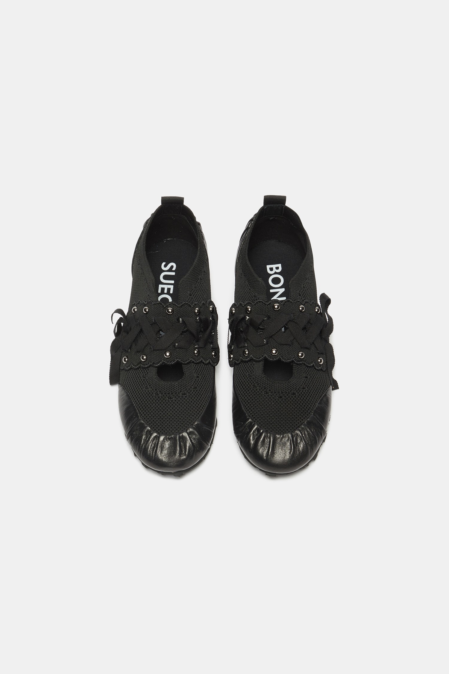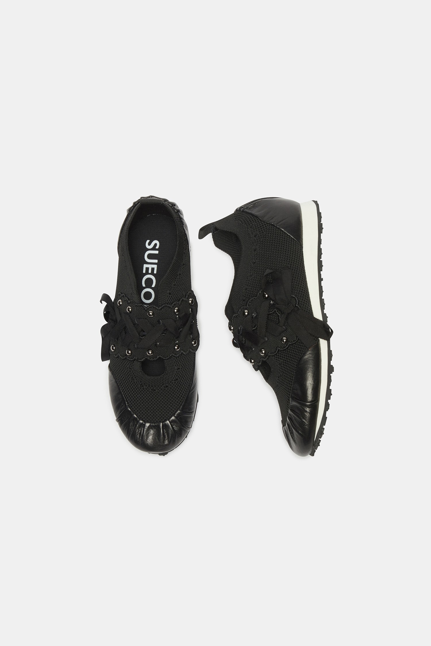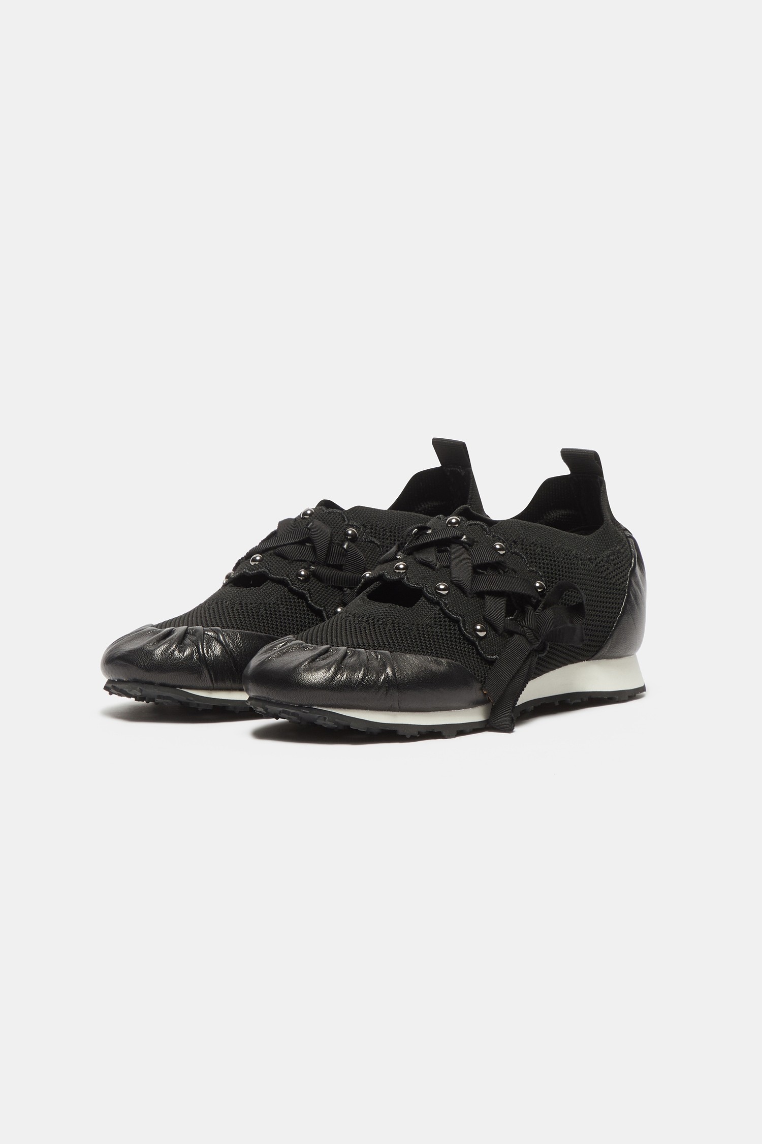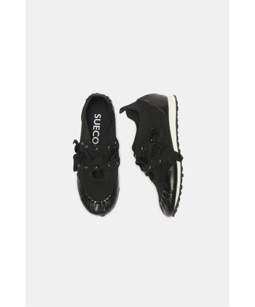 - 리본 레잉스업 디테일이 돋보이는 슬림 실루엣의 니트 스니커즈 디자인.