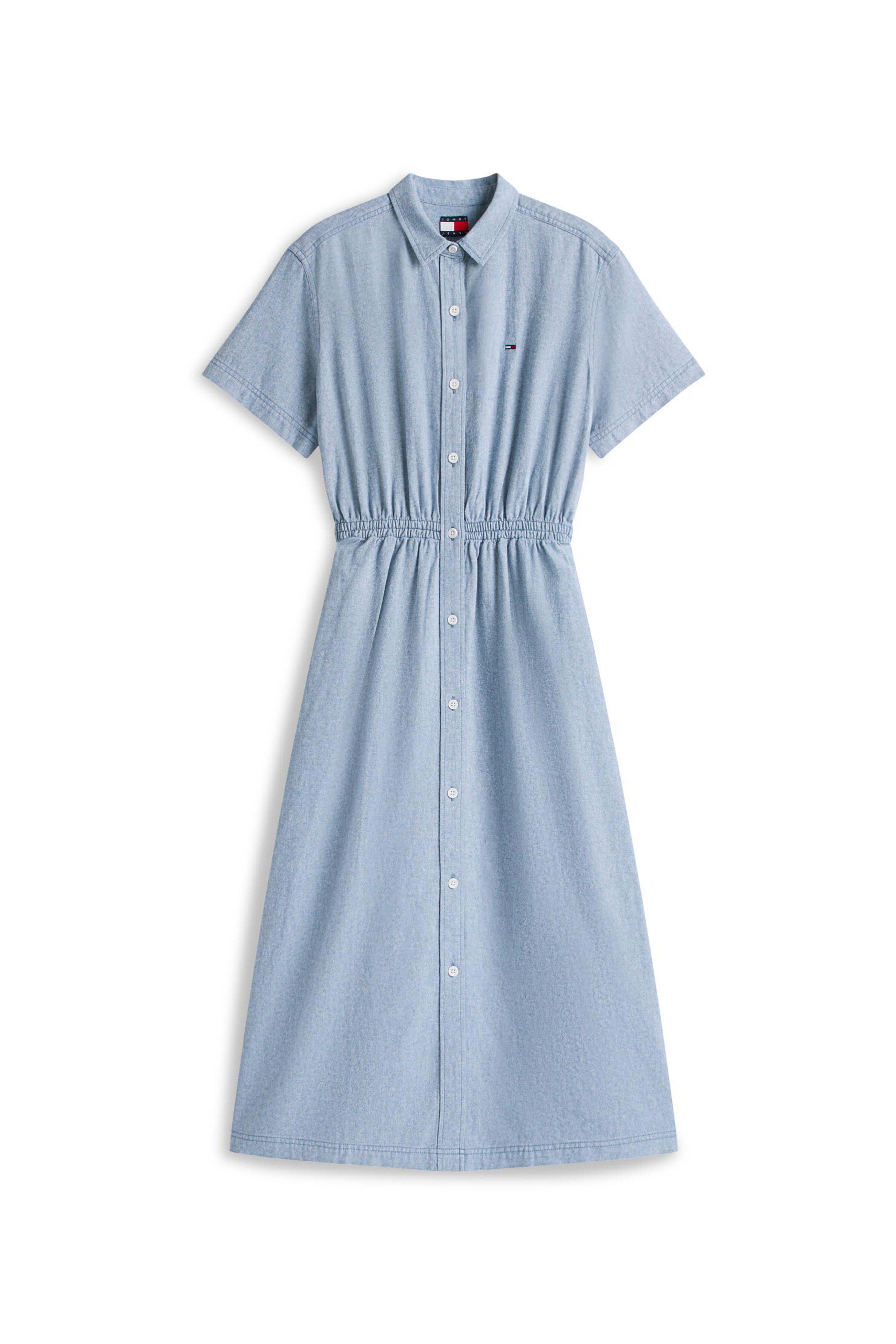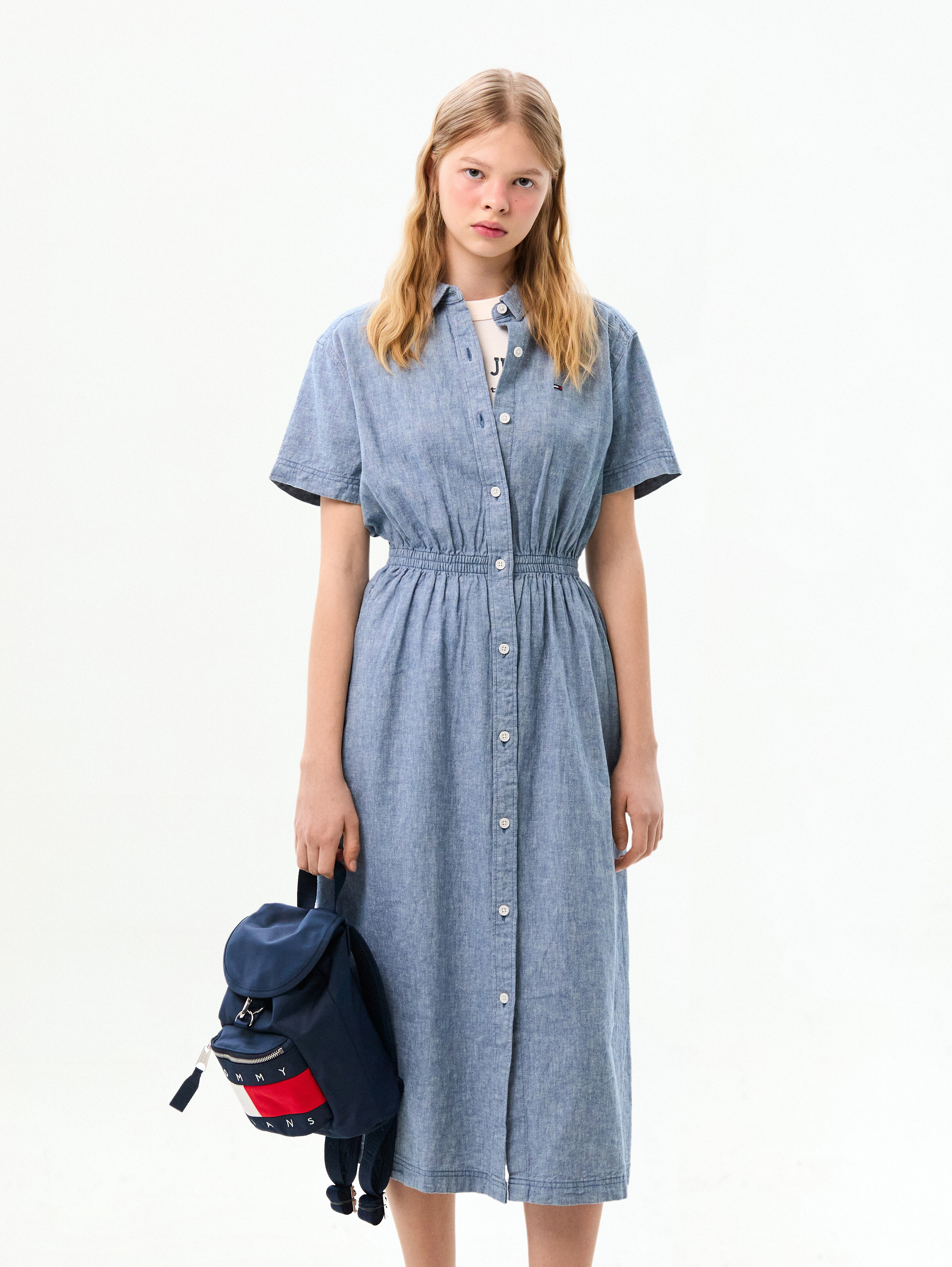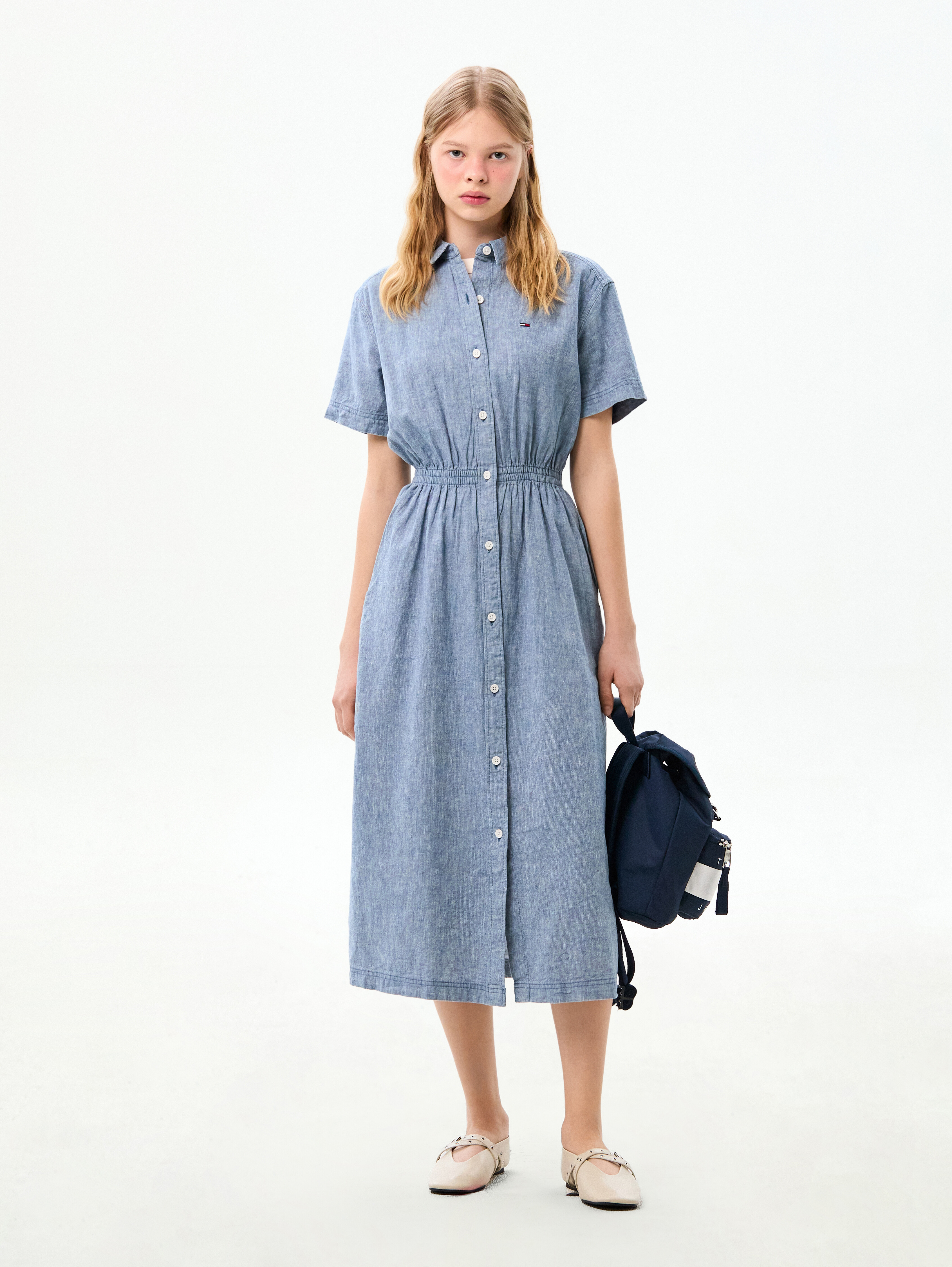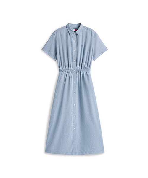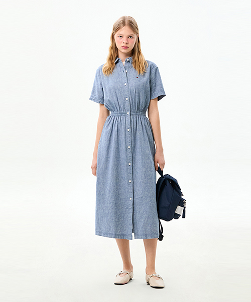 허리 라인의 셔링 디테일이 실루엣을 잡아주어 여성스러운 라인을 연출하고, 버튼 여밈의 셔츠 디자인과 맥시 기장이 어우러져 단정하면서도 세련된 분위기를 완성합니다.
