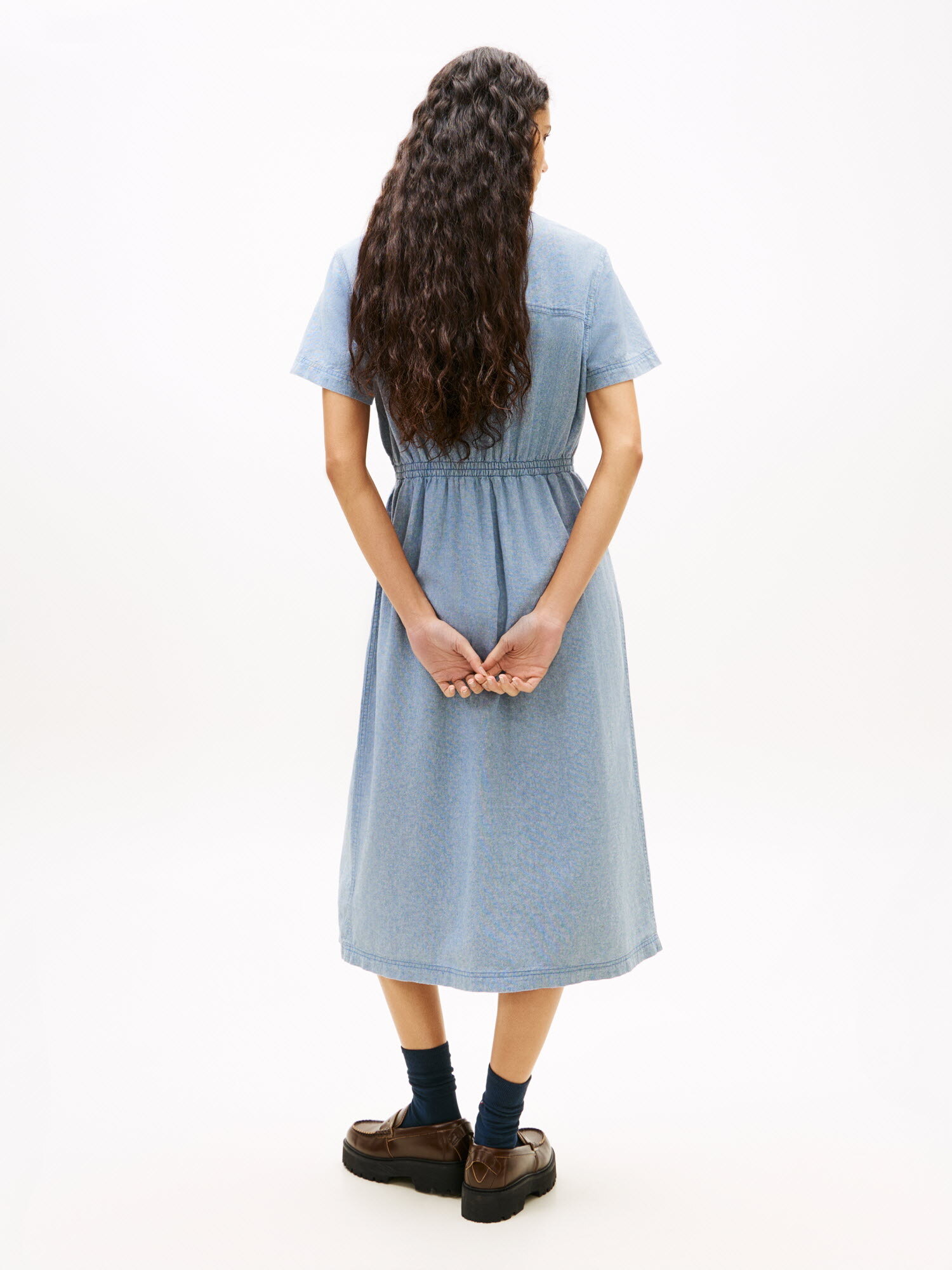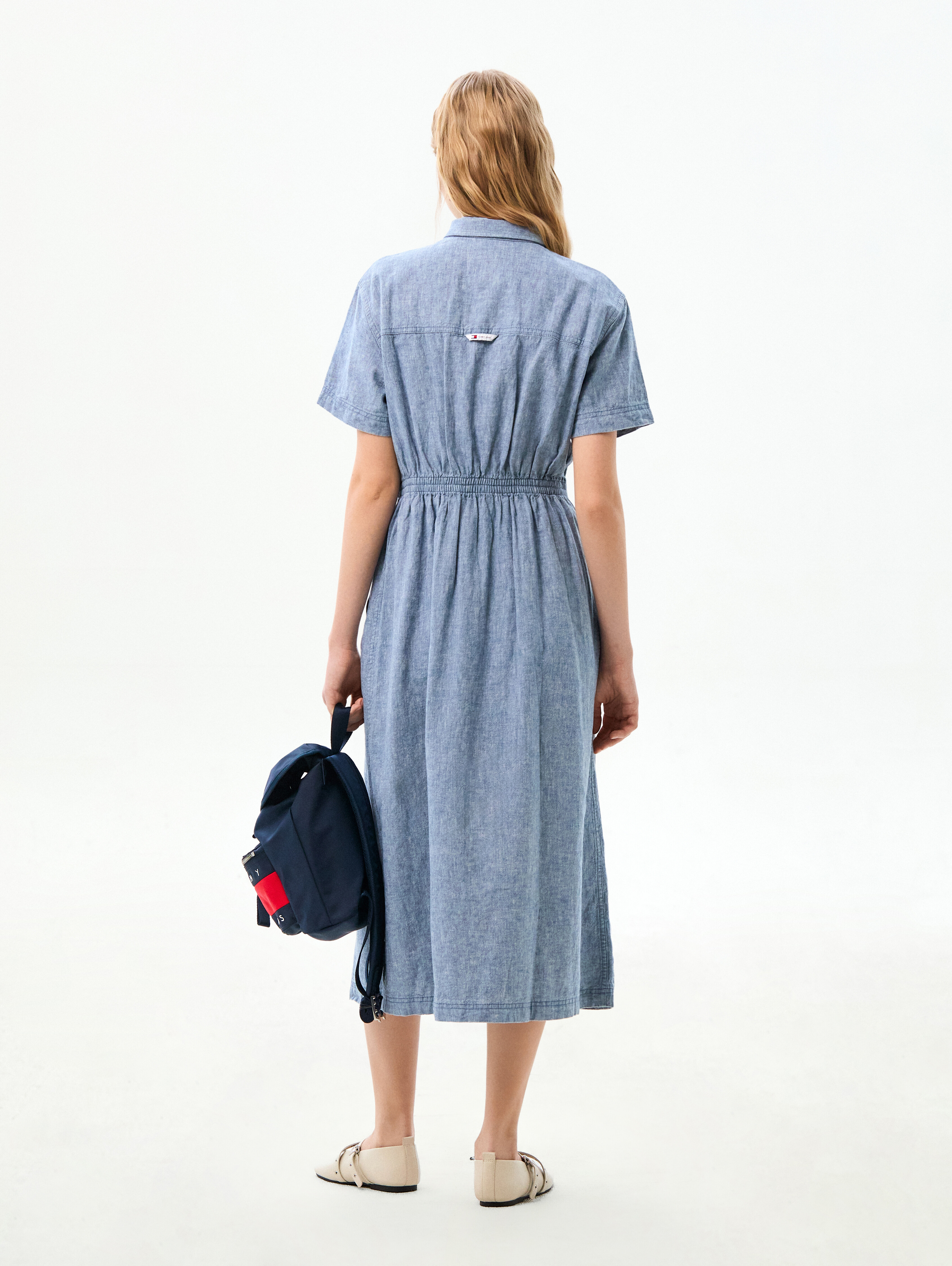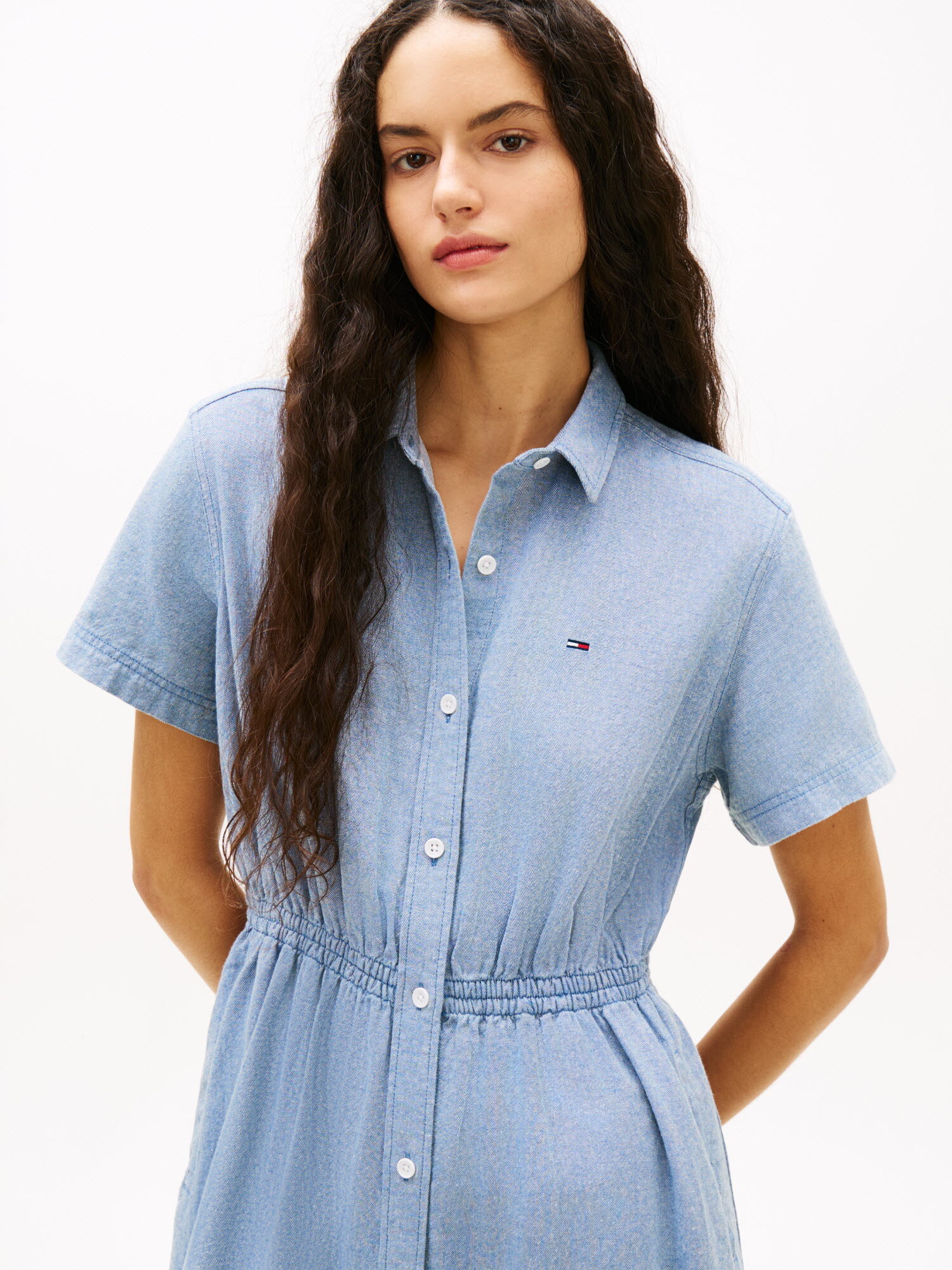 허리 라인의 셔링 디테일이 실루엣을 잡아주어 여성스러운 라인을 연출하고, 버튼 여밈의 셔츠 디자인과 맥시 기장이 어우러져 단정하면서도 세련된 분위기를 완성합니다.