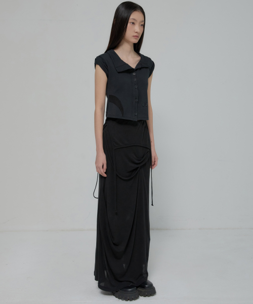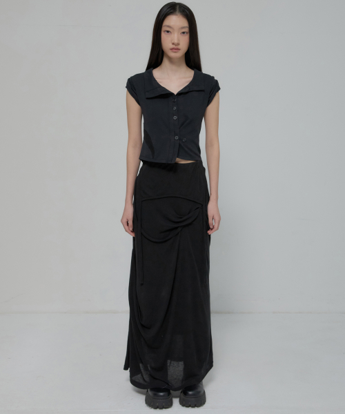 Asymmetrical Draped Layered Long Skirt (FL-256_Charcoal)