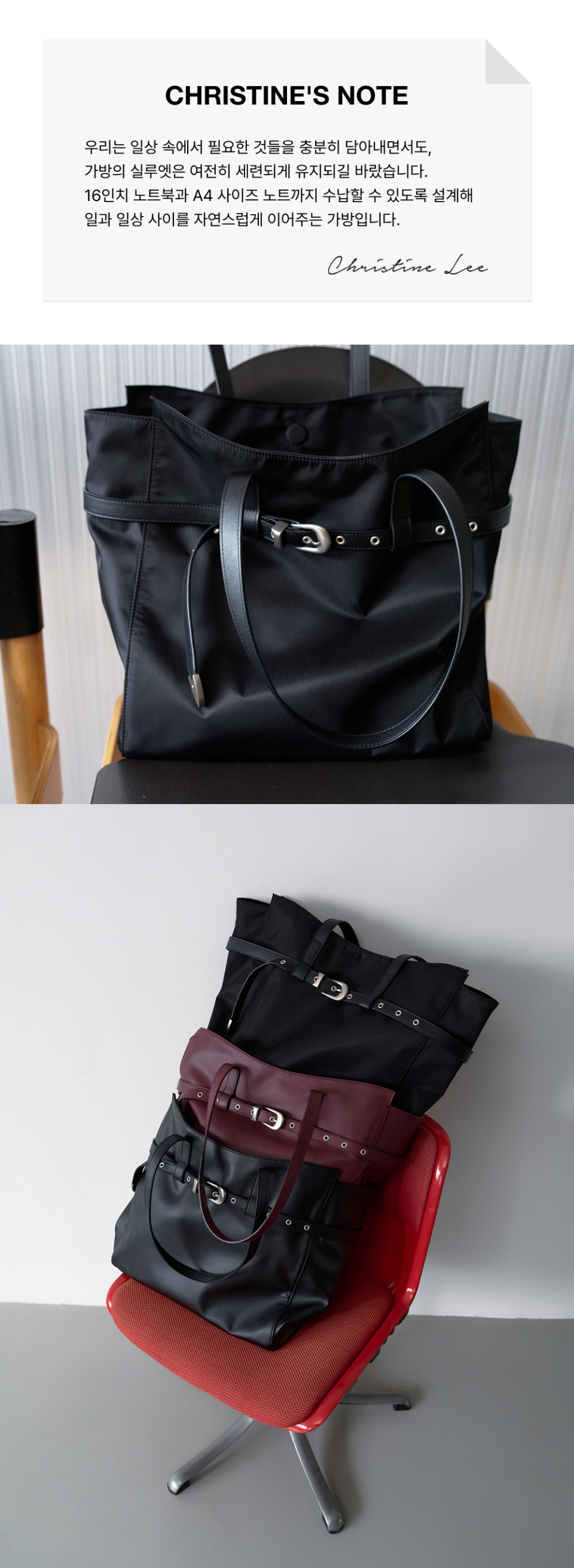 크리스틴프로젝트(CHRISTINE PROJECT)는 셰프 출신 디자이너 크리스틴의 일상에서 영감을 받은 브랜드입니다. 음식을 디자인하고 플레이팅 하듯 섬세한 디테일과 공정으로 가볍고 실용적인 가방을 제안합니다. 식재료에서 영감받은 감각적인 컬러와 독창적인 디자인으로, 편안함과 개성을 더해 일상을 더욱 스타일리시하게 완성할 디자인을 추구합니다.