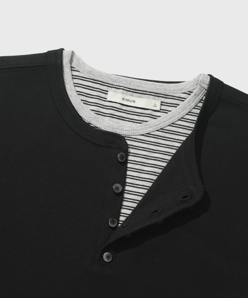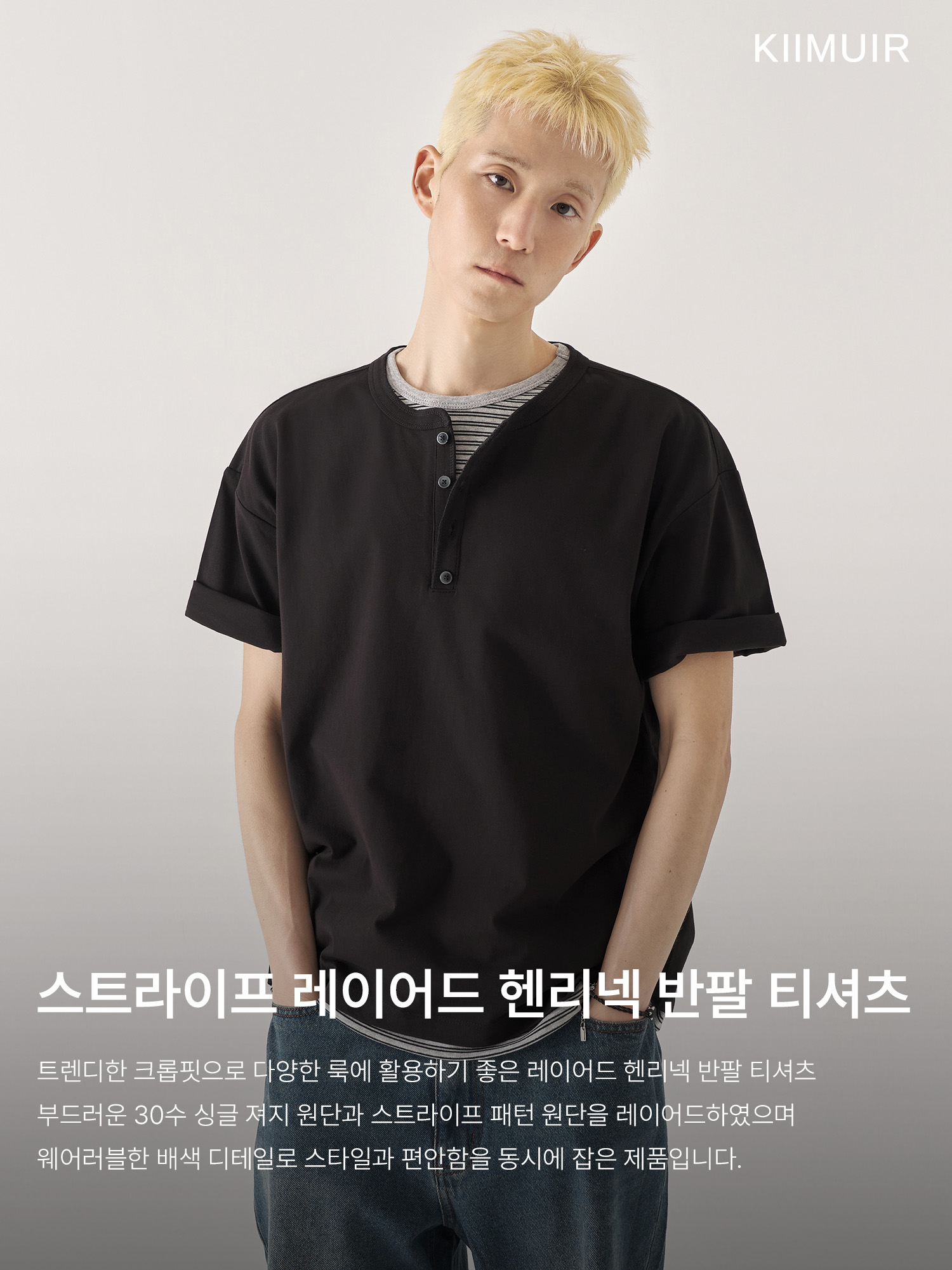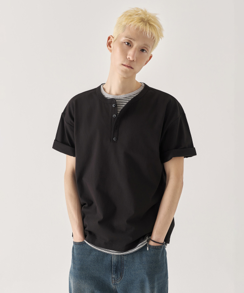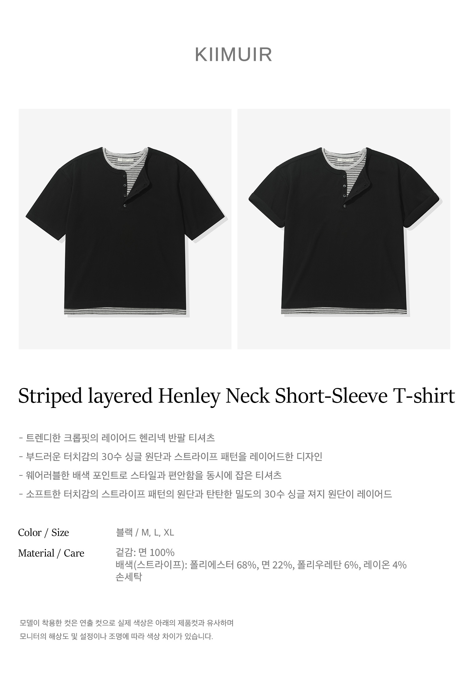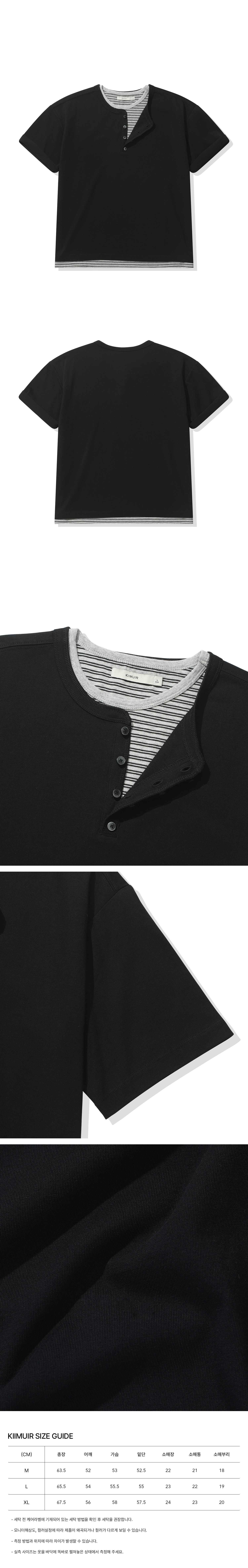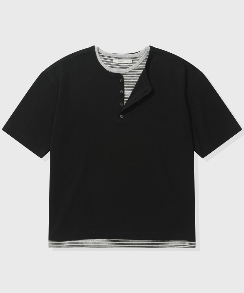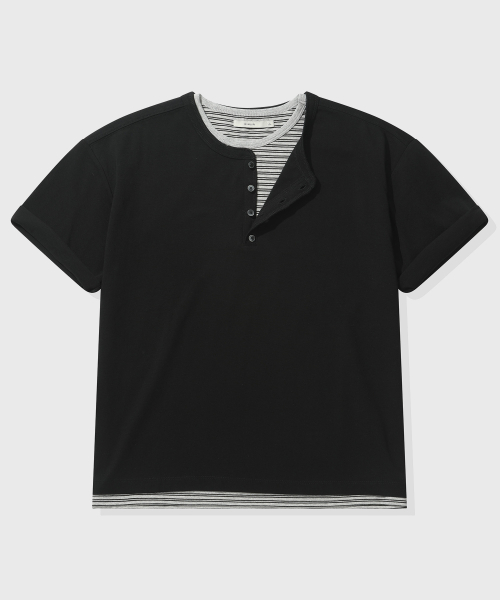 [크롭] 스트라이프 레이어드 헨리넥 반팔 티셔츠_블랙
