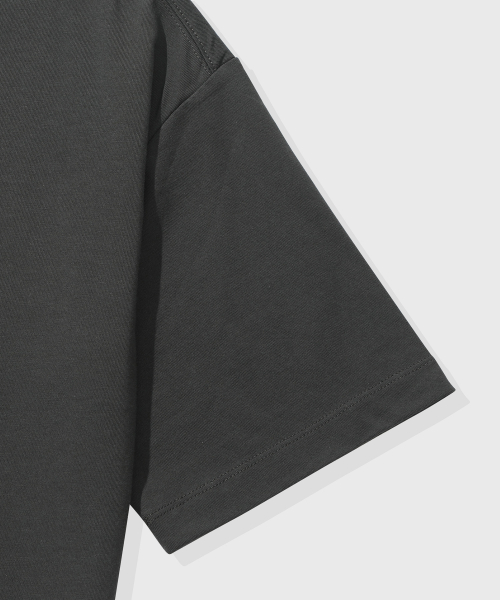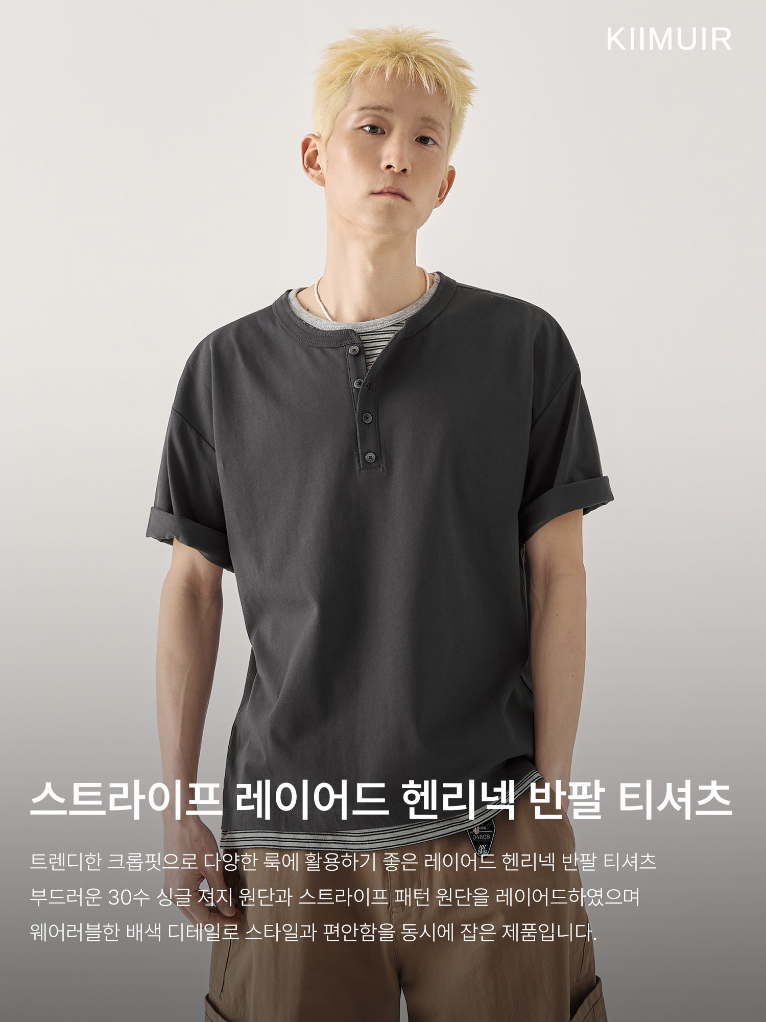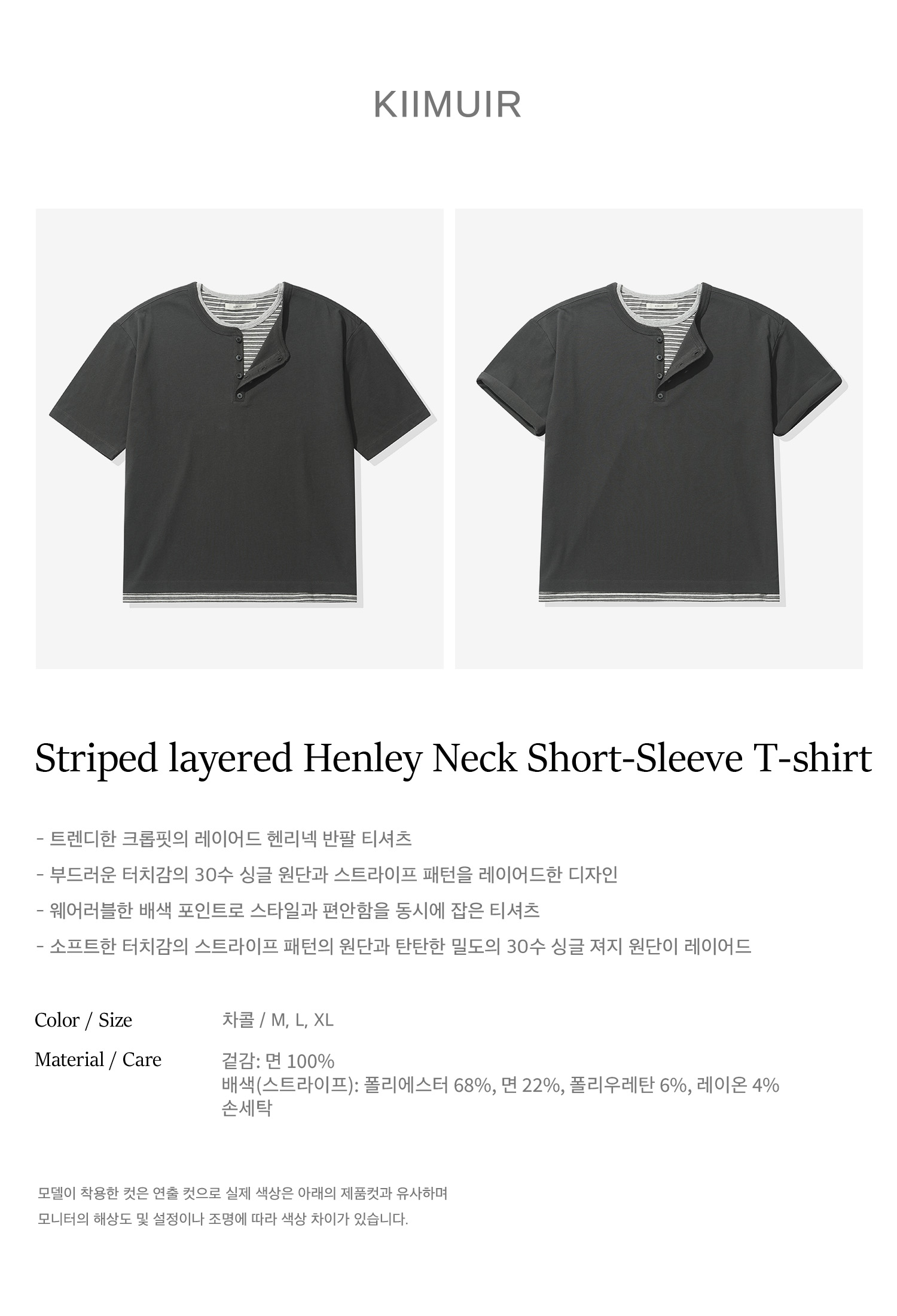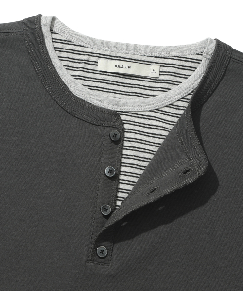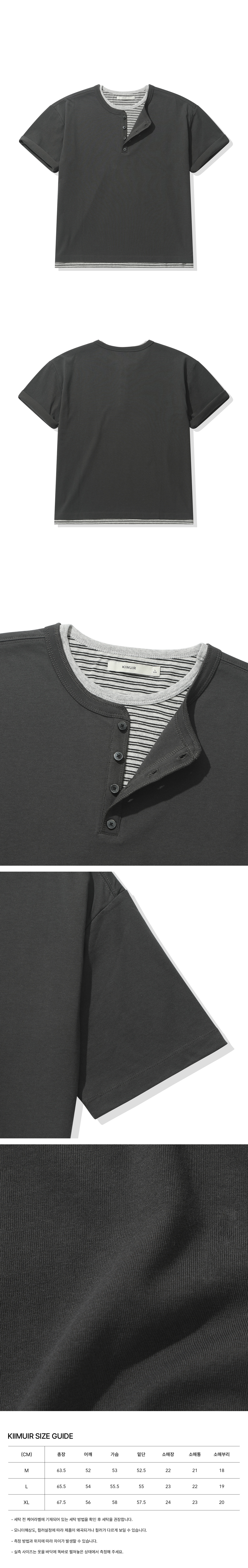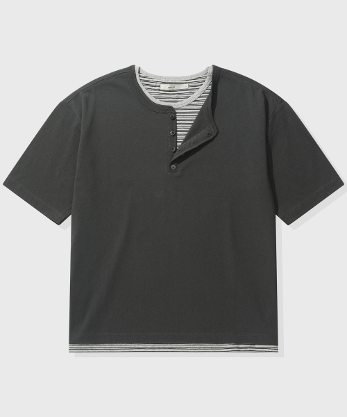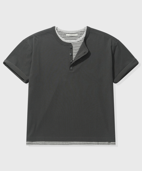 [크롭] 스트라이프 레이어드 헨리넥 반팔 티셔츠_차콜