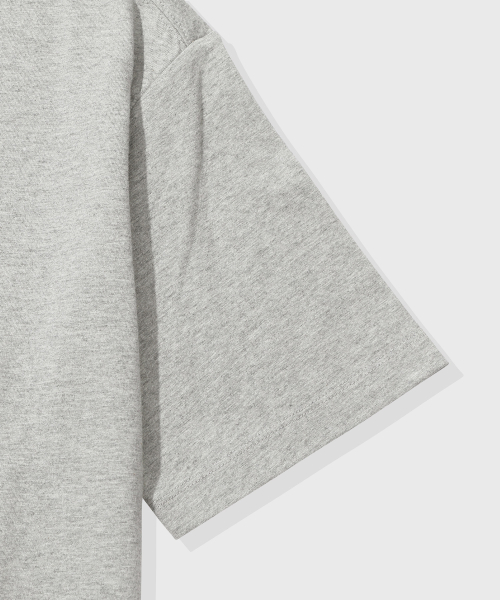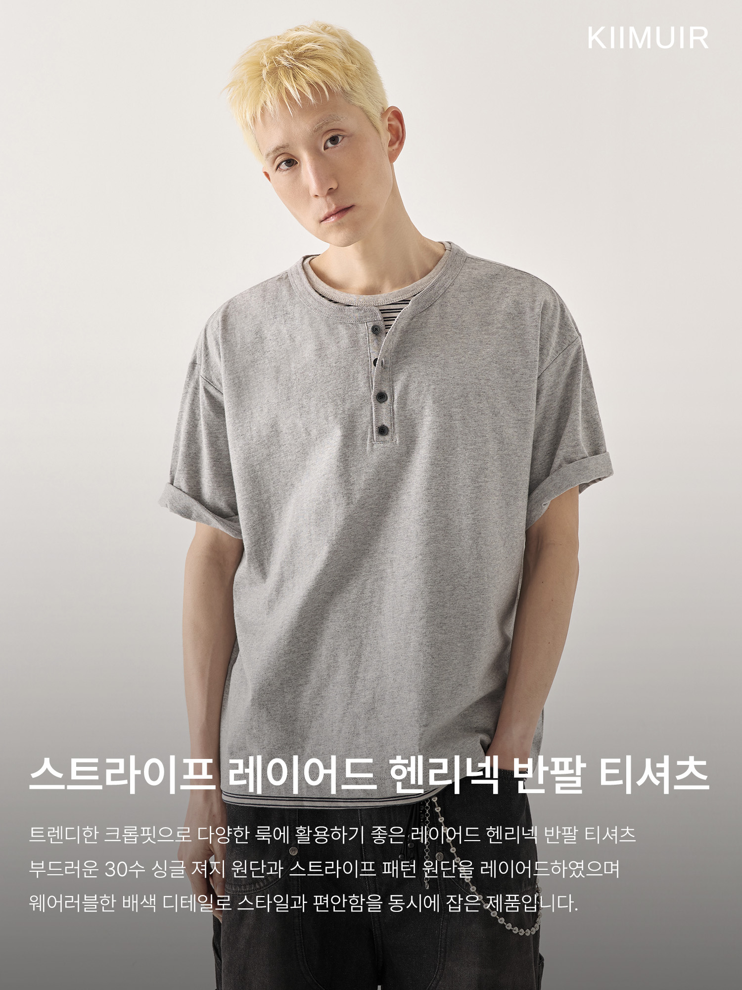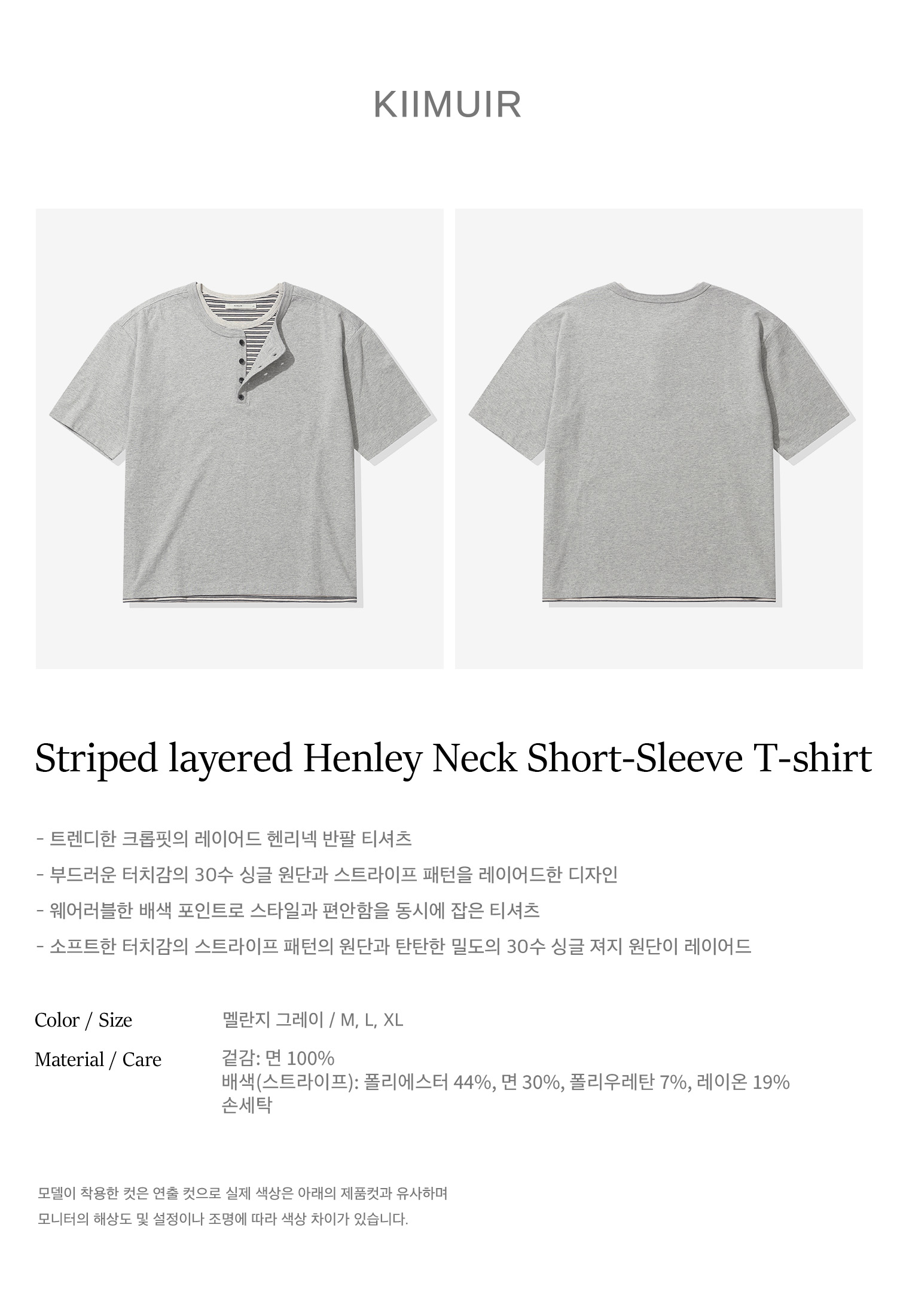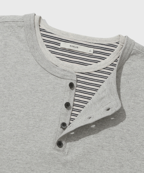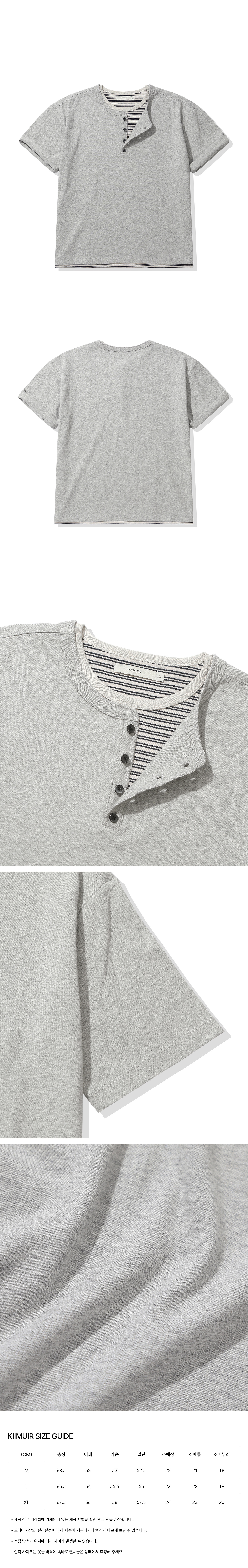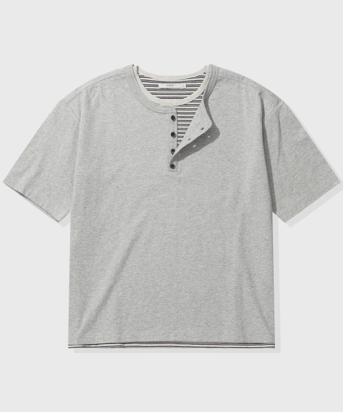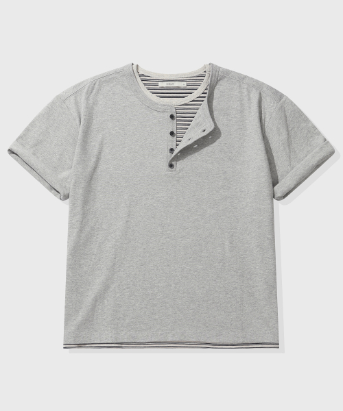 [크롭] 스트라이프 레이어드 헨리넥 반팔 티셔츠_멜란지 그레이