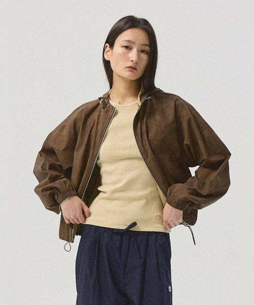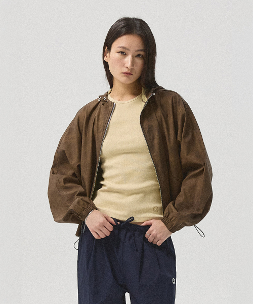 Kael Crack Faux Leather Hood Wind Jacket_BROWN