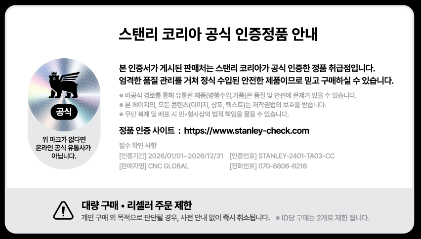 스탠리(STANLEY)는 100여 년의 역사를 가진 미국의 식음료 용기 브랜드입니다. 특유의 단단한 진공 단열구조로, 평생 그리고 그 다음 생애까지 사용할 수 있는 제품을 만들고 있습니다.