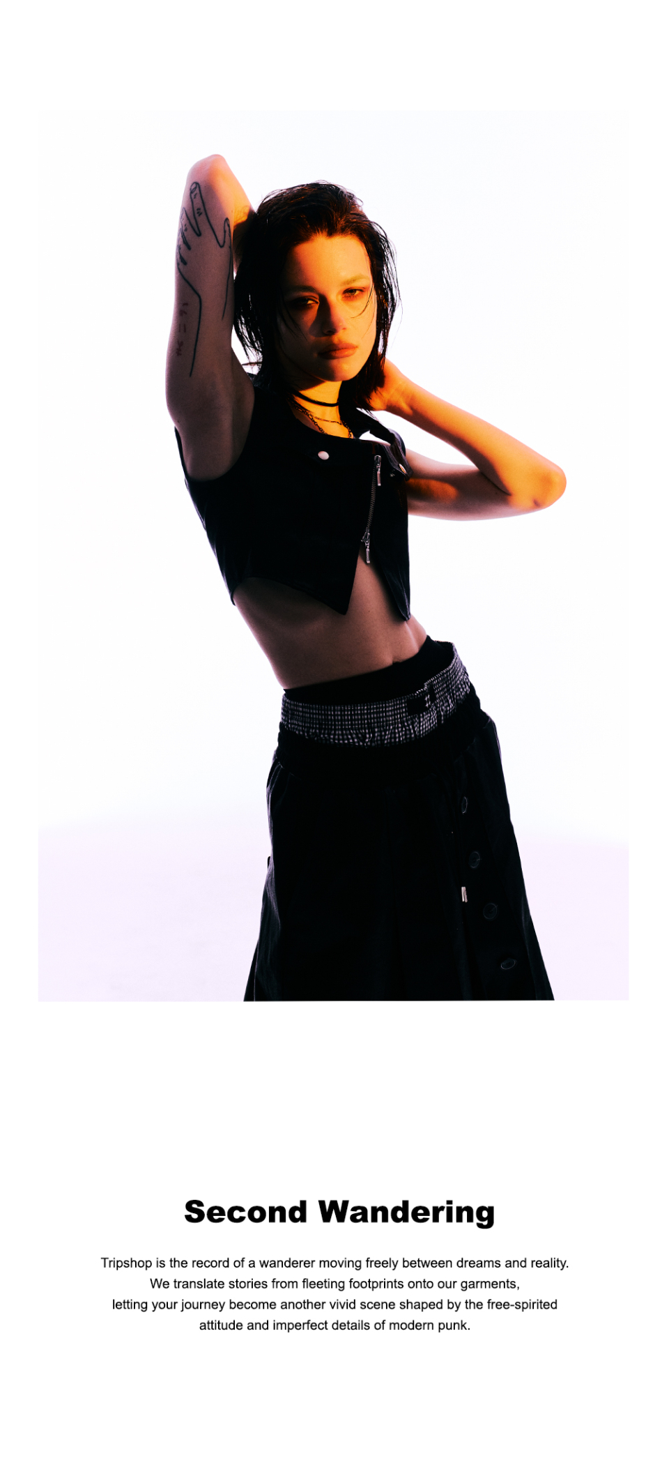 트립샵(TRIPSHOP)은 꿈과 현실 사이를 자유롭게 방랑하는 여행자의 기록입니다. 지나간 발자국 속 이야기를 옷 위에 담아, 모던 펑크의 자유로운 태도와 불완전한 디테일 속에서 당신의 여정을 또 하나의 장면으로 만들어가는 브랜드입니다.