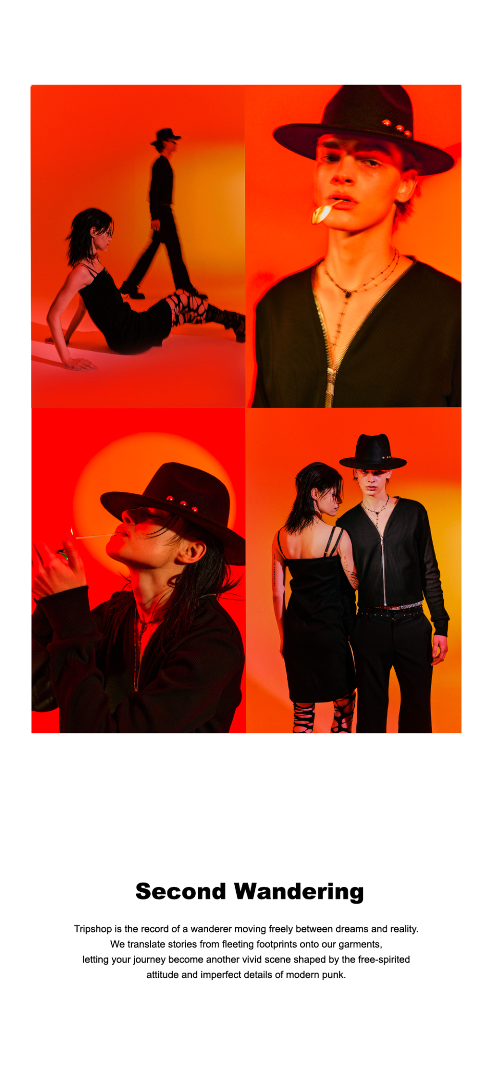 트립샵(TRIPSHOP)은 꿈과 현실 사이를 자유롭게 방랑하는 여행자의 기록입니다. 지나간 발자국 속 이야기를 옷 위에 담아, 모던 펑크의 자유로운 태도와 불완전한 디테일 속에서 당신의 여정을 또 하나의 장면으로 만들어가는 브랜드입니다.