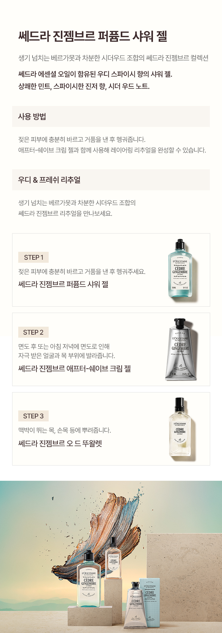 | 전성분 | 정제수 소듐라우레스설페이트 코코-글루코사이드 글리세린 코코-베타인 향료(생강향 0.0008%) 폴리쿼터늄-10 소듐벤조에이트 시트릭애씨드 소듐클로라이드 멘톨 연필향나무오일(0.01442%) 리모넨 리날룰 |