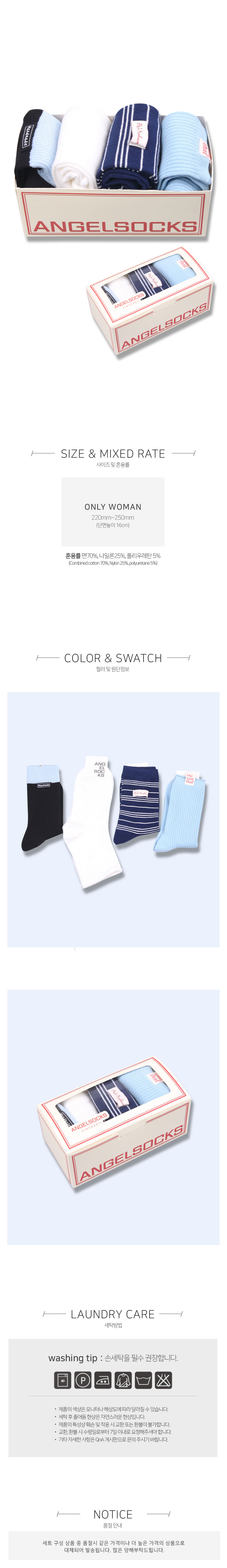 ANGEL SOCKS(엔젤삭스)는 디자이너가 직접 제작, 생산, 초이스 하는 풋 웨어 전문 브랜드입니다. 직, HAND LINKED TOE 등의 고급 편직기술과 앙고라, 울, 슬러브사 등의 다양한 소재를 사용하여, 모던한 색상과 패턴의 상품부터 컬러풀하고 위트 넘치는 다양한 상품을 제작합니다.