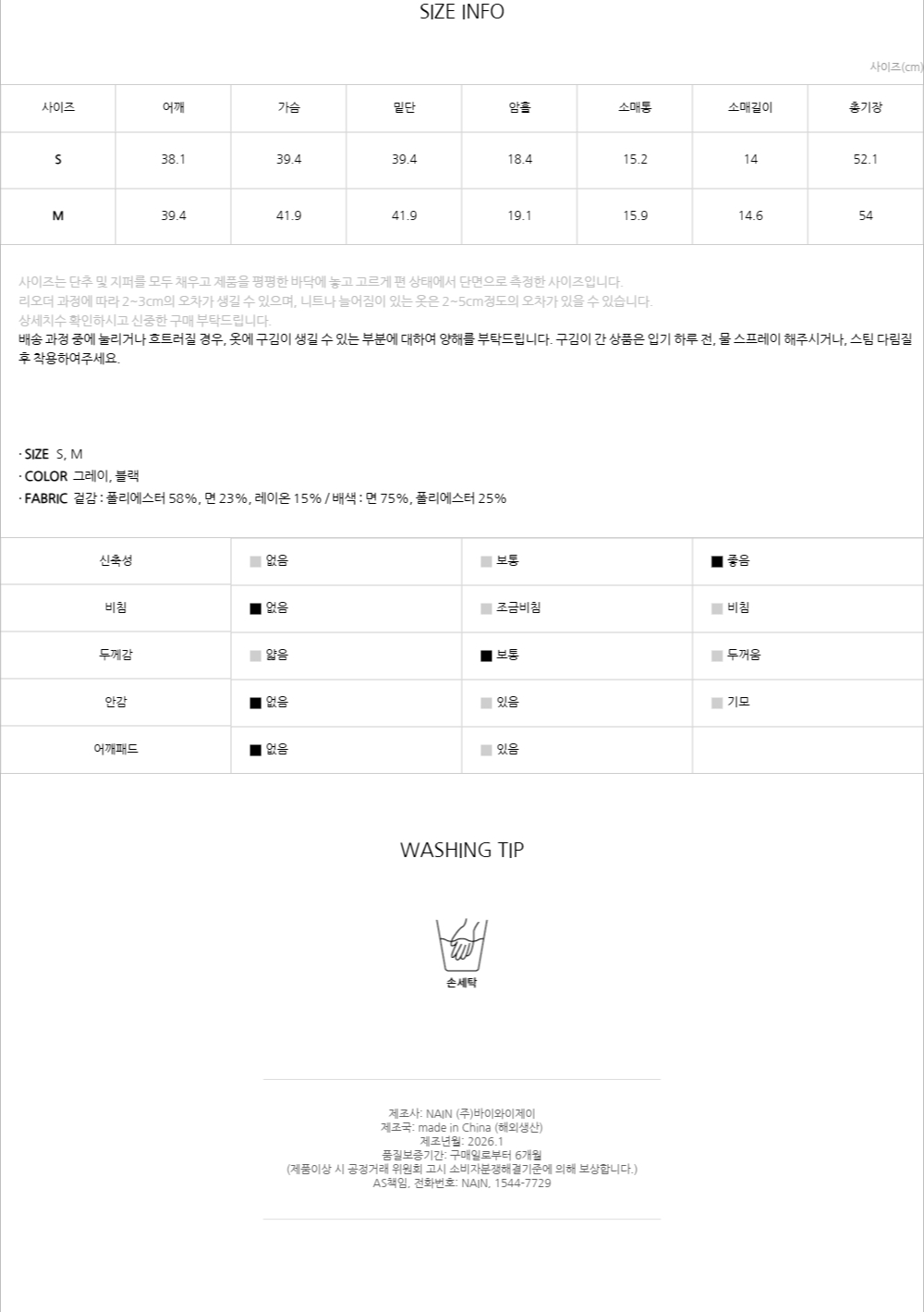 **원단 특성상 착용 및 세탁시 마찰이나 습기에 의해 이염이 발생할 수 있습니다.