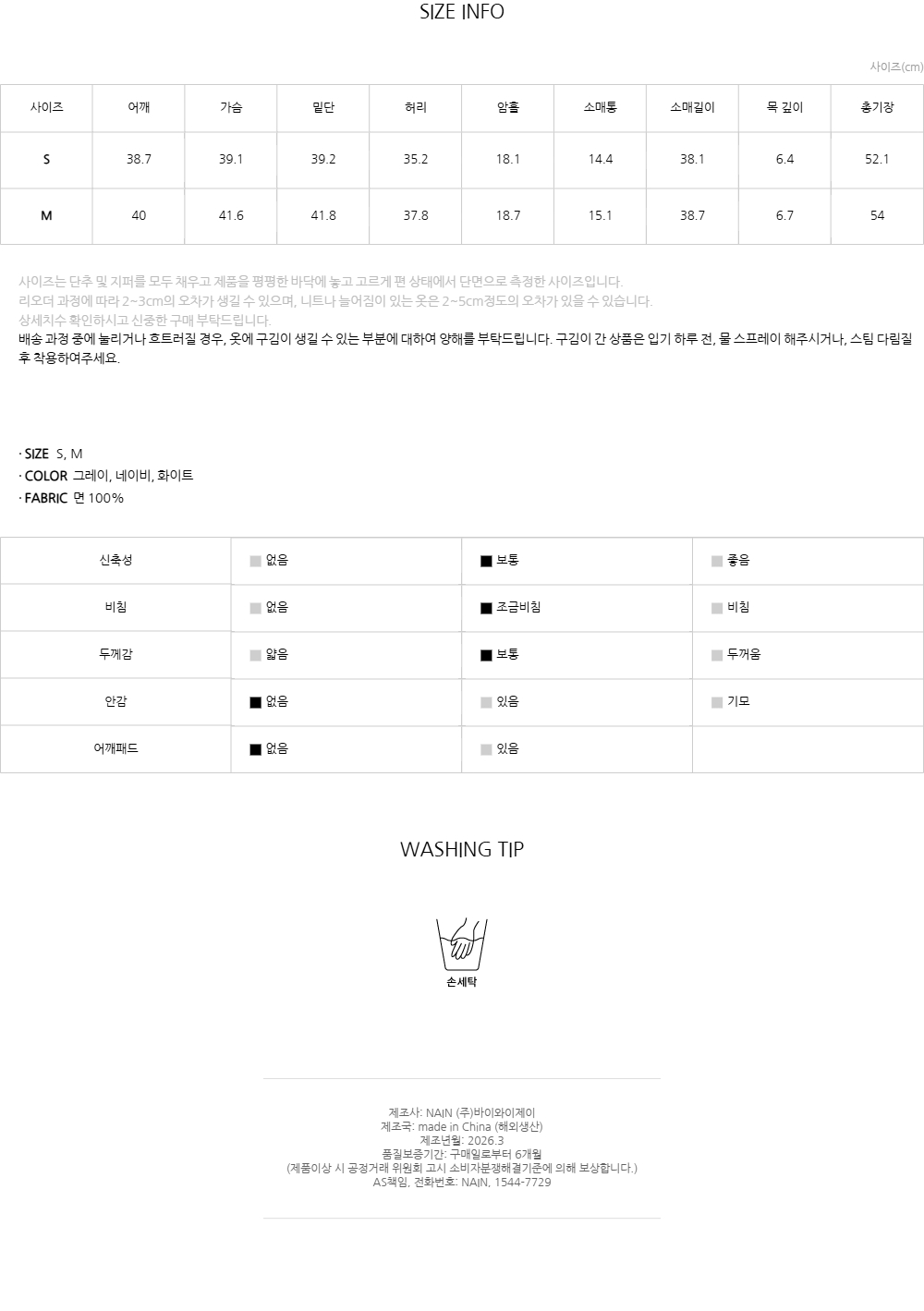 **원단 특성상 착용 및 세탁시 마찰이나 습기에 의해 이염이 발생할 수 있습니다.
