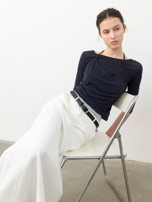 보트넥과 홀터 형식의 앞판 레이어드가 돋보이는 티셔츠입니다.