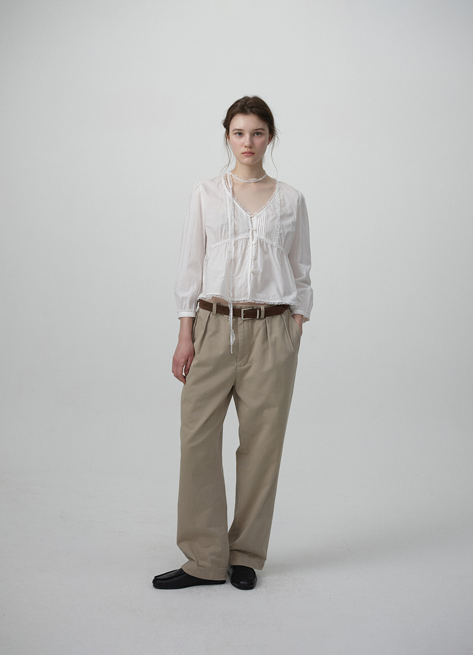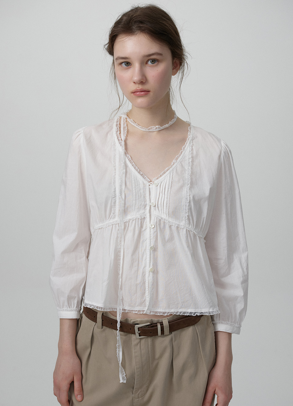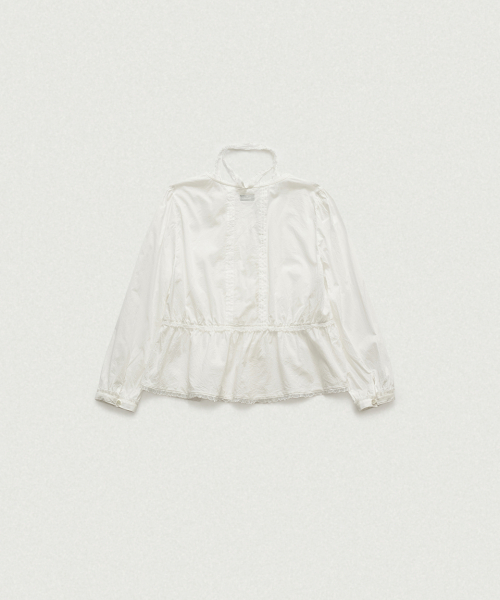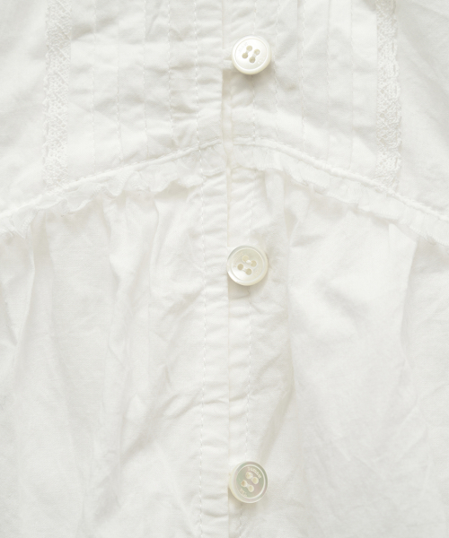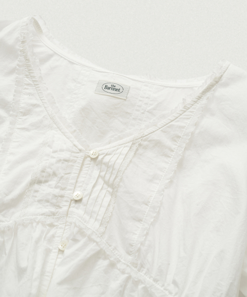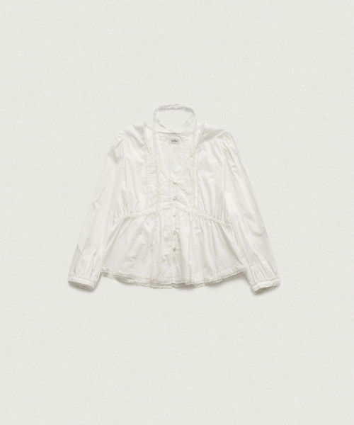 전면 핀턱,레이스 트리밍 디테일이 돋보이는 페미닌한 무드의 블라우스
