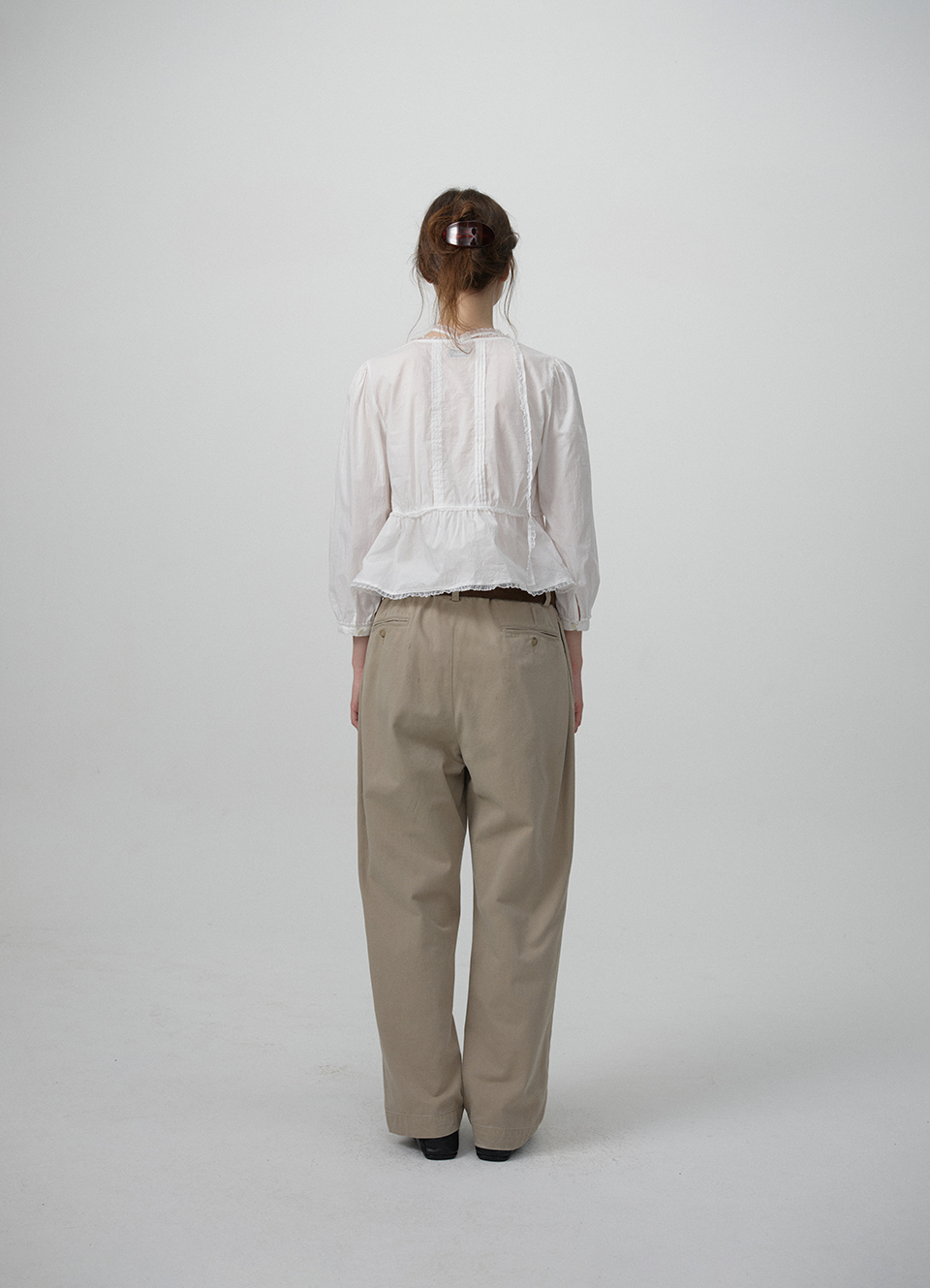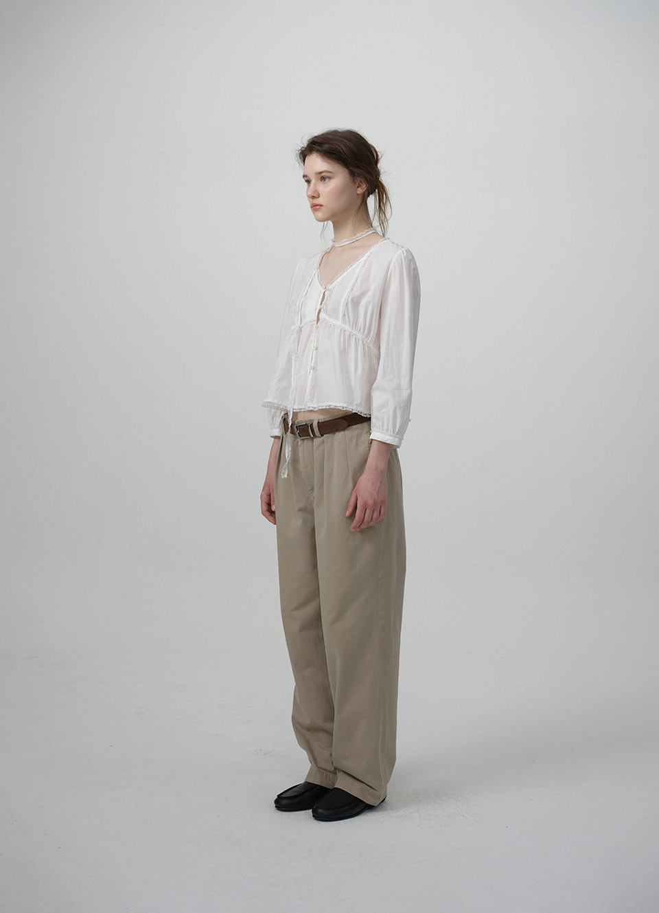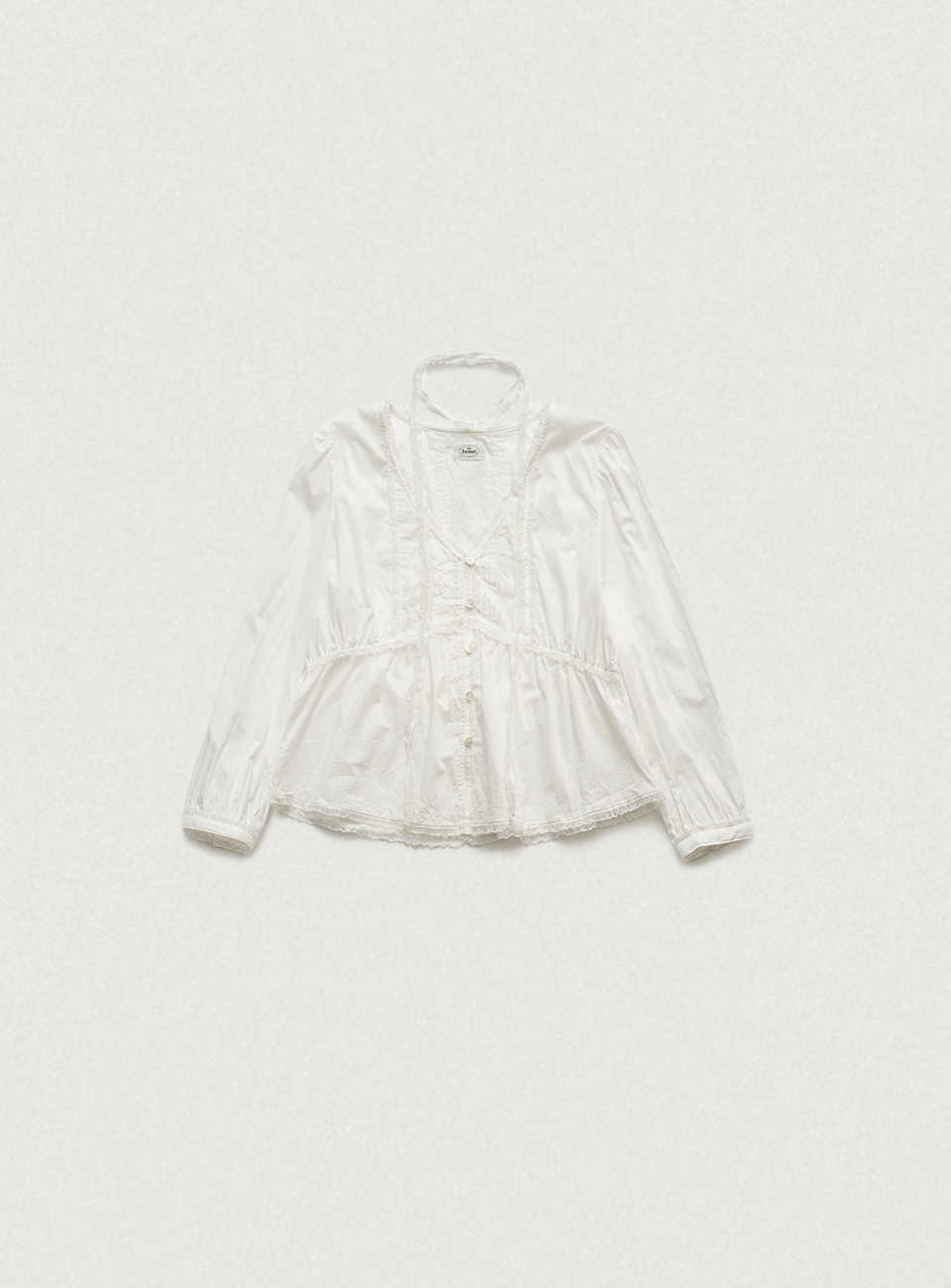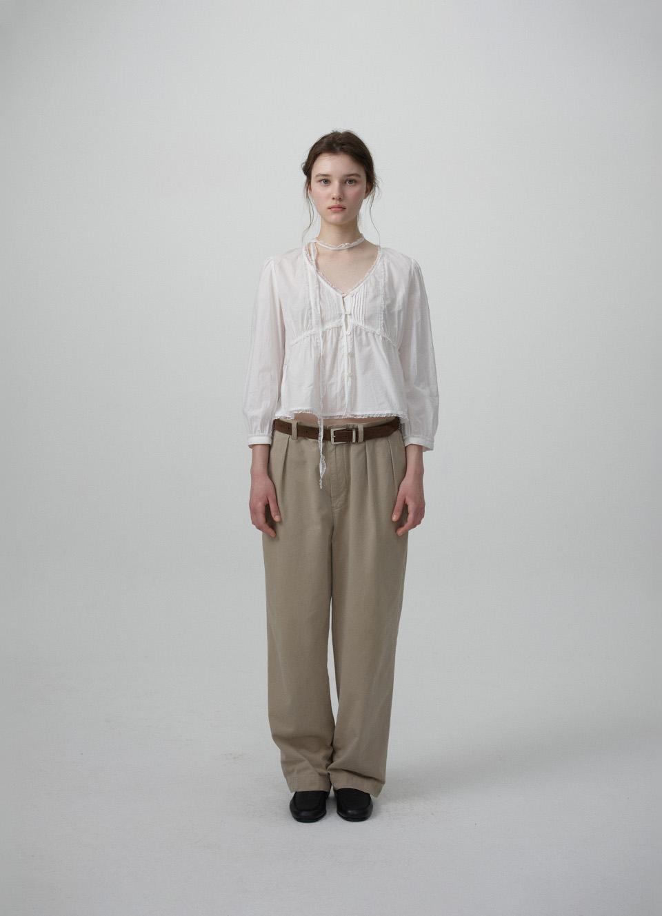전면 핀턱,레이스 트리밍 디테일이 돋보이는 페미닌한 무드의 블라우스