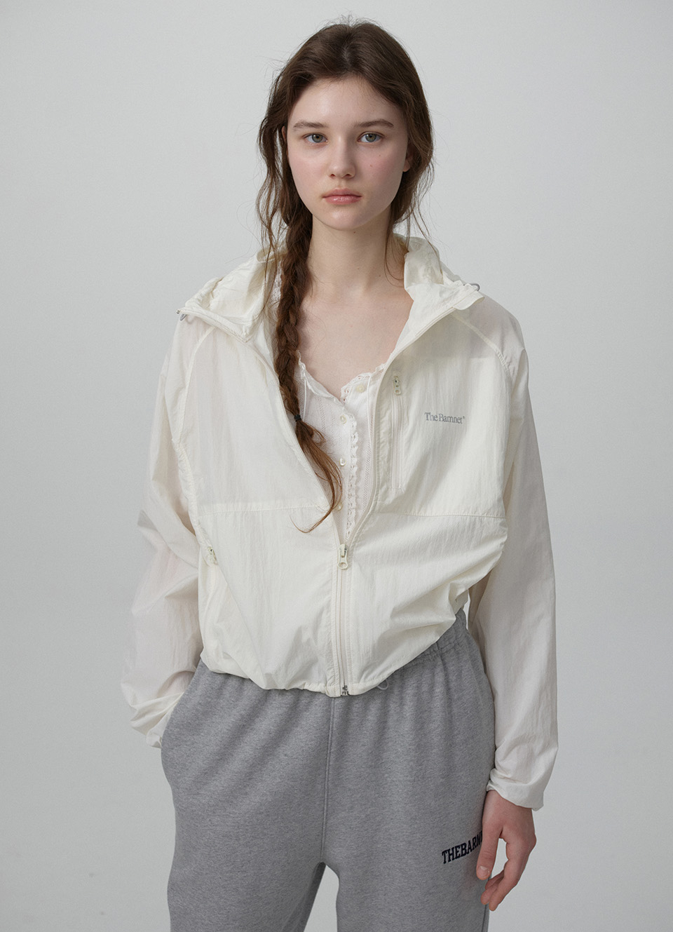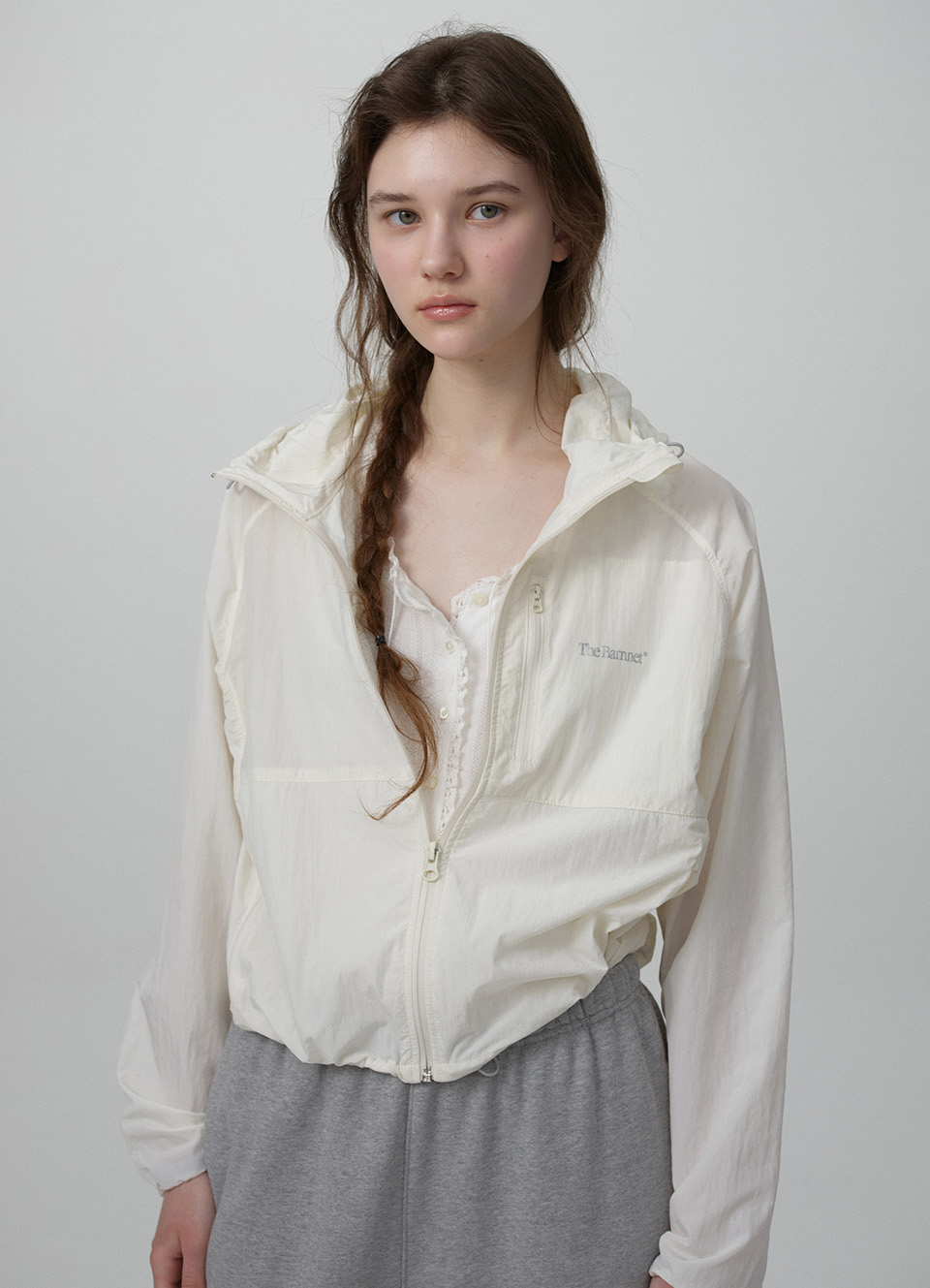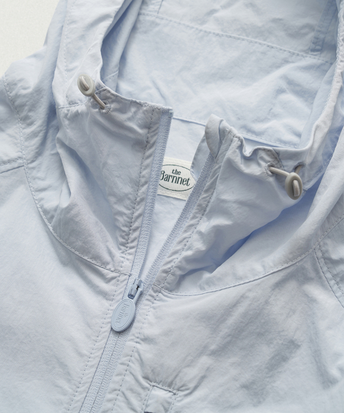 레글런 소매와 후드 집업 형태의 윈드 브레이커 자켓