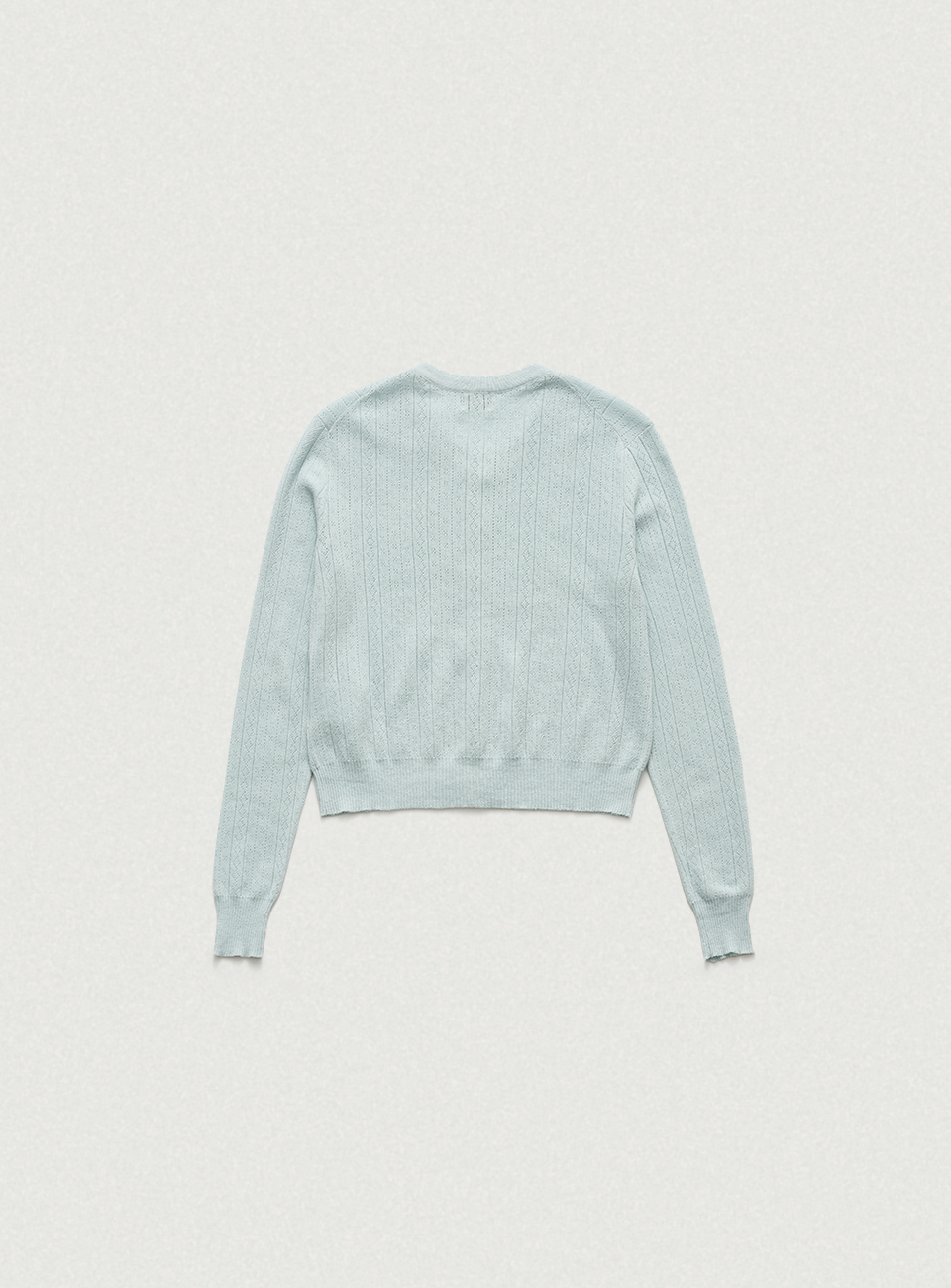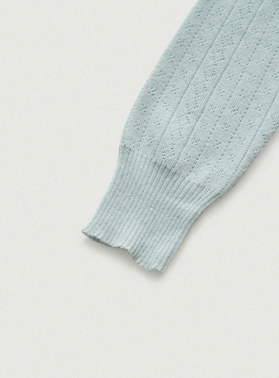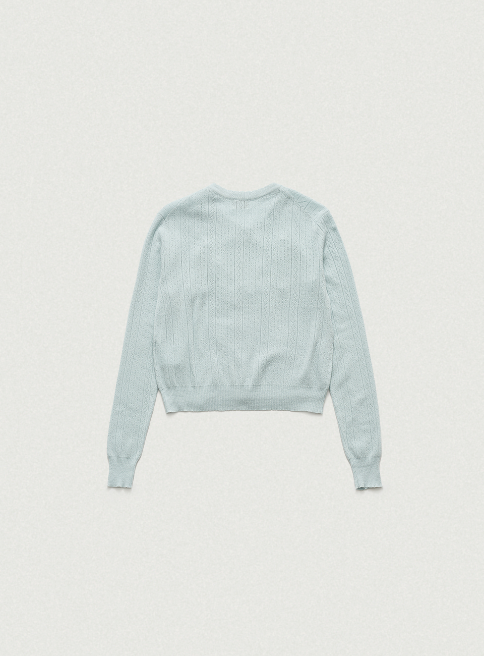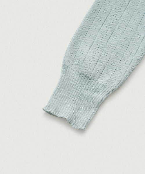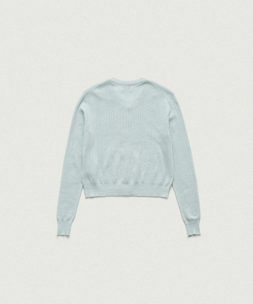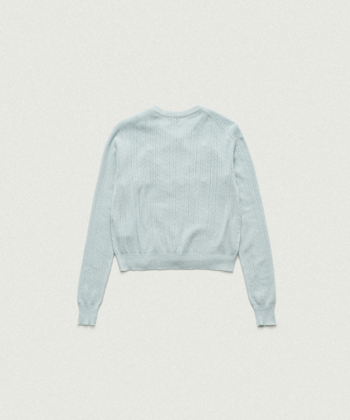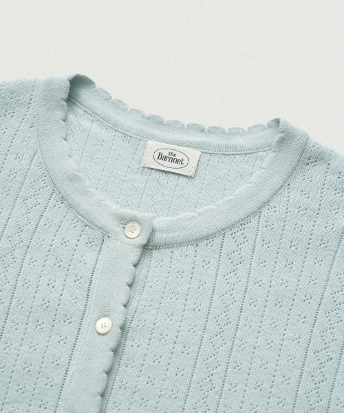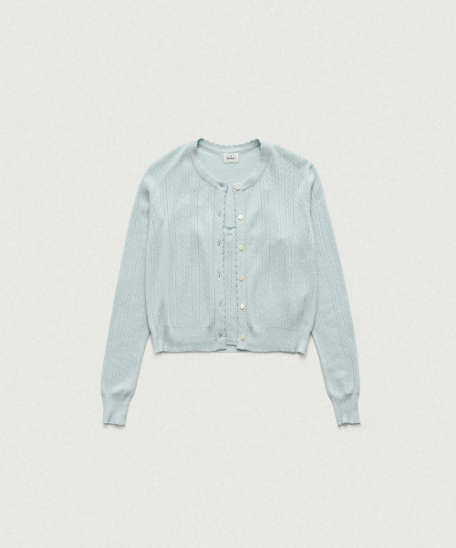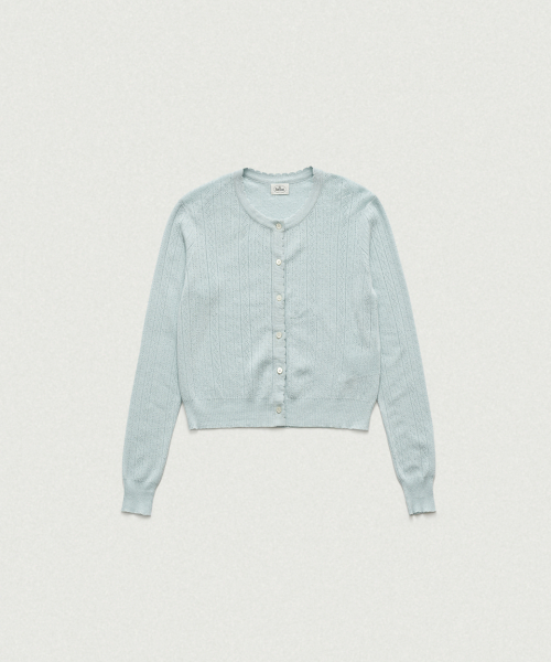 페일한 민트 컬러감과 부드러운 터치감이 돋보이는 포인텔 패턴의 니트 가디건과 슬리브리스 셋업