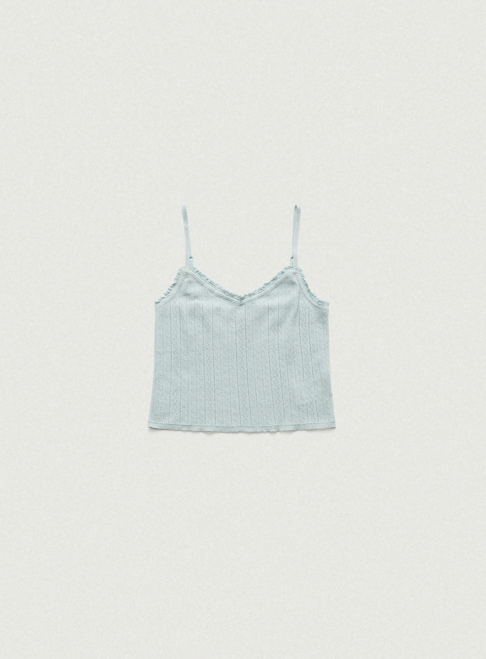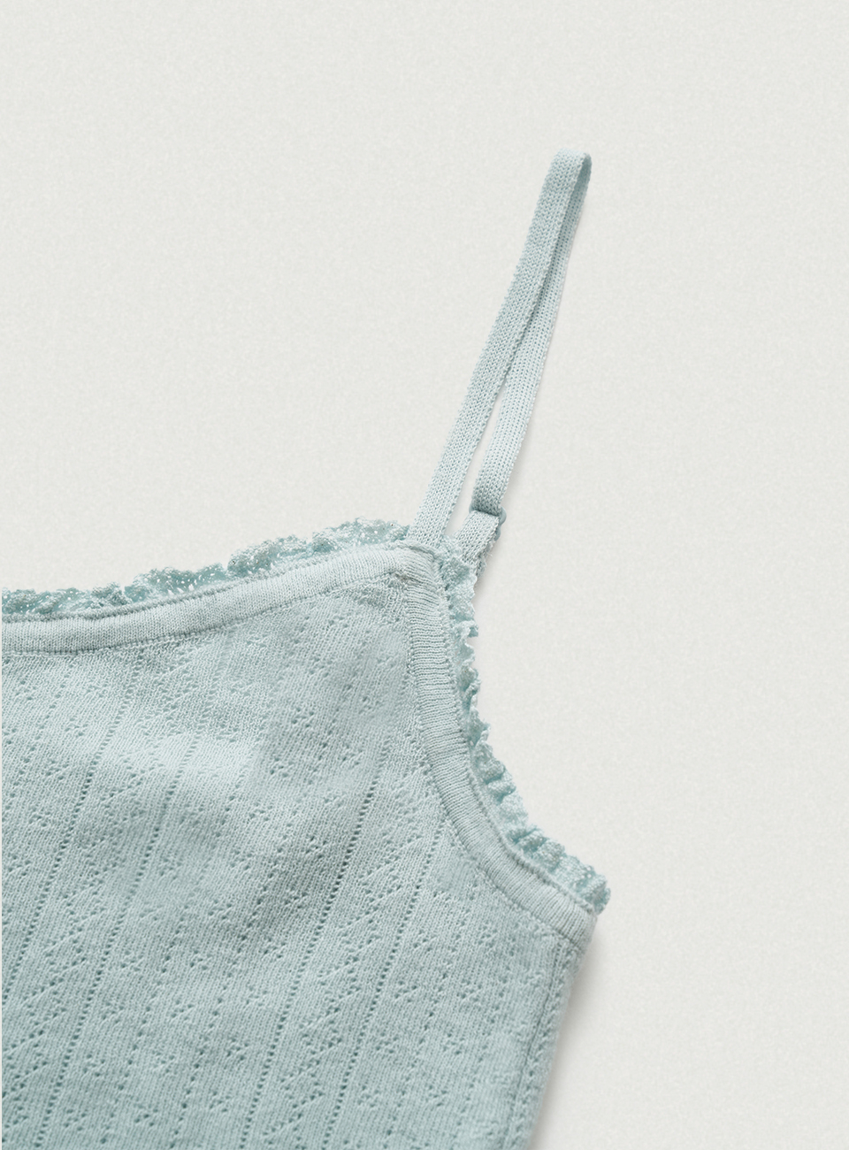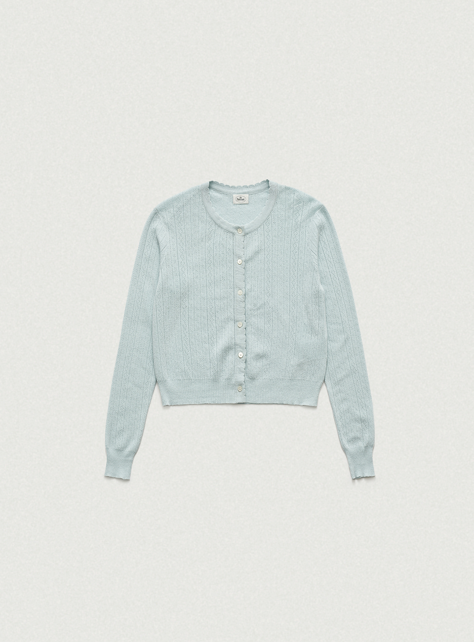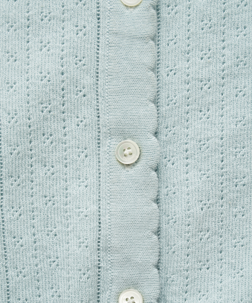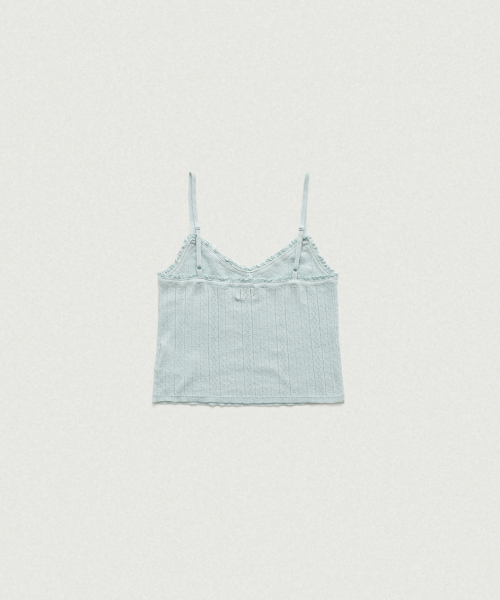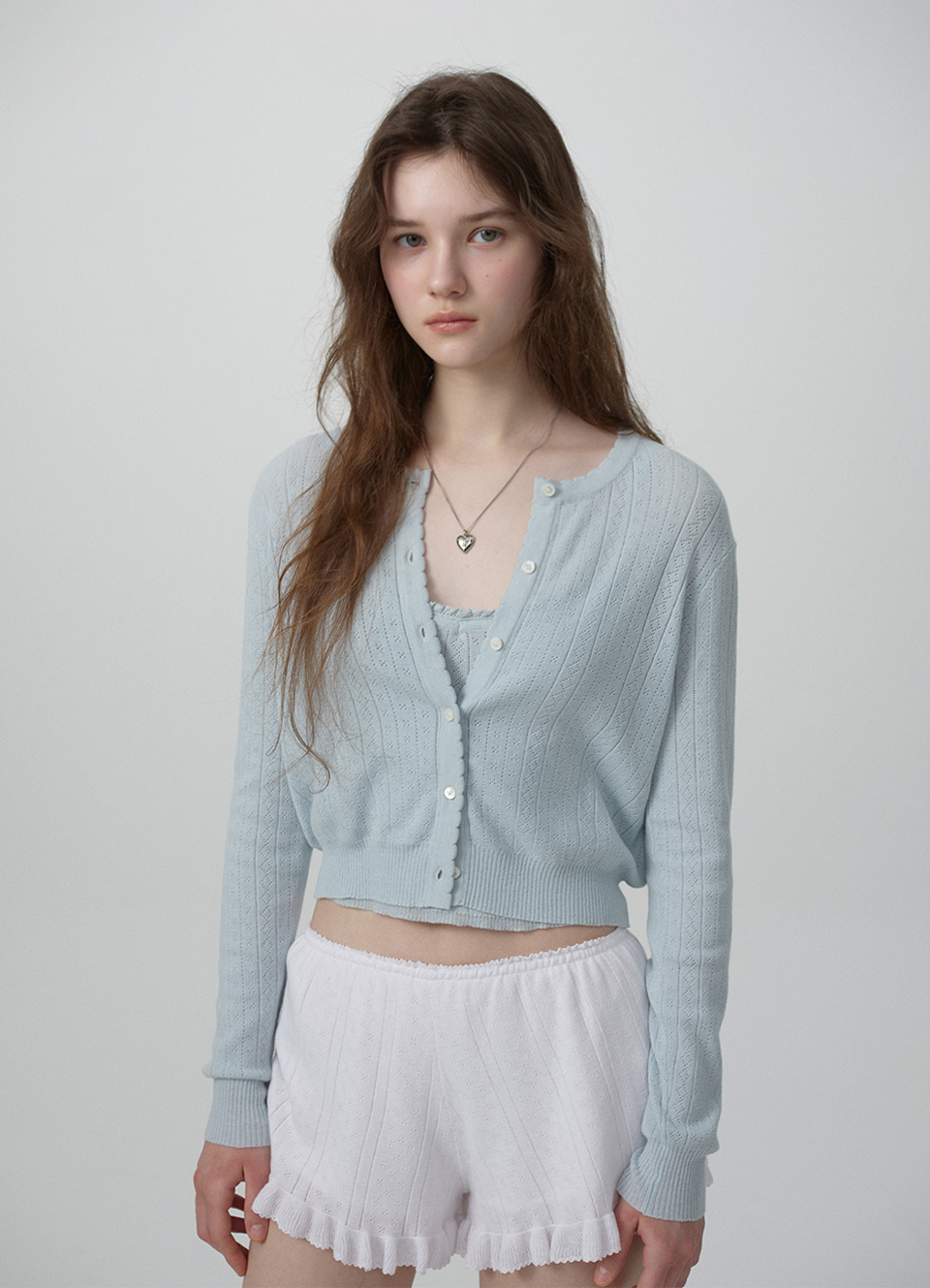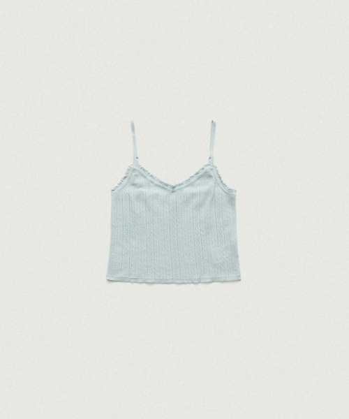 페일한 민트 컬러감과 부드러운 터치감이 돋보이는 포인텔 패턴의 니트 가디건과 슬리브리스 셋업