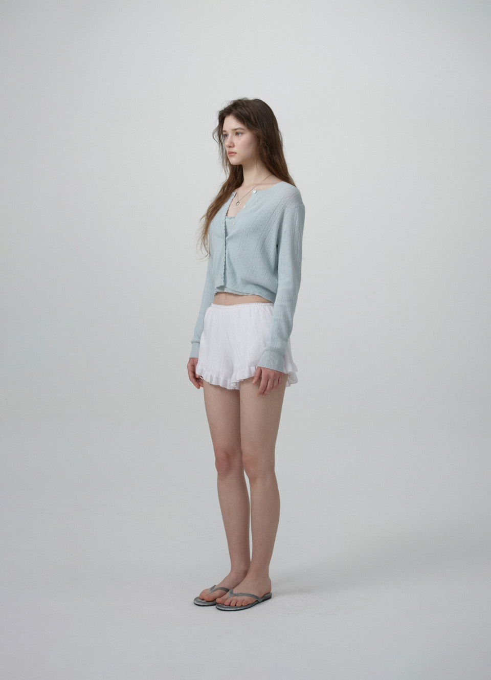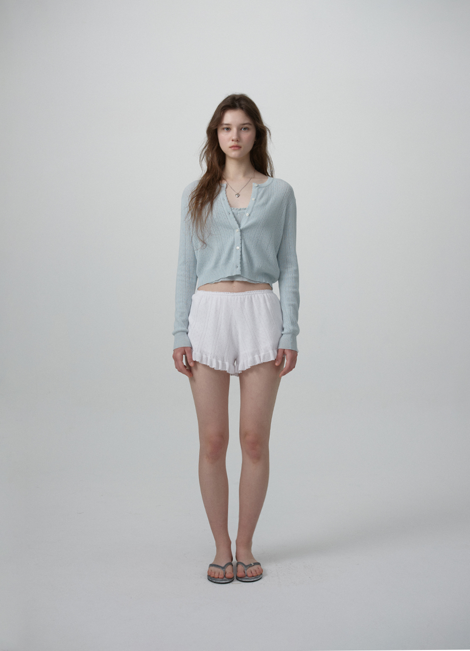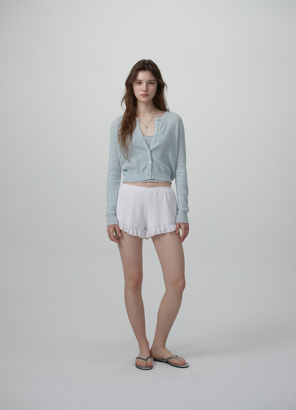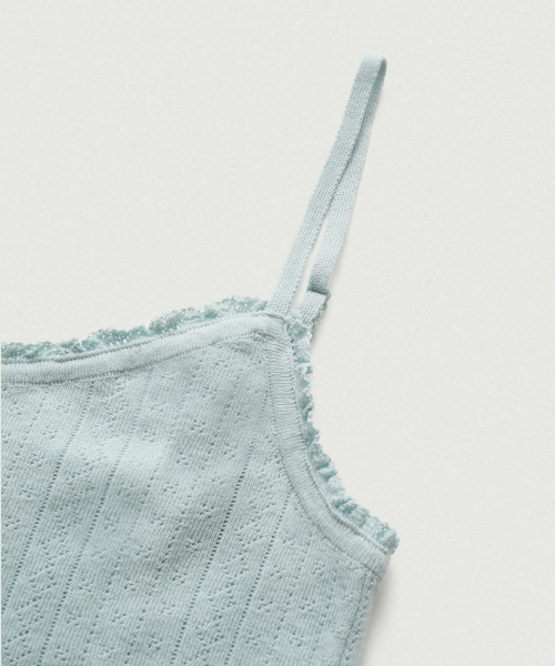 크롭한 기장감의 가디건과 끈길이 조절 가능한 슬리브리스로
