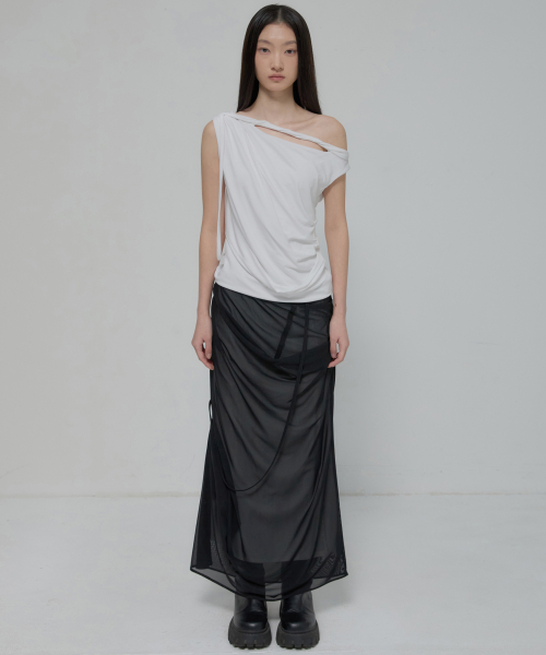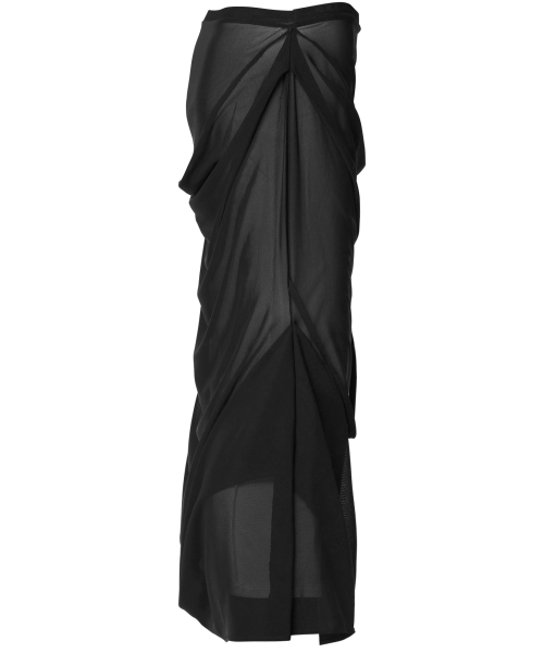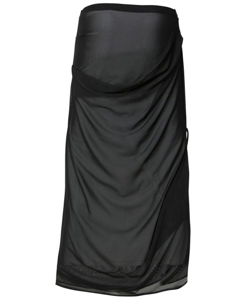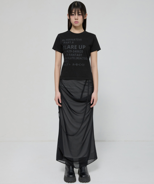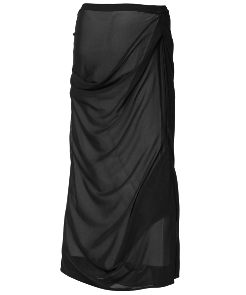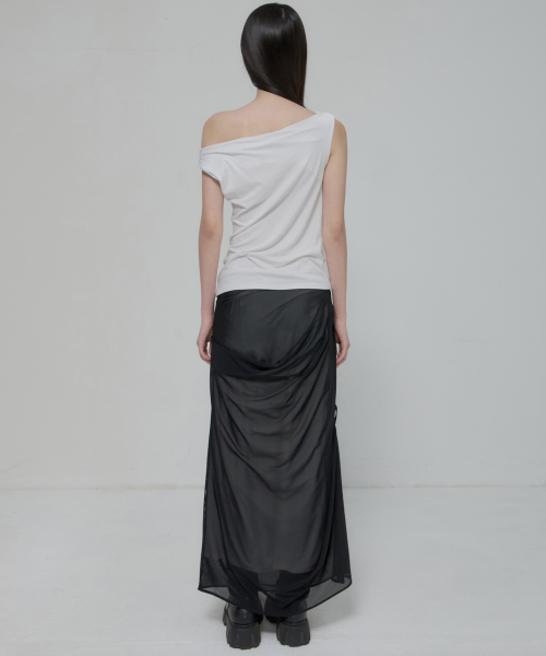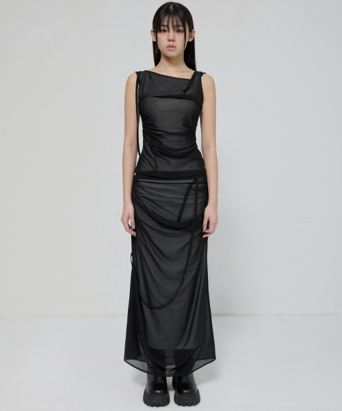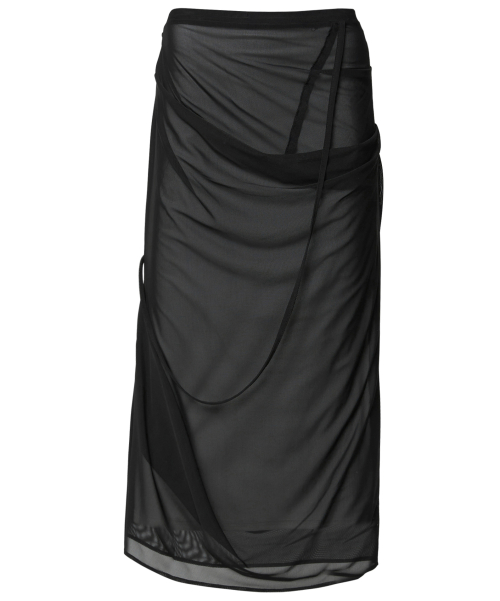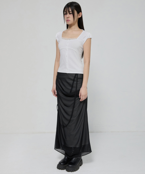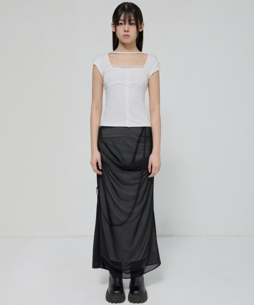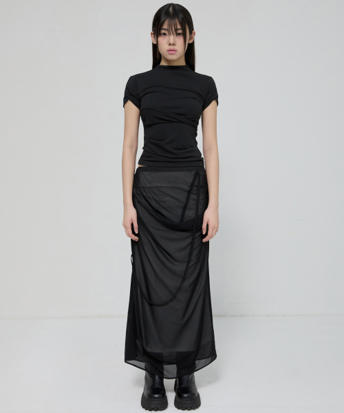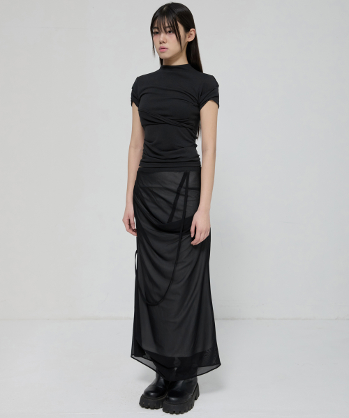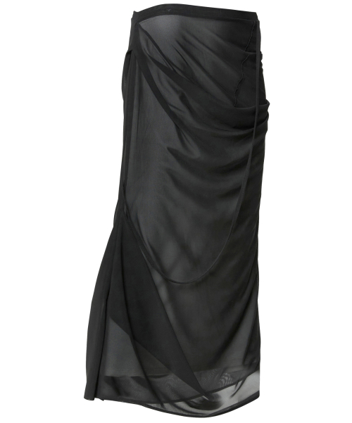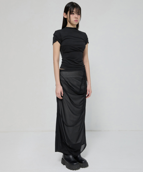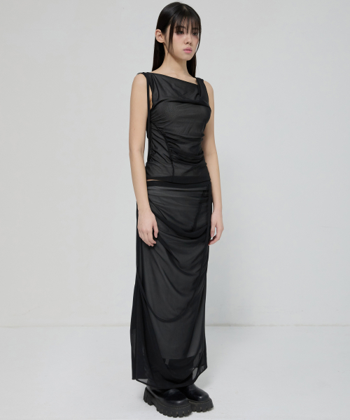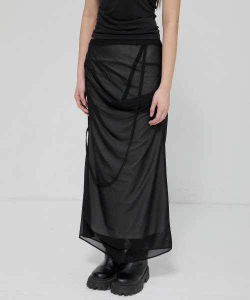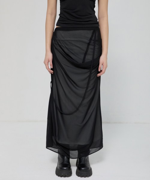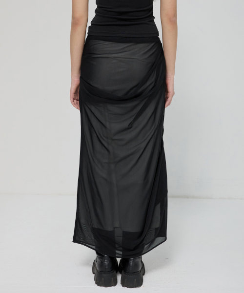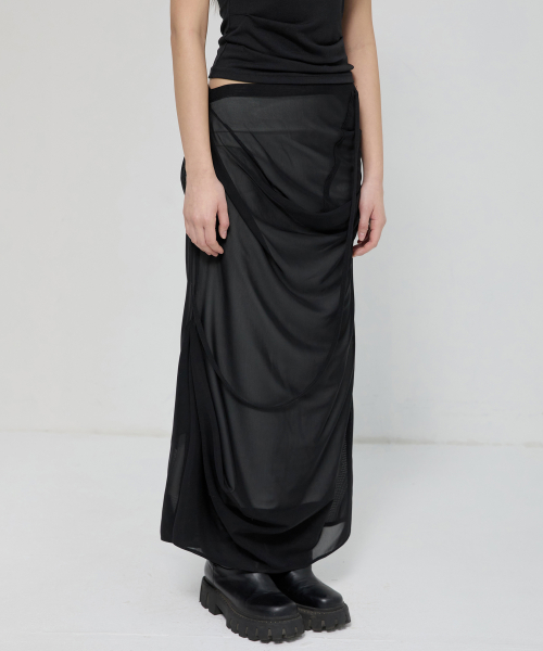 Draped Mesh Layered Long Skirt (FL-264_Black)
