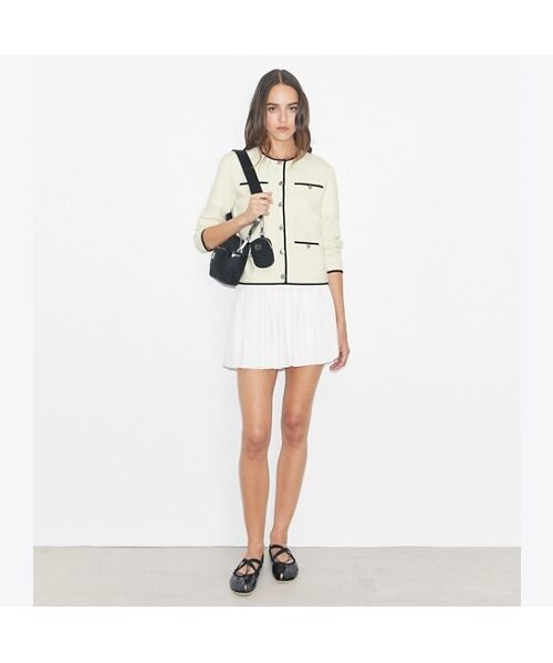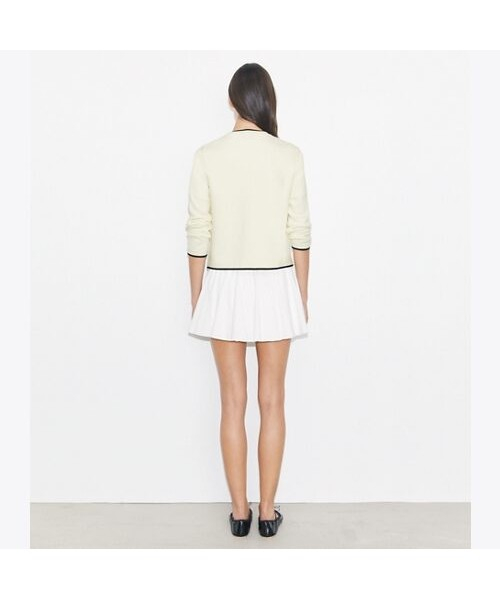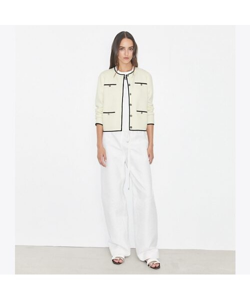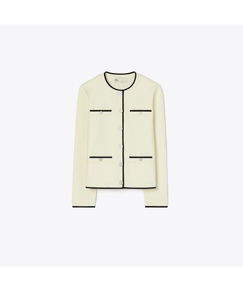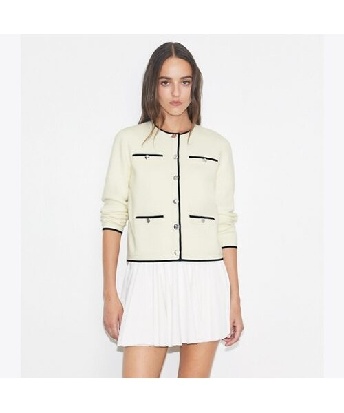 토리버치의 시그니처 아이템인 켄드라 카디건이 더욱 업그레이드되었습니다. 소매 끝과 넥라인, 포켓 라인을 따라 들어간 클래식한 배색 컬러의 조합이 고급스러움을 더합니다. 토리버치의 시그니처인 T 로고가 들어간 실버 버튼이 화려함을 더합니다.