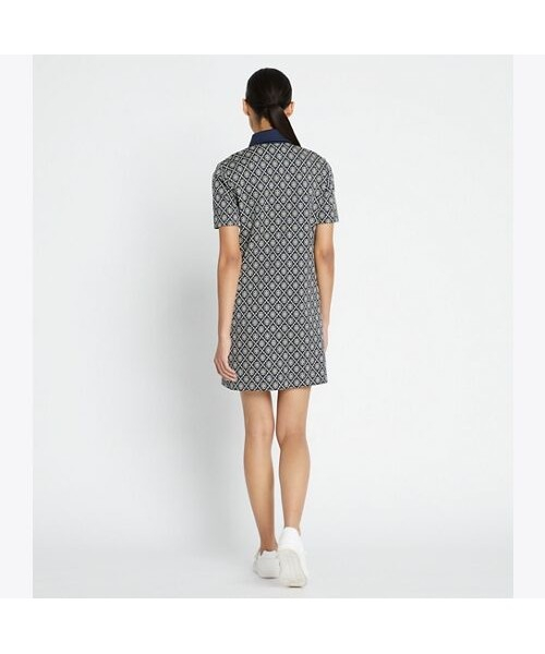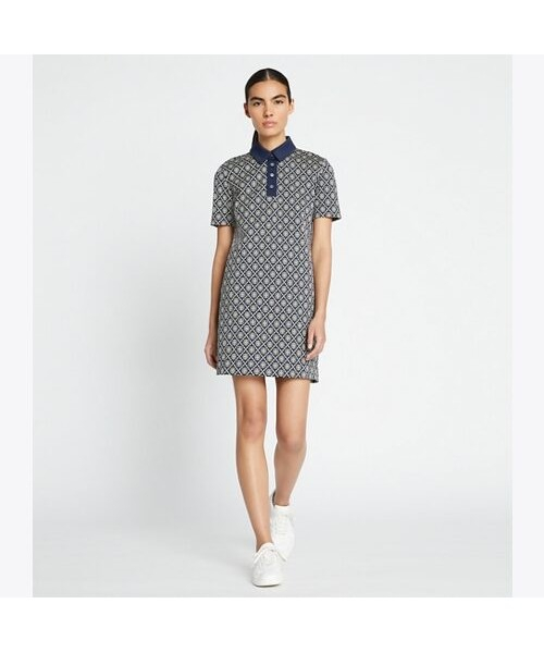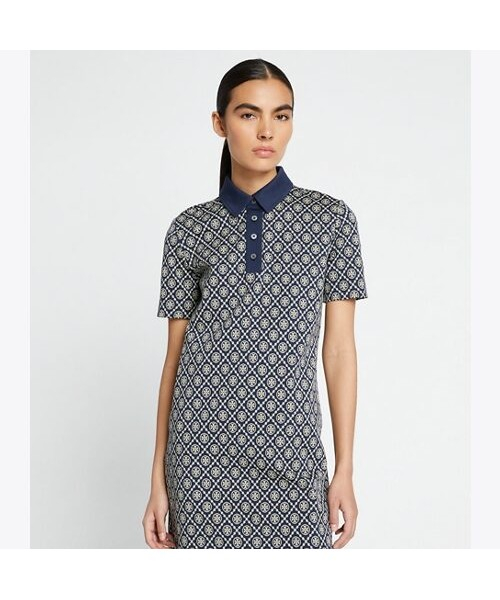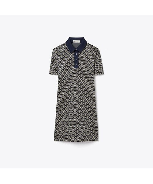 토리버치의 시그니처 패턴인 티 모노그램 패턴이 돋보이는 반팔 폴로 드레스입니다. 무릎 위 기장으로 발랄한 느낌을 더해주며, 나일론 소재로 제작되어 가벼운 착용감으로 여름 드레스로 입기 좋은 아이템입니다.