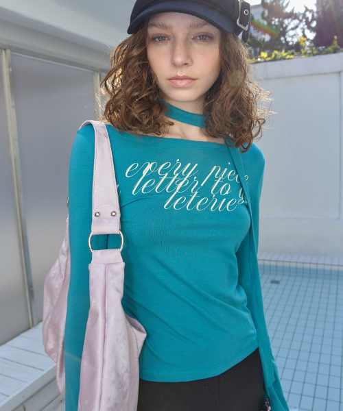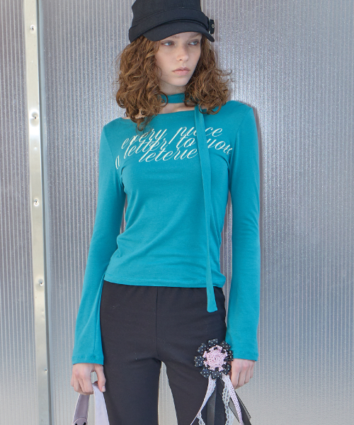 LETTERING OFF-SHOULDER TIE LONG SLEEVE_BLUE GREEN