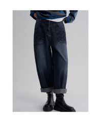9부 워싱 데님 팬츠 네이비