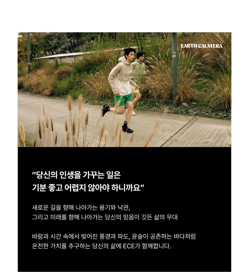 얼스캄에라(EARTH CALM ERA)는 삶을 즐기고 가꾸는 긍정적 에너지를 담아 편안한 기능성 소재와 베이직한 디자인, 합리적인 가격으로 일상과 스포츠의 균형을 제안하는 도심형 스포츠웨어 브랜드입니다.