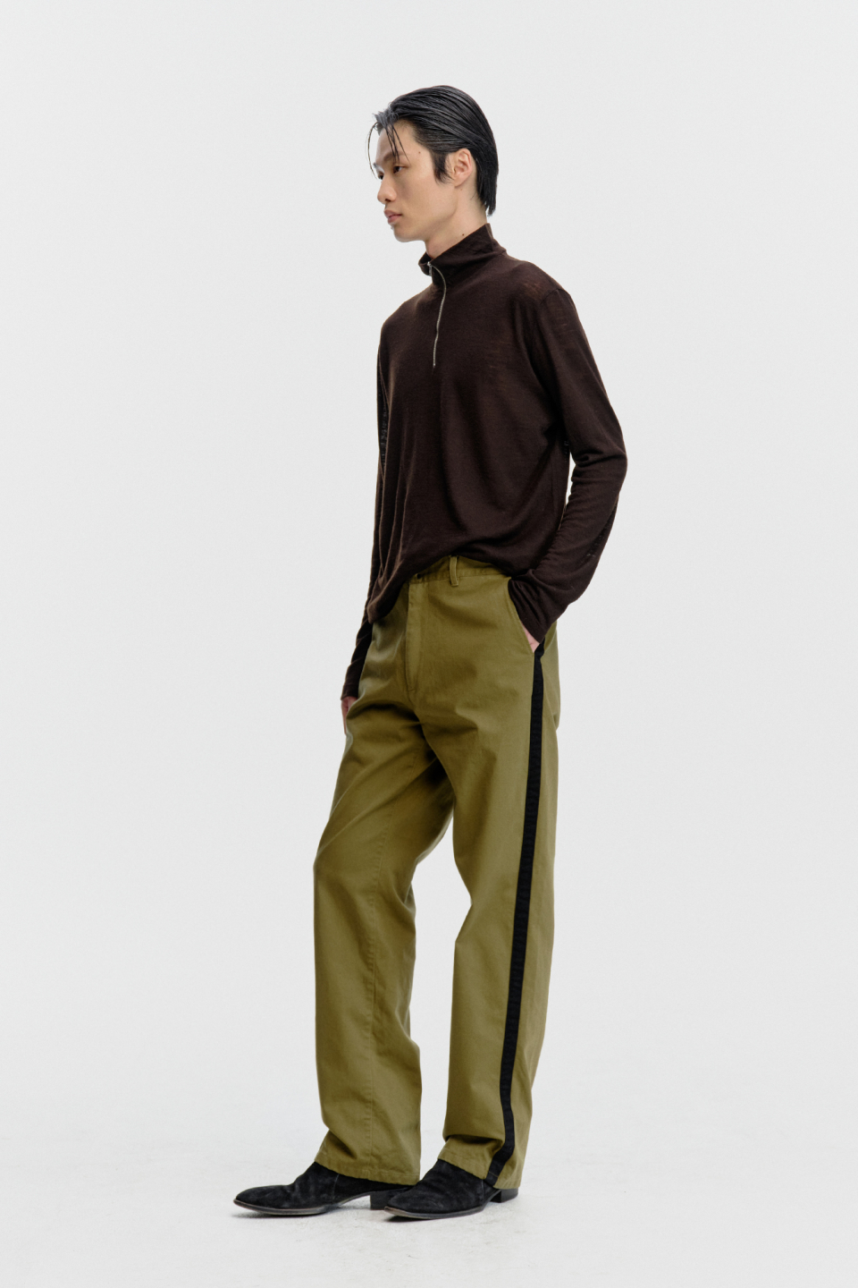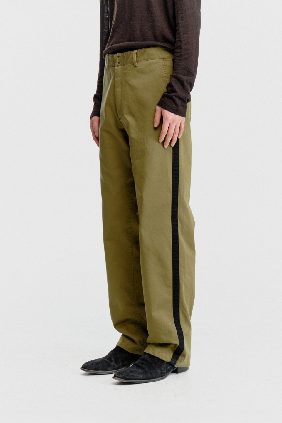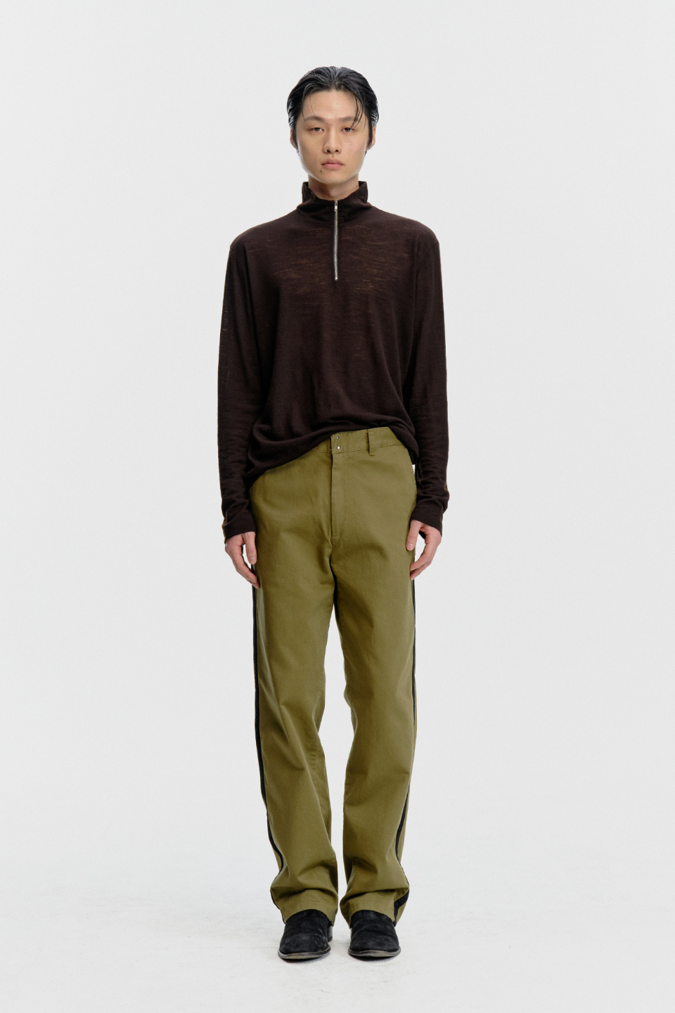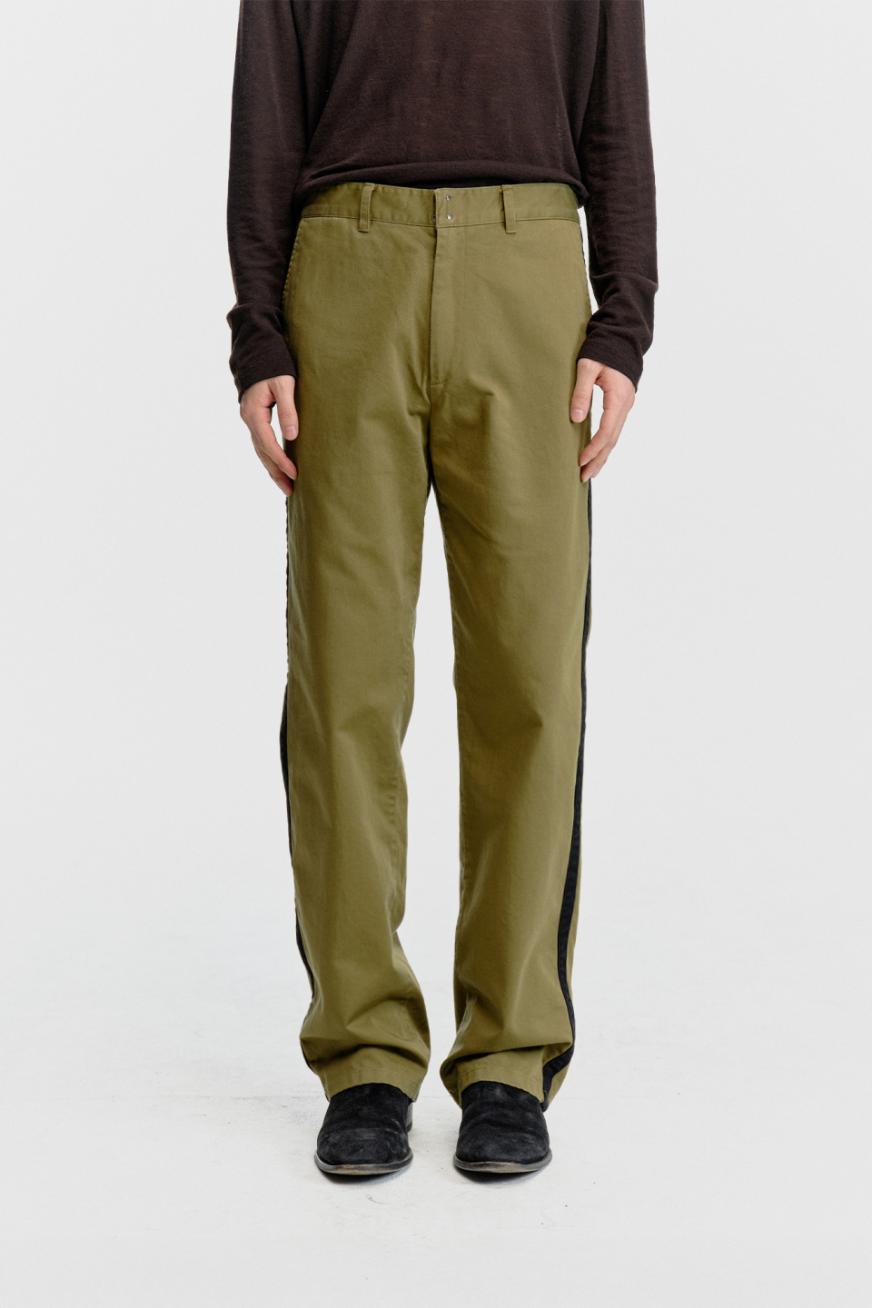 스트레이트 핏으로 제작되어 안정감 있게 떨어지며, 옆선을 따라 이어지는 사이드 테이프 디테일이 있습니다.