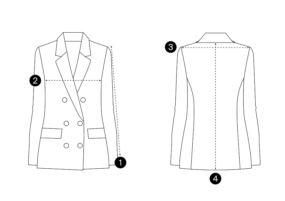 1 소매길이 소매가 시작되는 어깨선에서 소매 아래까지 측정합니다. 2 가슴 암홀 높이에서 한쪽 끝부터 다른 쪽 끝까지 측정합니다. 3 어깨 너비 의류의 어깨 왼쪽 상단부에서 오른쪽 상단부까지의 치수 4 길이 의류의 최상단에서 하단까지 측정합니다. |
