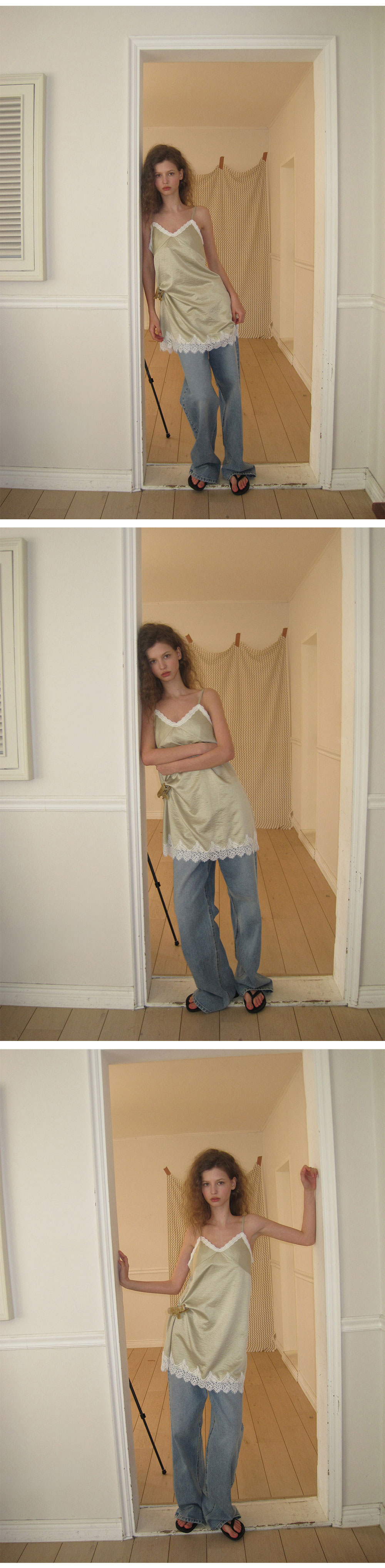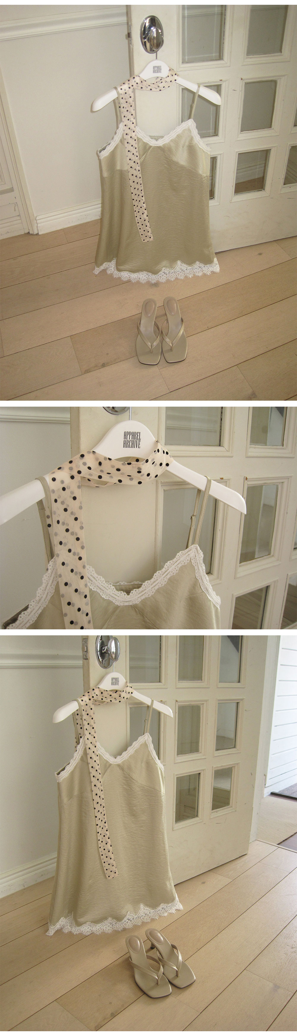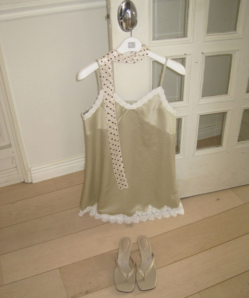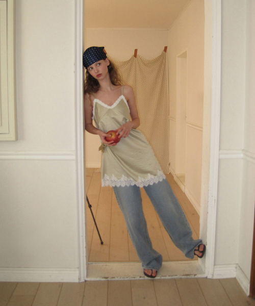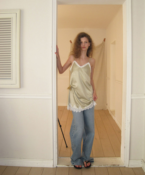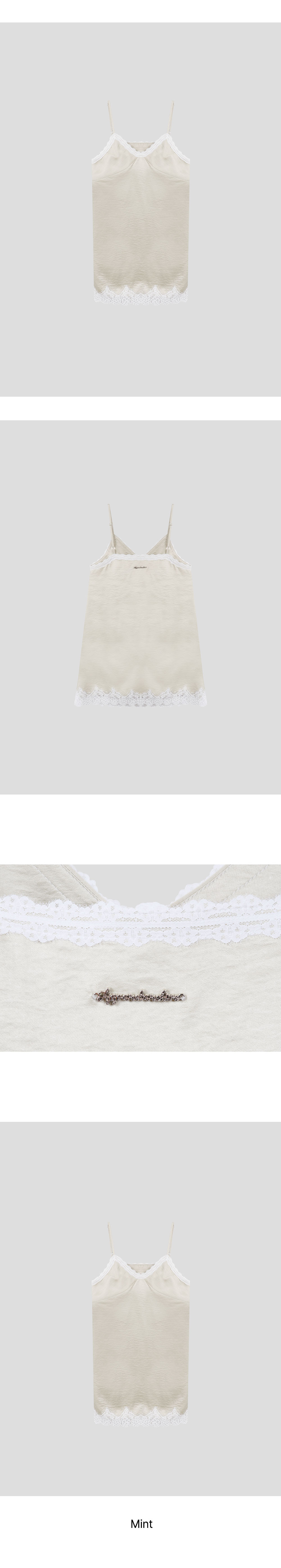 - 넥 라인과 밑단에 더해진 레이스 디테일로 페미닌한 포인트