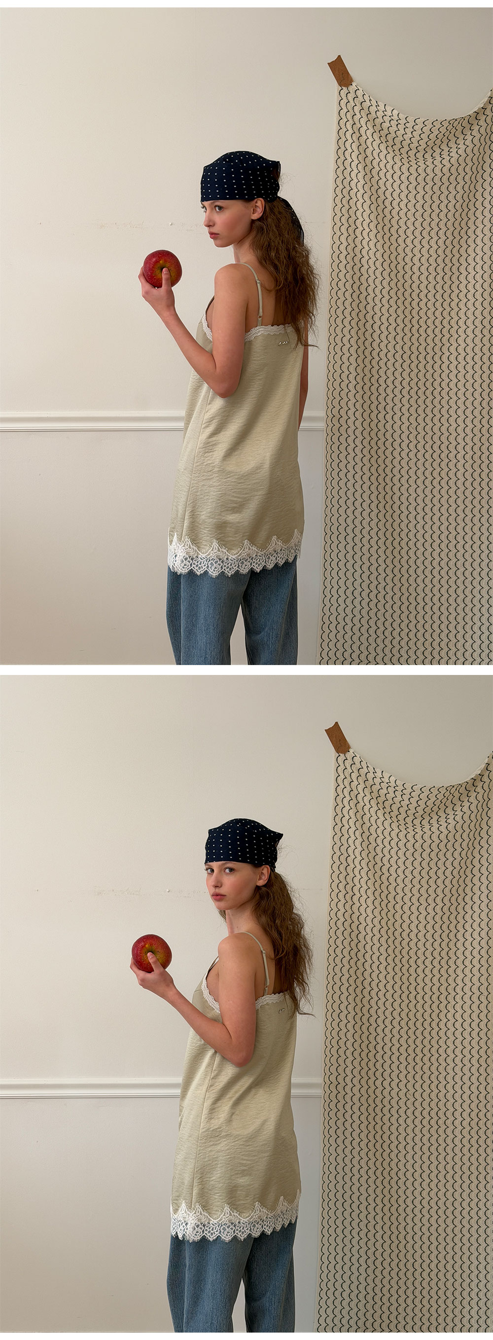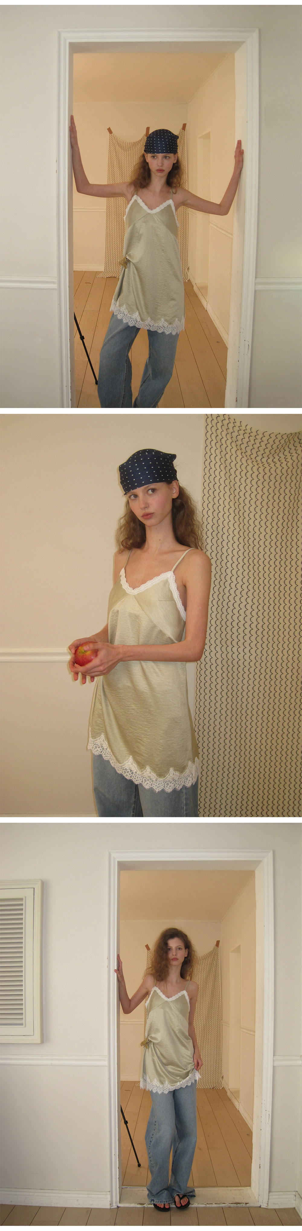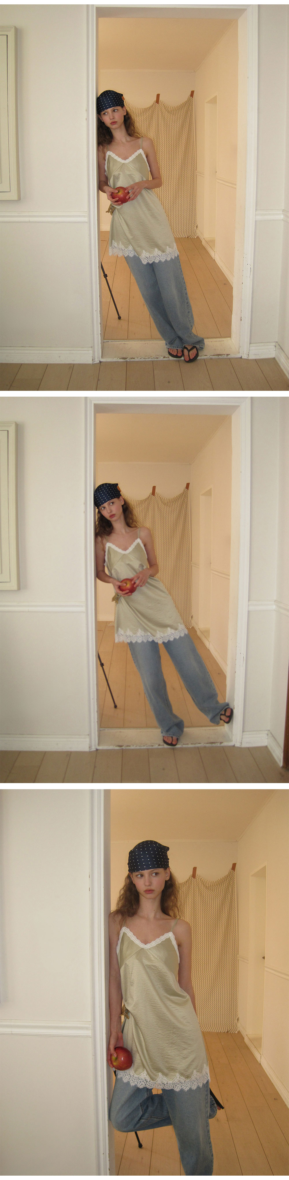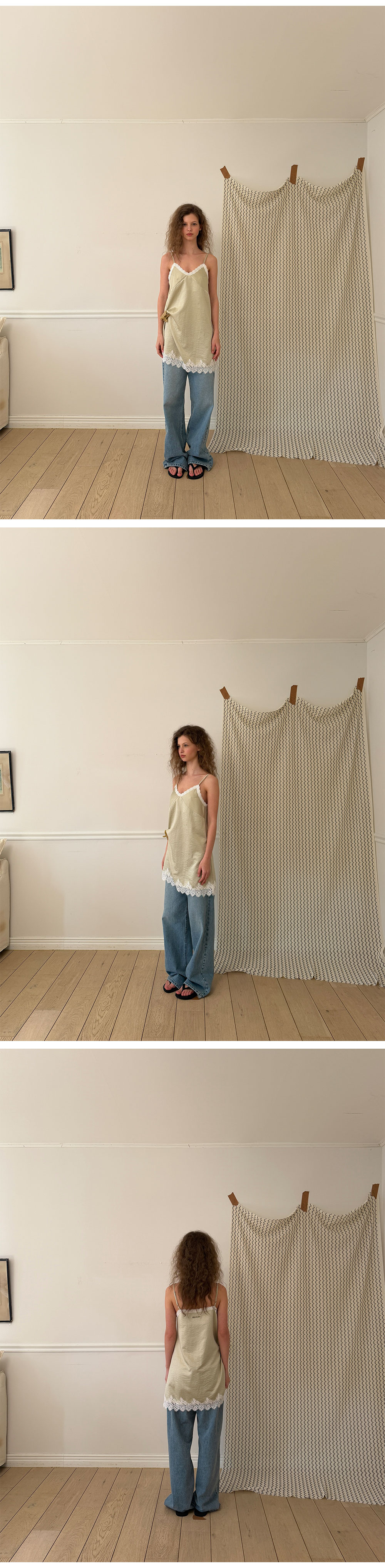 - 넥 라인과 밑단에 더해진 레이스 디테일로 페미닌한 포인트