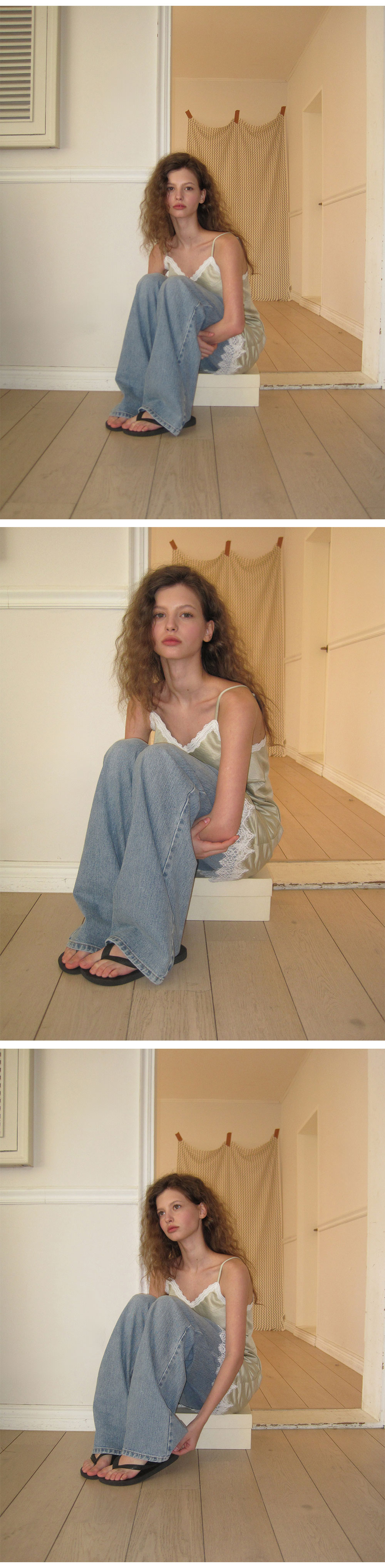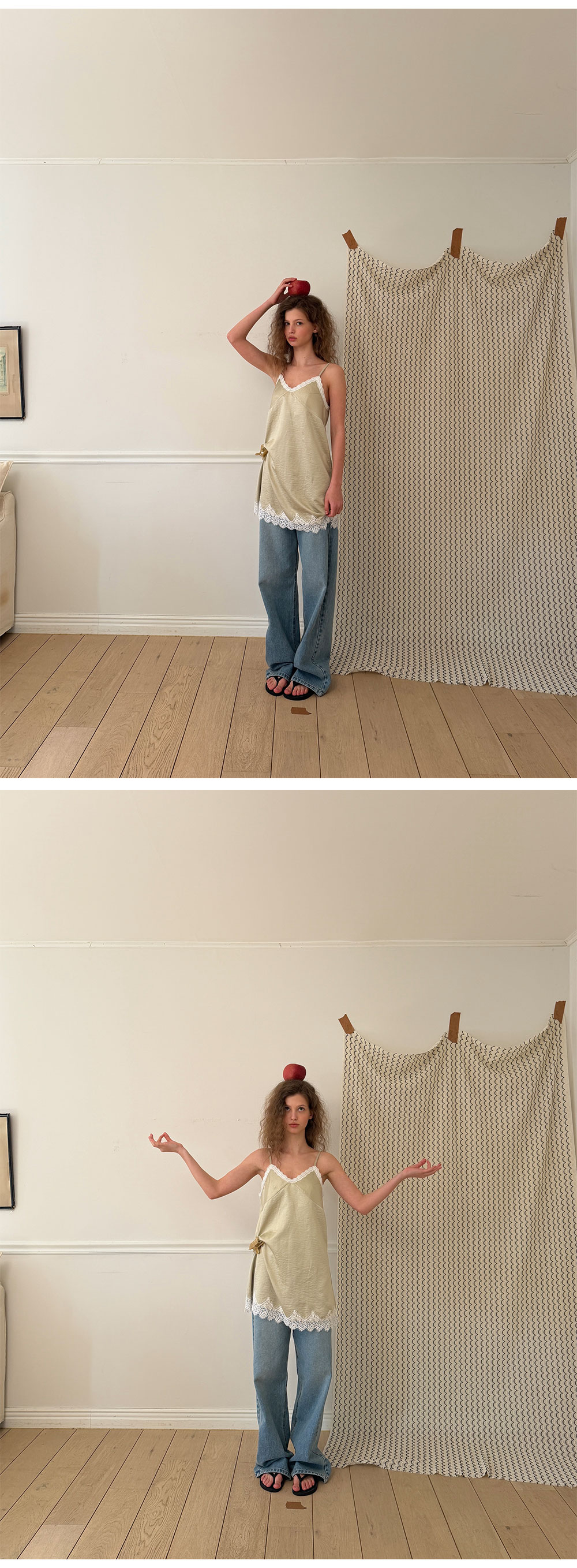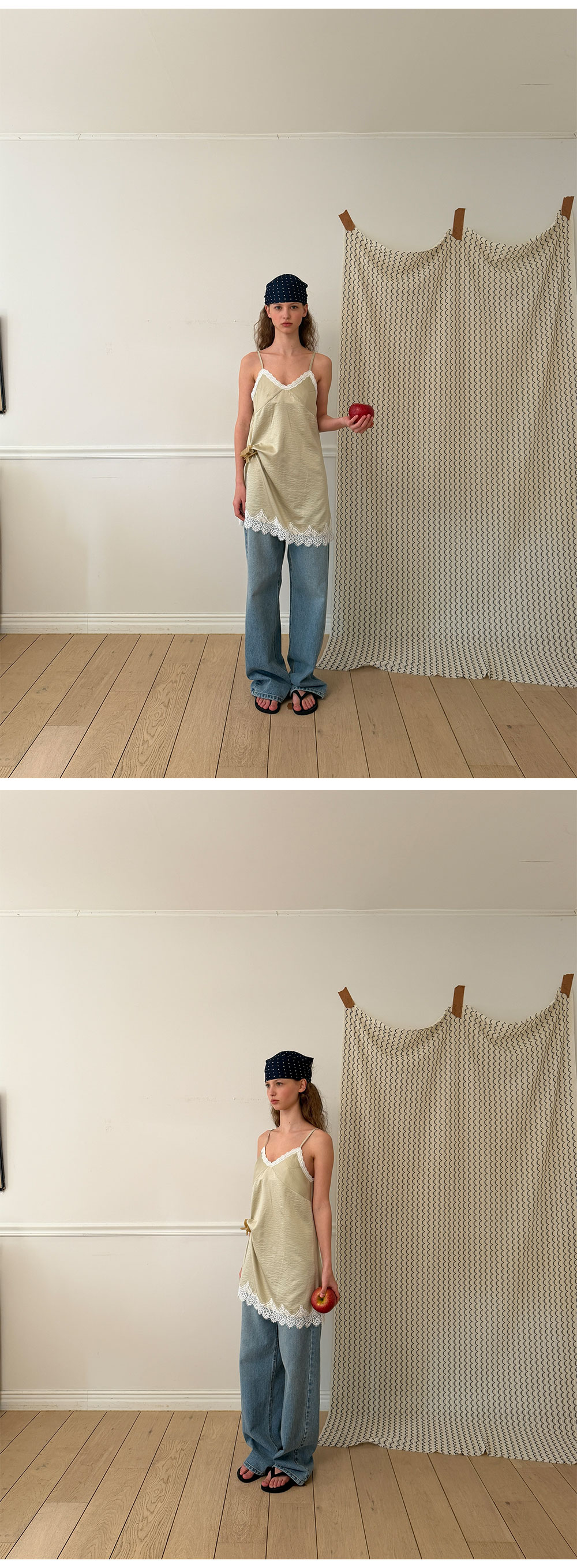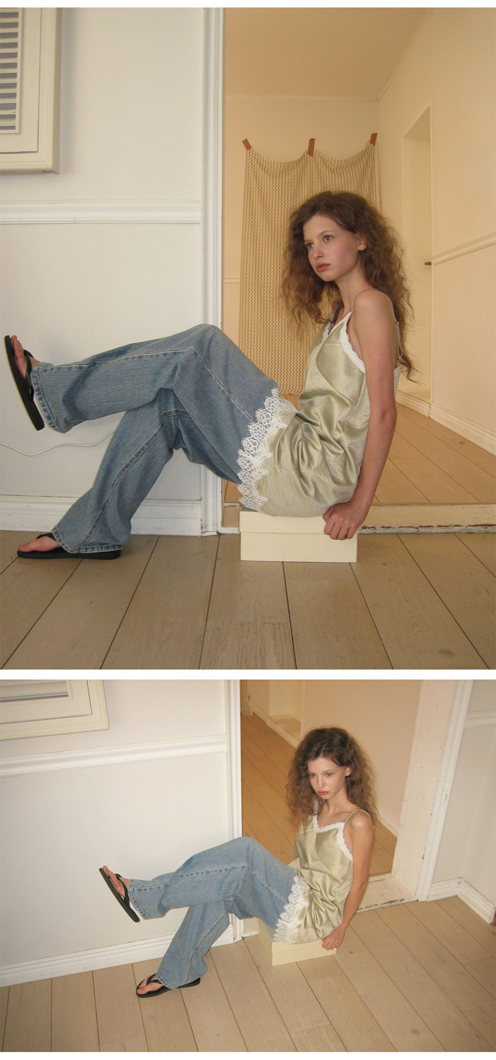- 넥 라인과 밑단에 더해진 레이스 디테일로 페미닌한 포인트