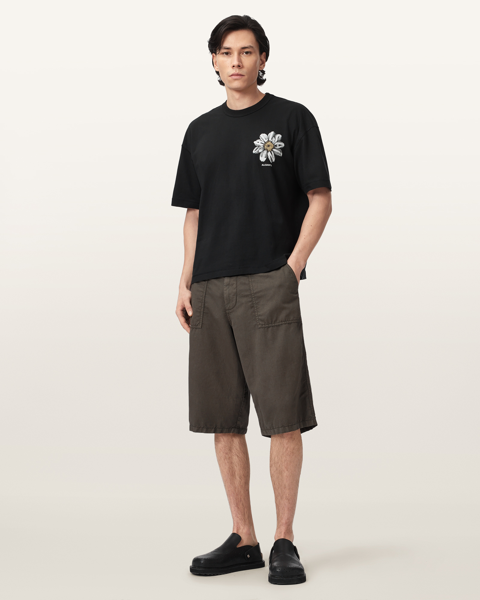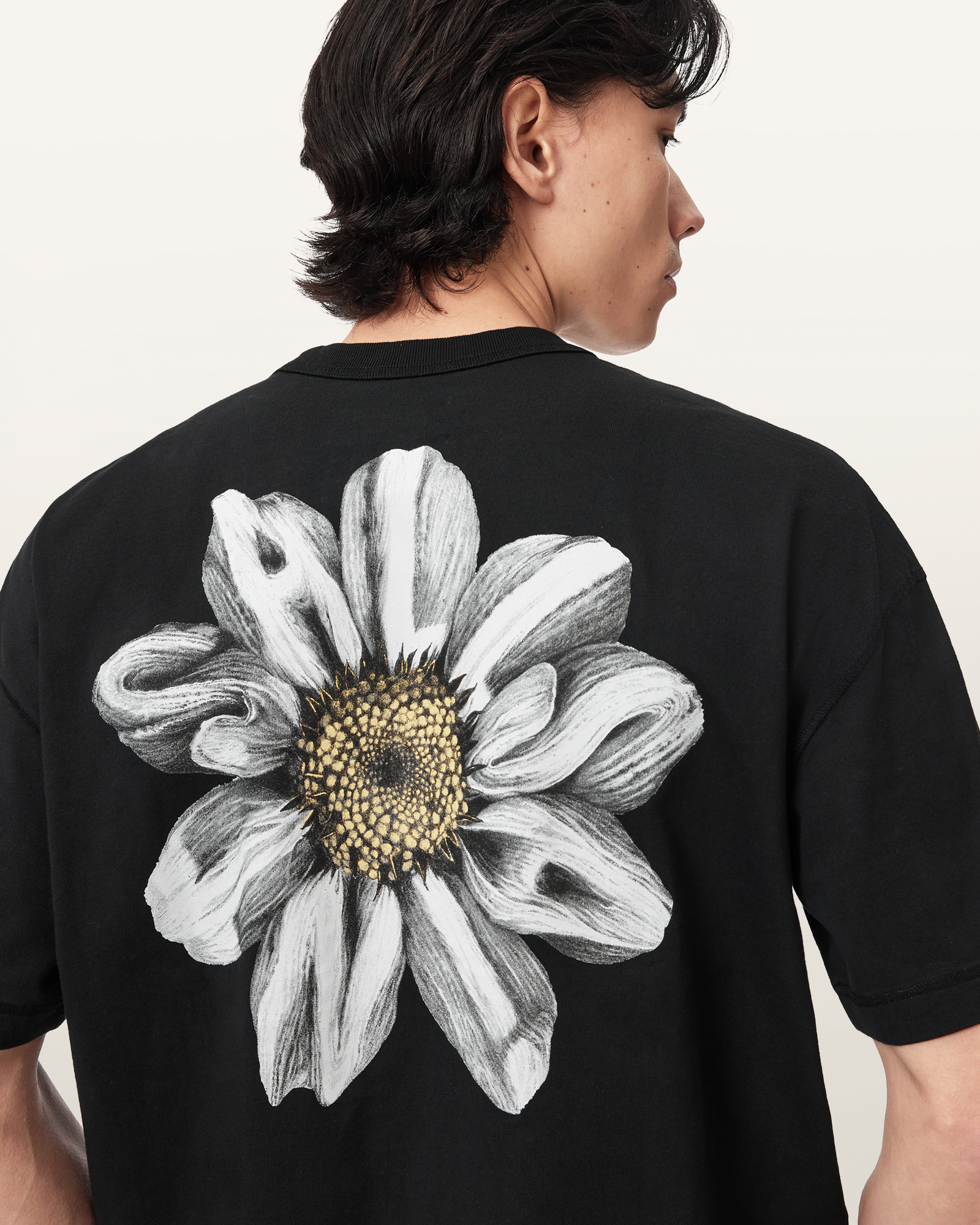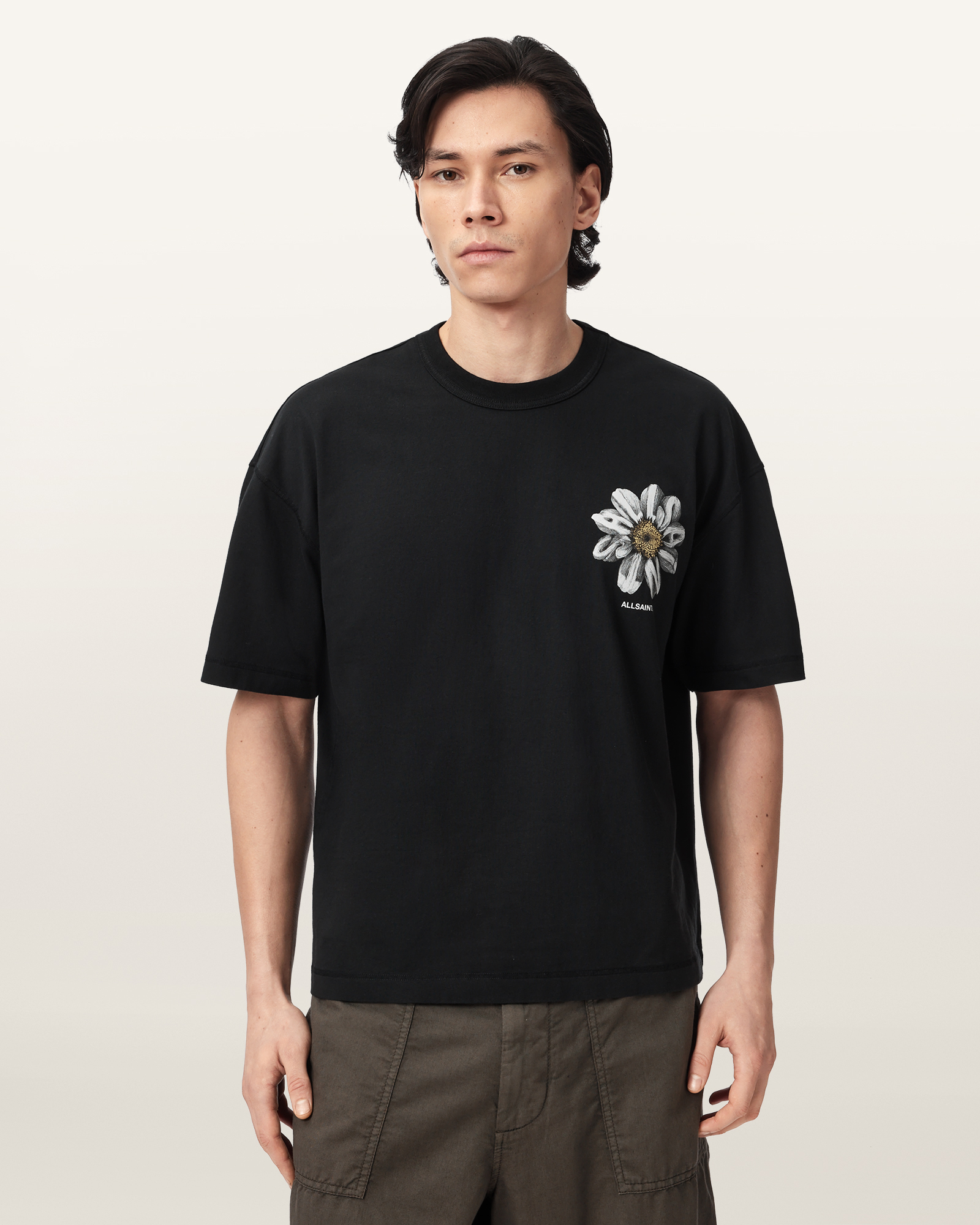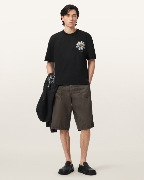 면 소재로 제작되었으며, 여유로운 실루엣이 특징입니다. 반문화적 감성에서 영감을 받아 ALLSAINTS 로고와 식물 모티브를 핸드 드로잉 록 페스티벌 그래픽에 담아내어, 반항적인 무드와 빈티지 감성을 동시에 표현한 아이템입니다.