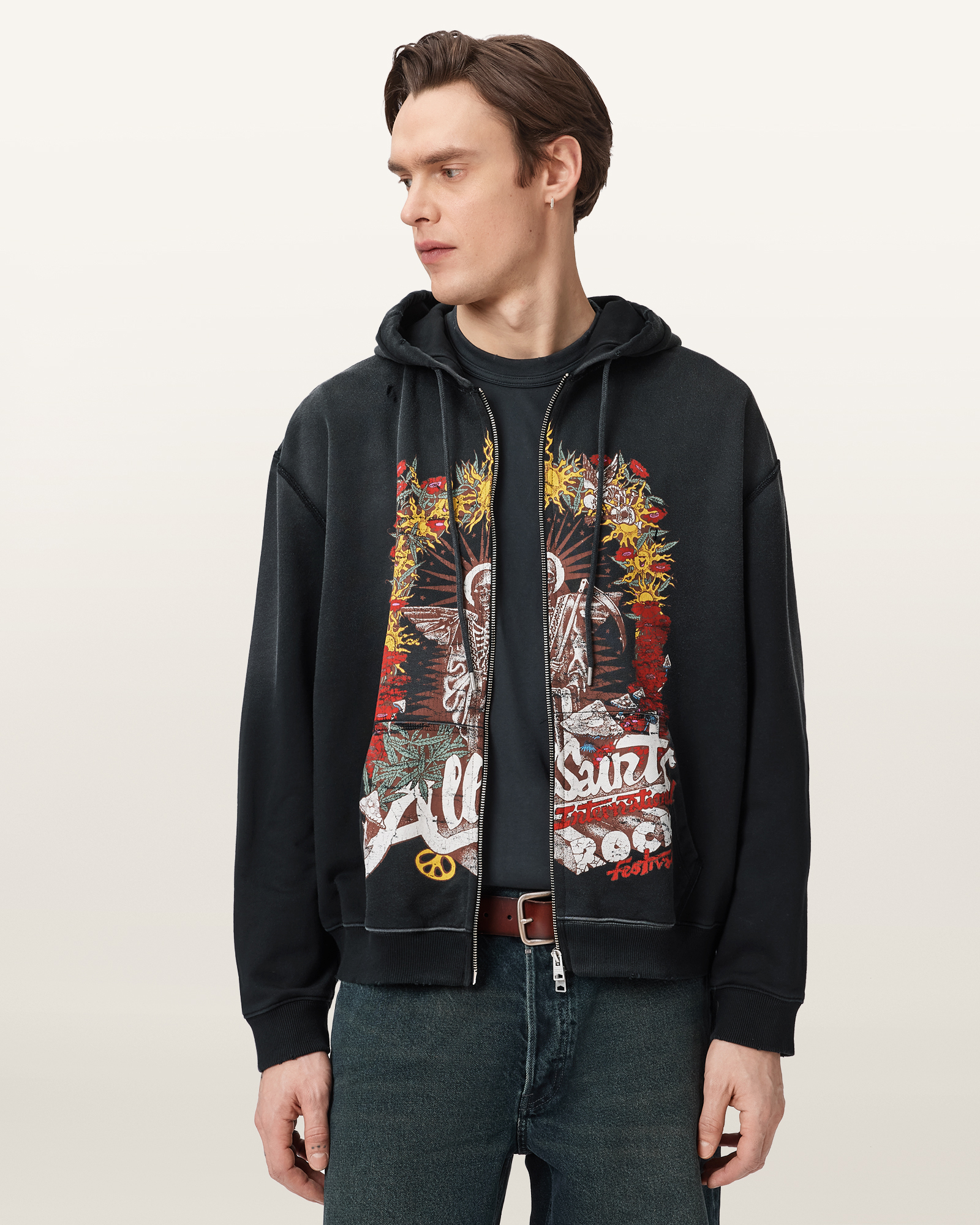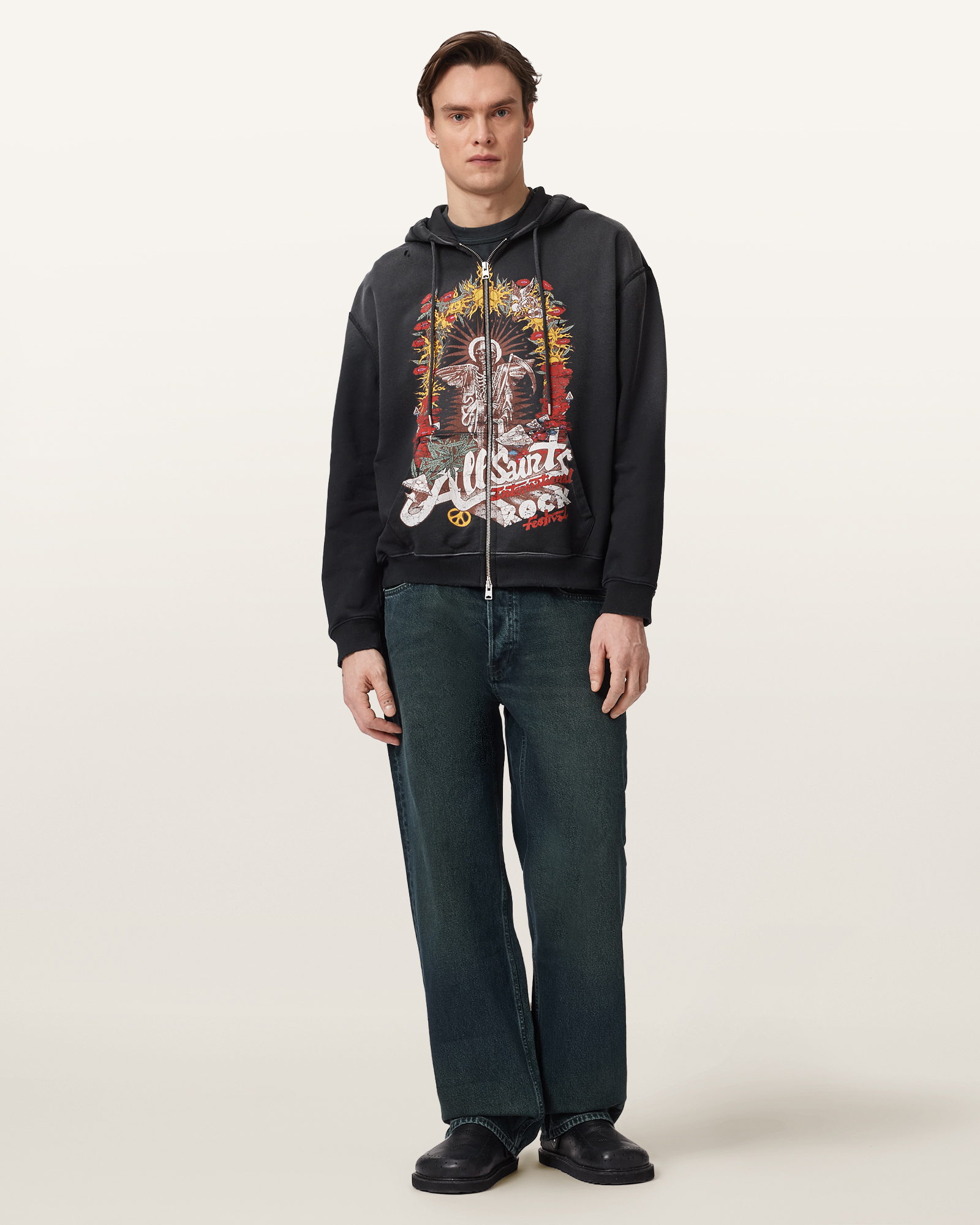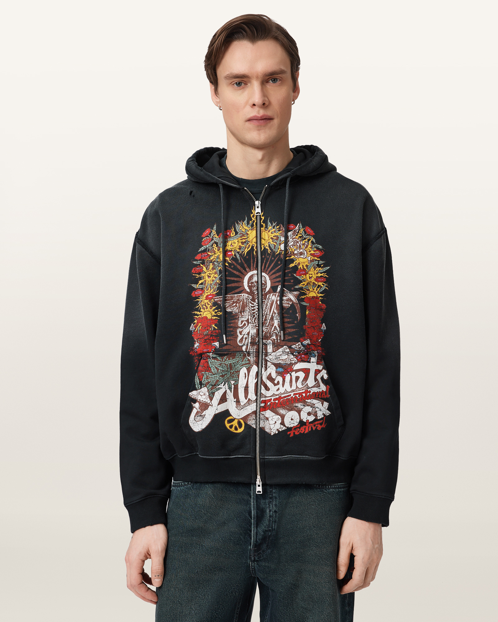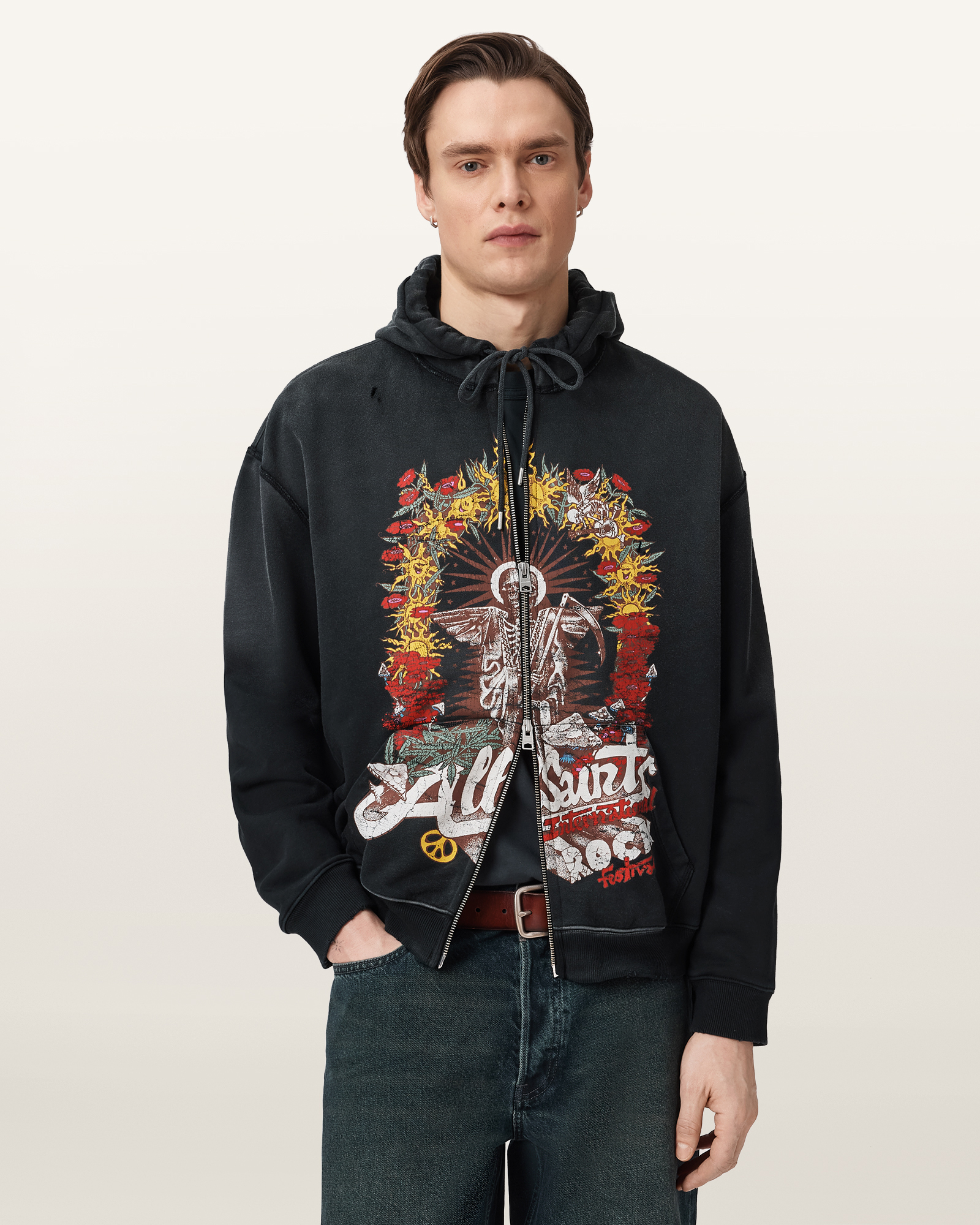 면 소재로 제작되었으며, 앞뒤에 더해진 핸드 드로잉 그래픽이 반문화적 감성을 표현합니다. 엣지 부분의 디스트레스 디테일이 더해져 ALLSAINTS 특유의 반항적인 무드를 완성합니다.