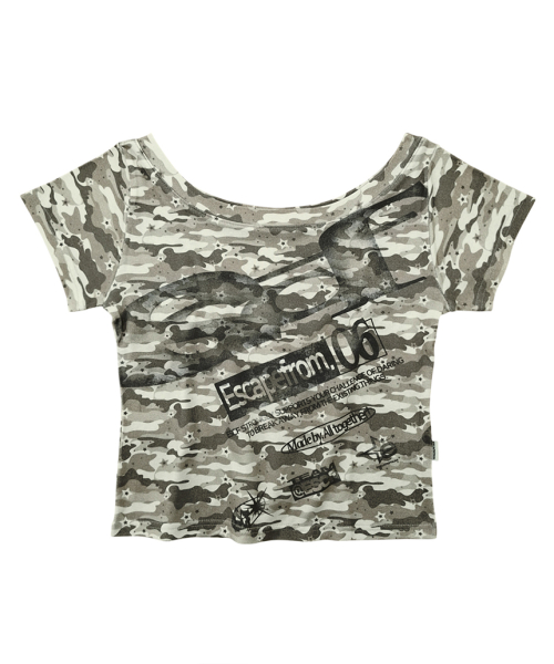 스타 카모 틸티드 ESCF 로고 콜라주 풀프린트 원숄더 반팔 티셔츠 그레이