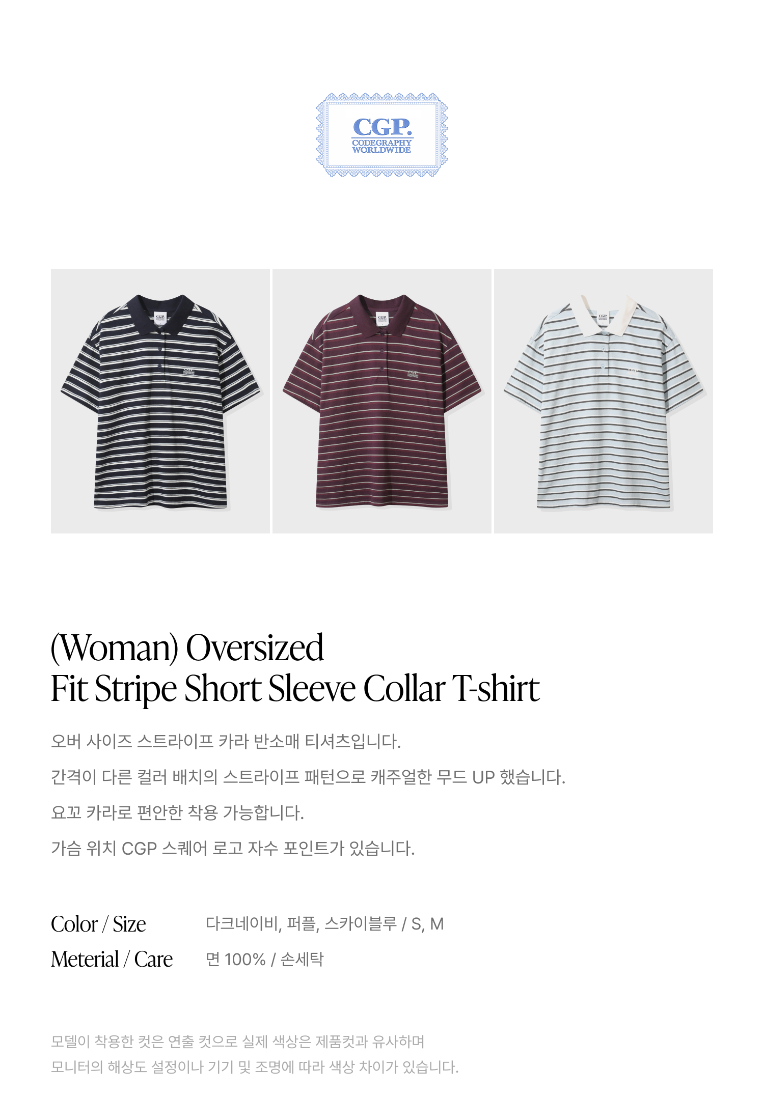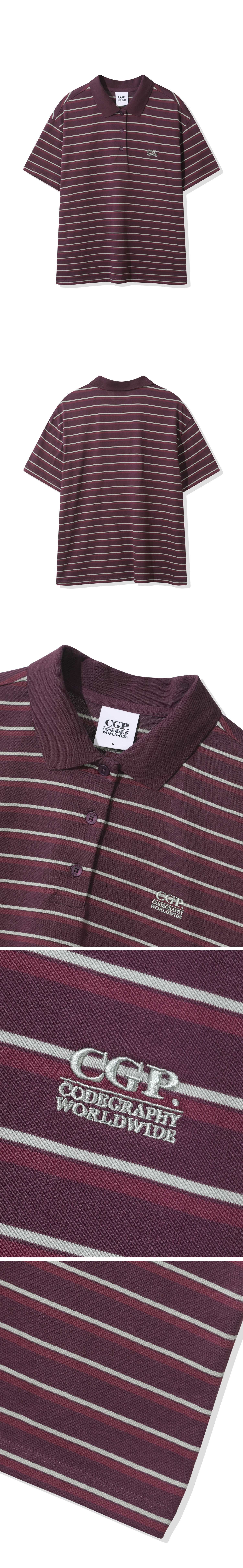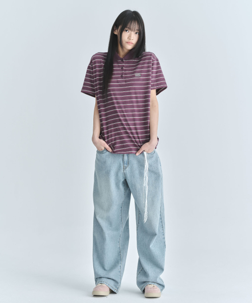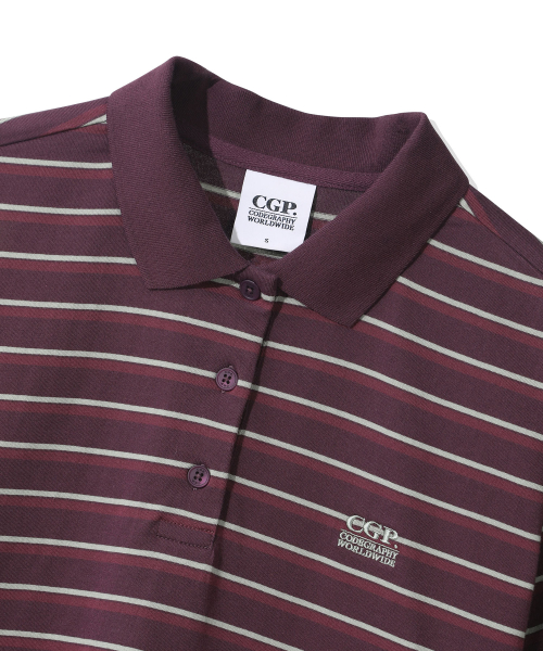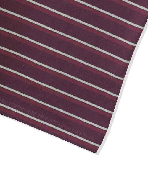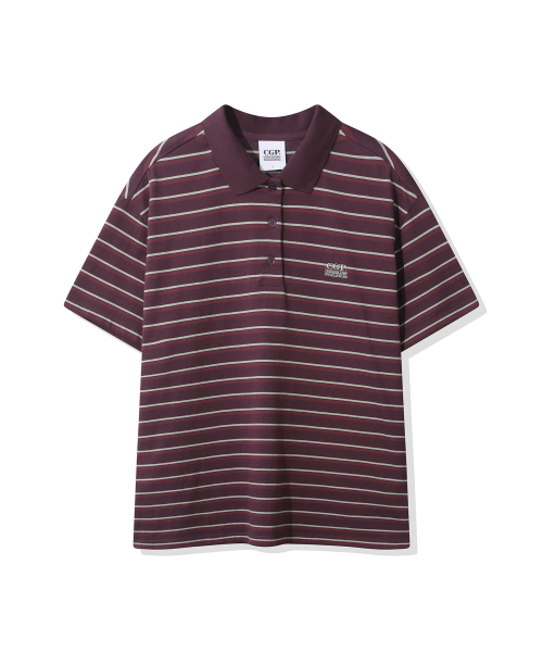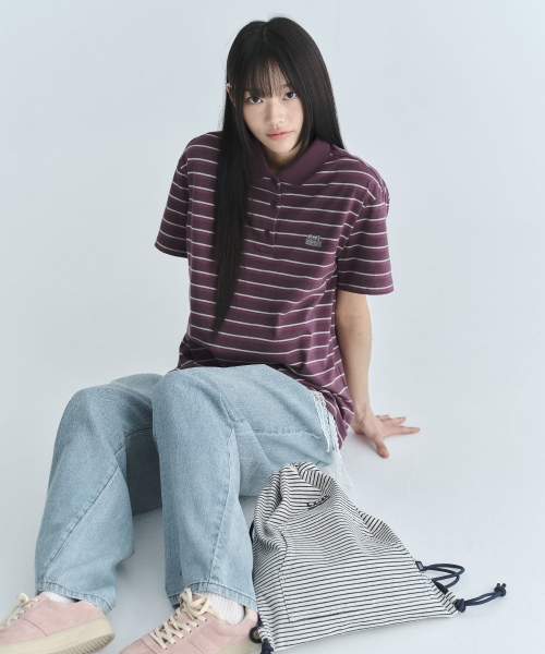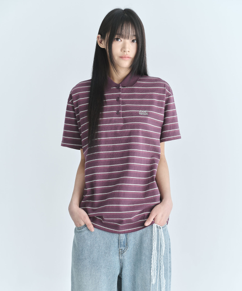 (우먼) 오버핏 스트라이프 반소매 카라 티셔츠-퍼플