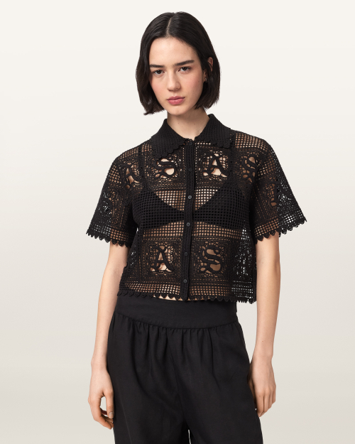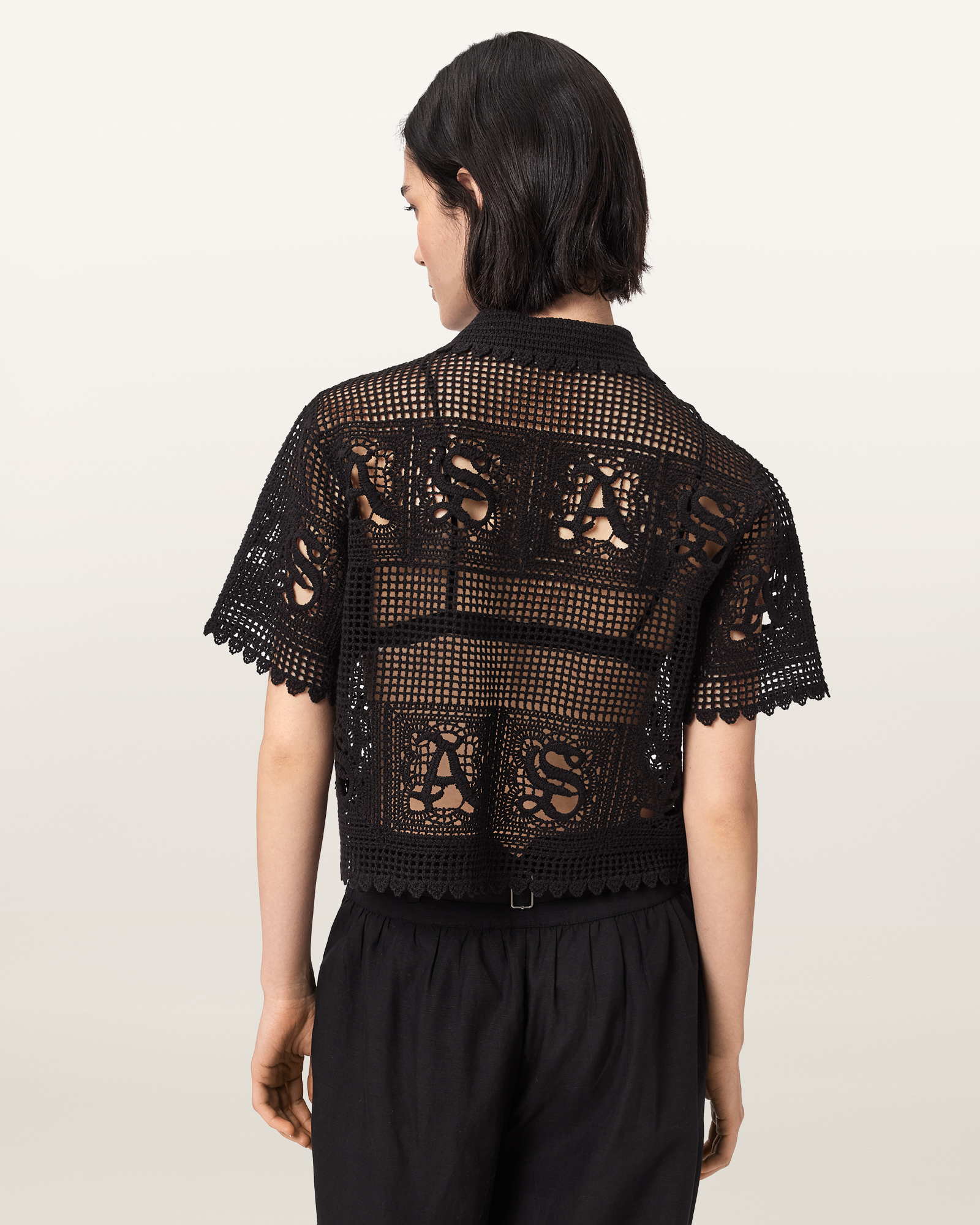 면 소재로 제작되었으며, 크로셰 니팅 기법을 통해 올세인츠 특유의 보헤미안 감성과 록 시크 무드를 감각적으로 표현한 아이템입니다.