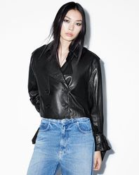 부드러운 양가죽 소재로 제작되어 고급스러운 질감을 선사합니다. 가슴과 소매에 볼륨감을 더한 실루엣과 허리 부분의 탄탄한 밴딩이 대비를 이루며, 슬림한 허리 라인을 강조해 세련되면서도 여성스러운 무드를 완성합니다.