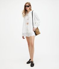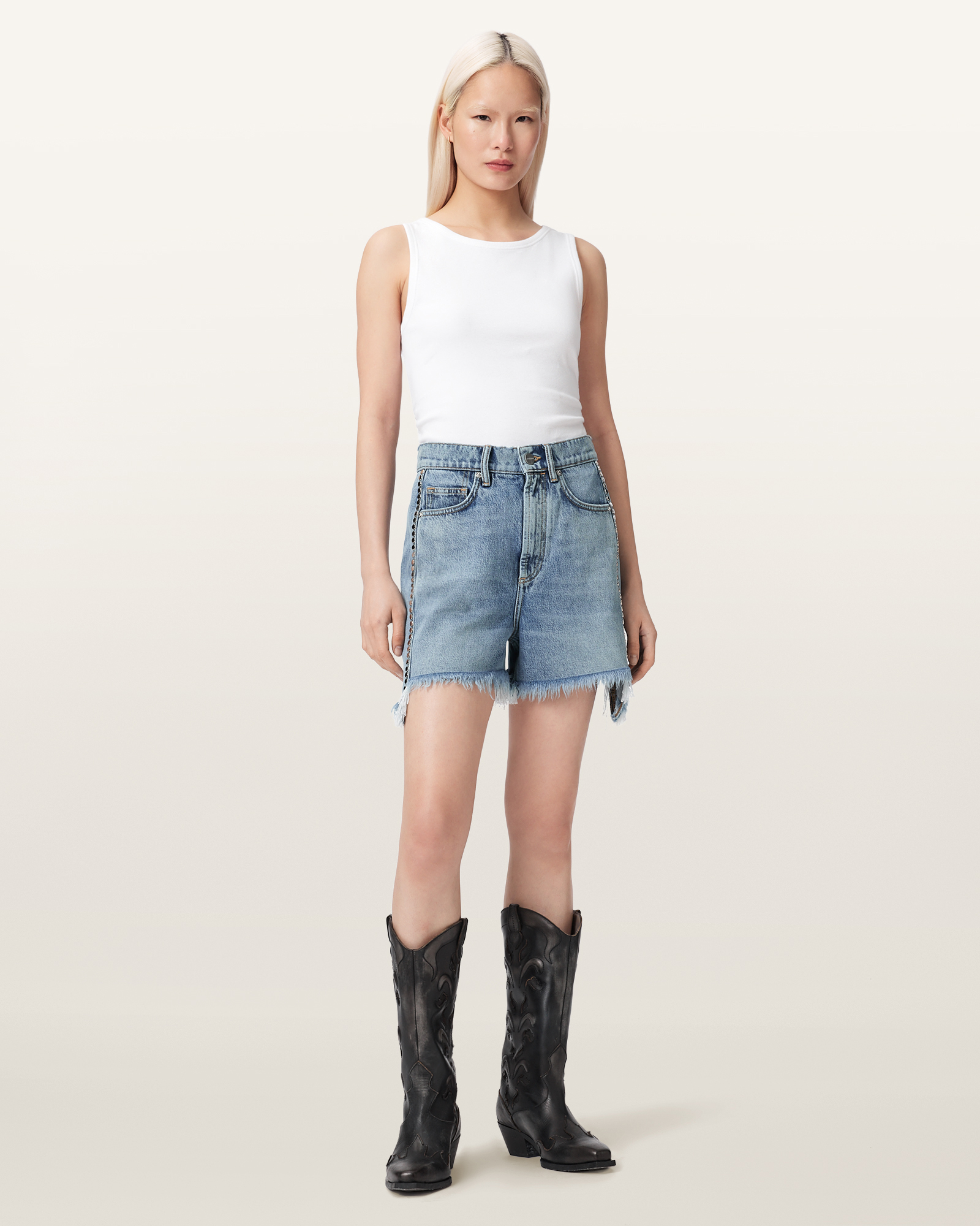여름 시즌에 어울리는 페스티벌 무드를 더해주는 아이템입니다. 사이드 심 라인을 따라 더해진 스터드 디테일과 내추럴한 컷오프 밑단이 특징이며, 앵클 부츠나 니하이 레더 부츠와 매치해 스타일리시한 룩을 완성할 수 있습니다.