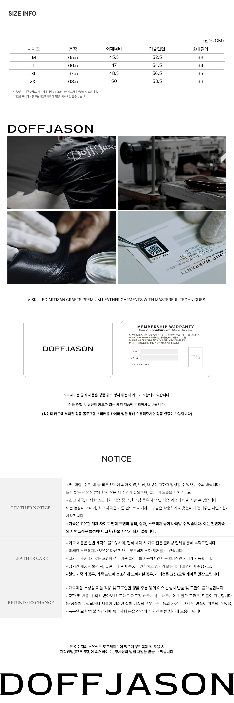 도프제이슨(DOFFJASON)은 가죽이라는 소재에 대한 이해를 기반으로 레더 가먼츠를 중심으로 디자인하는 브랜드입니다. 스타일에 구애받지 않고 오래 입을수록 가치를 더하는 타임리스 디자인을 추구하고, 절제된 디테일과 뛰어난 퀄리티의 아이템을 선보입니다.