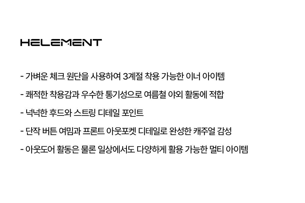 힐리먼트(HELEMENT)는 HEALING과 MOMENT의 합성어로 자연과 지속 가능성에 대한 의지를 뜻합니다. 환경을 사랑하고 후손에게 깨끗하고 아름다운 자연을 전해주기 위한 하나의 철학과 행동입니다. 자연 안에서, 자연과 함께 건강한 삶을 지향하고 힐링 하는 모든 순간 순간을 담아 지속가능한 삶을 위해 실천하고 향유하는 브랜드입니다.