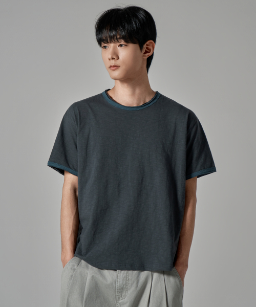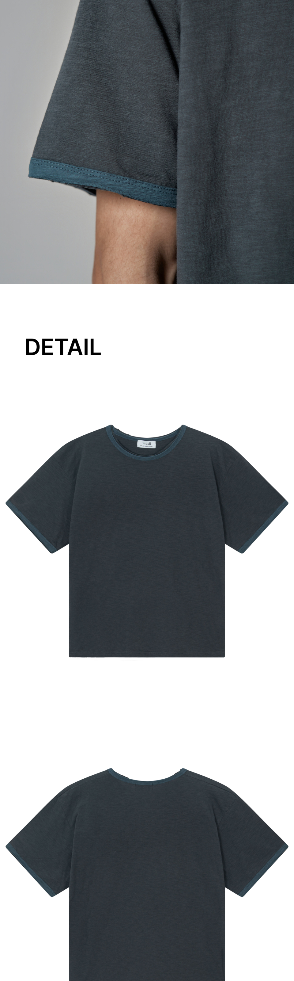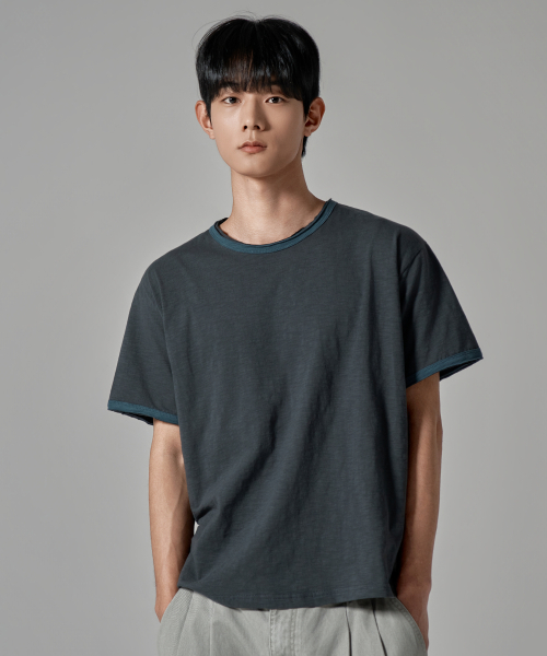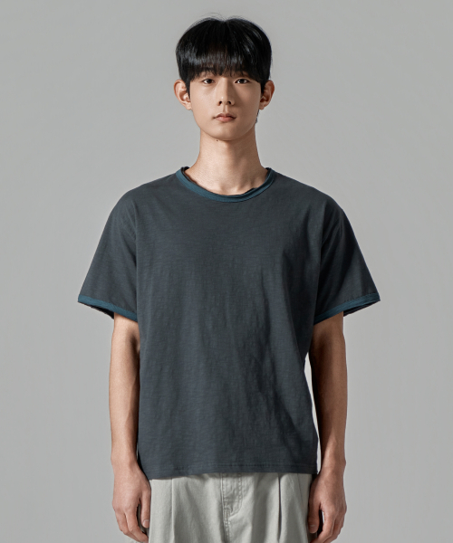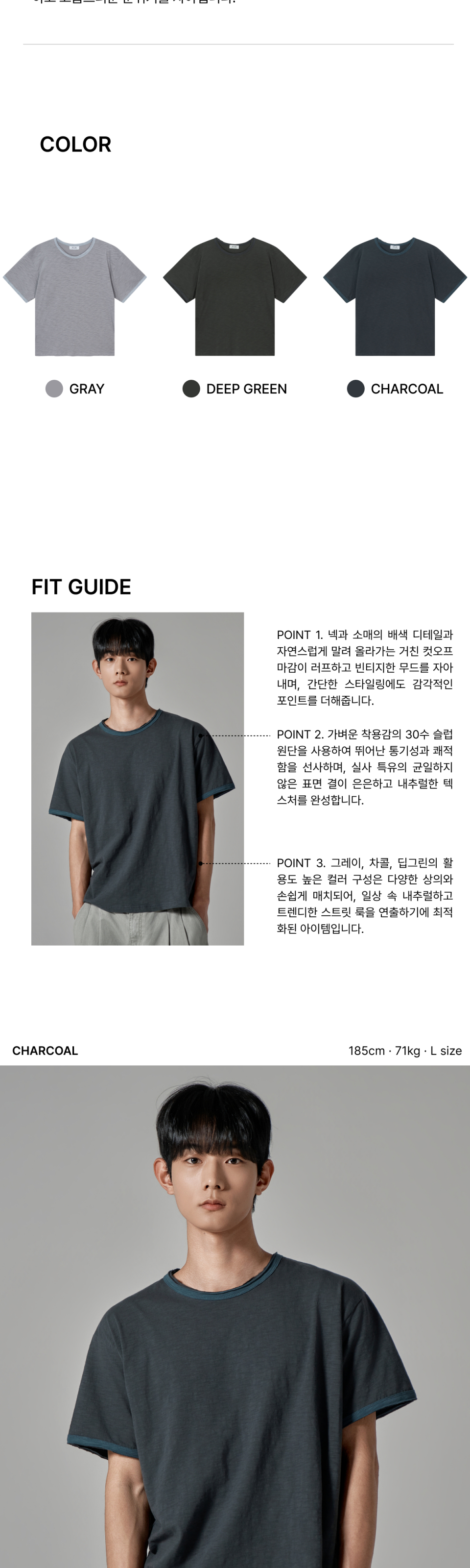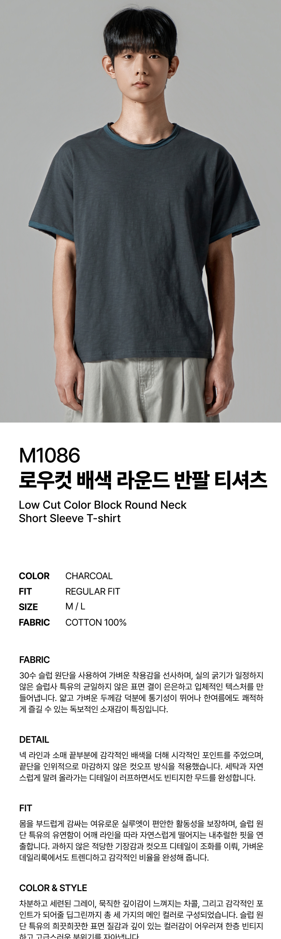 M1086 로우컷 배색 라운드 반팔 티셔츠_차콜