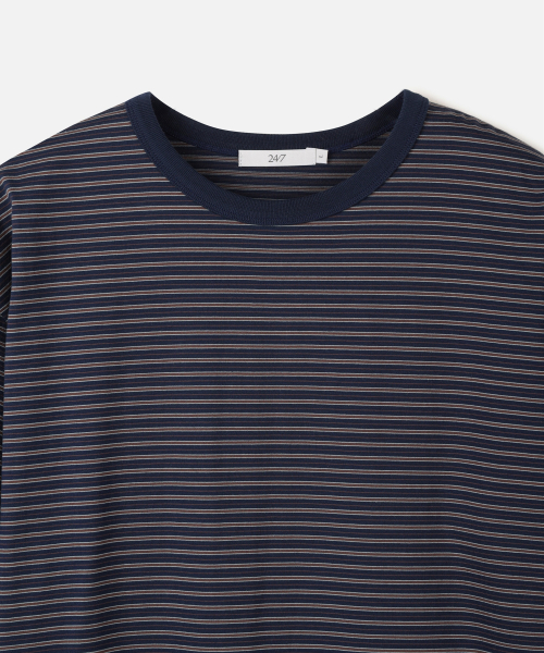 A : 24/7에서 직접 설계하고 개발한 독자적인 컬러 조합의 멀티 스트라이프입니다. 흔하지 않은 컬러 밸런스와 세밀하게 조율된 패턴 간격 덕분에, 단품 착용만으로도 충분히 감각적이고 차별화된 인상을 연출할 수 있습니다.