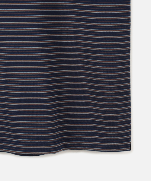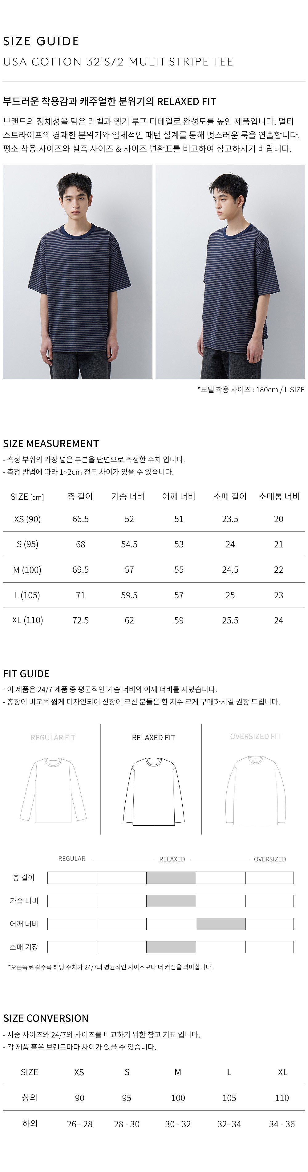 멀티 스트라이프 패턴을 중심으로 단정하면서도 캐주얼한 분위기를 동시에 느끼실 수 있습니다. 기본 티셔츠 실루엣을 기반으로 하되 패턴이 자연스럽게 드러날 수 있도록 전체적인 비율을 조율했으며, 다양한 스타일링에도 안정적으로 어우러지도록 구성했습니다.